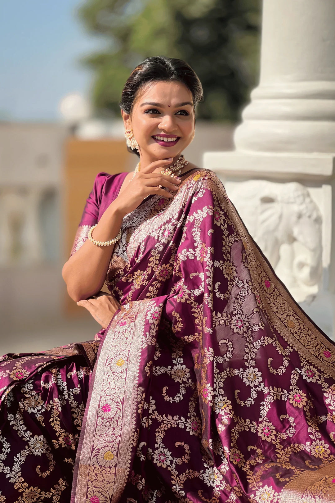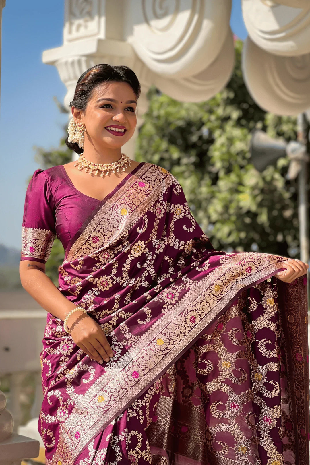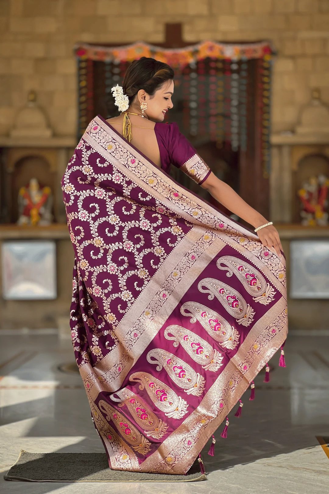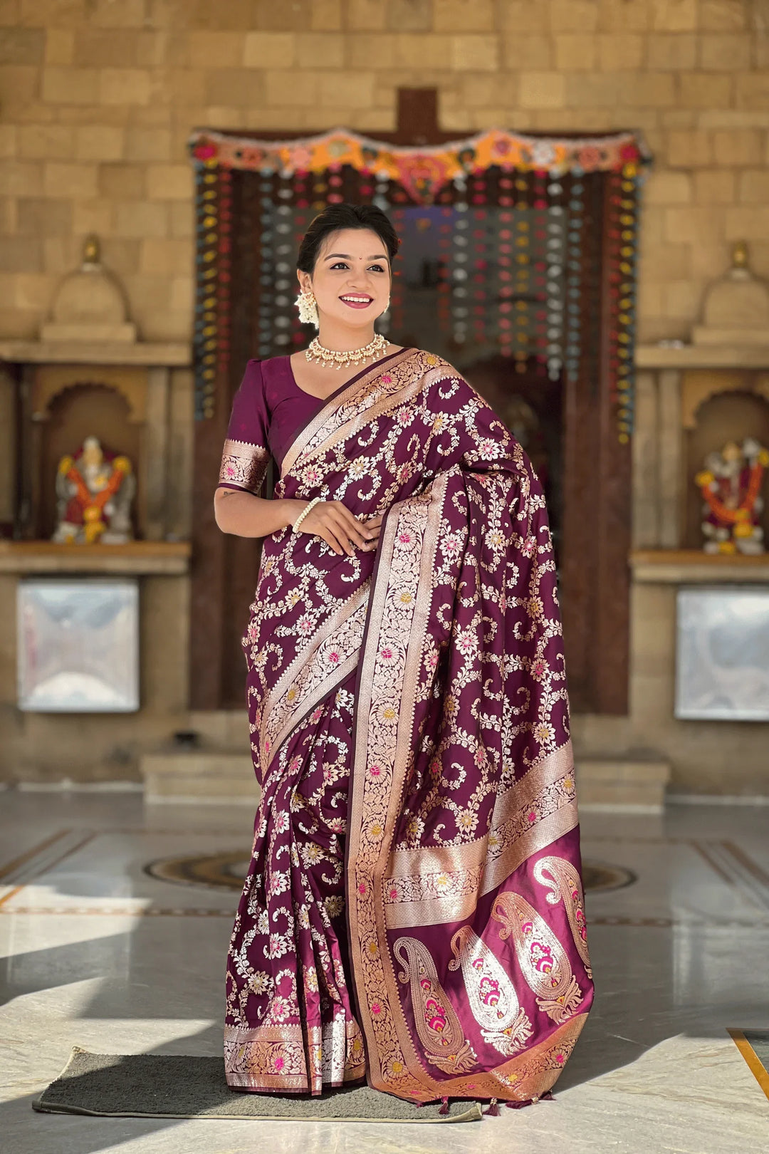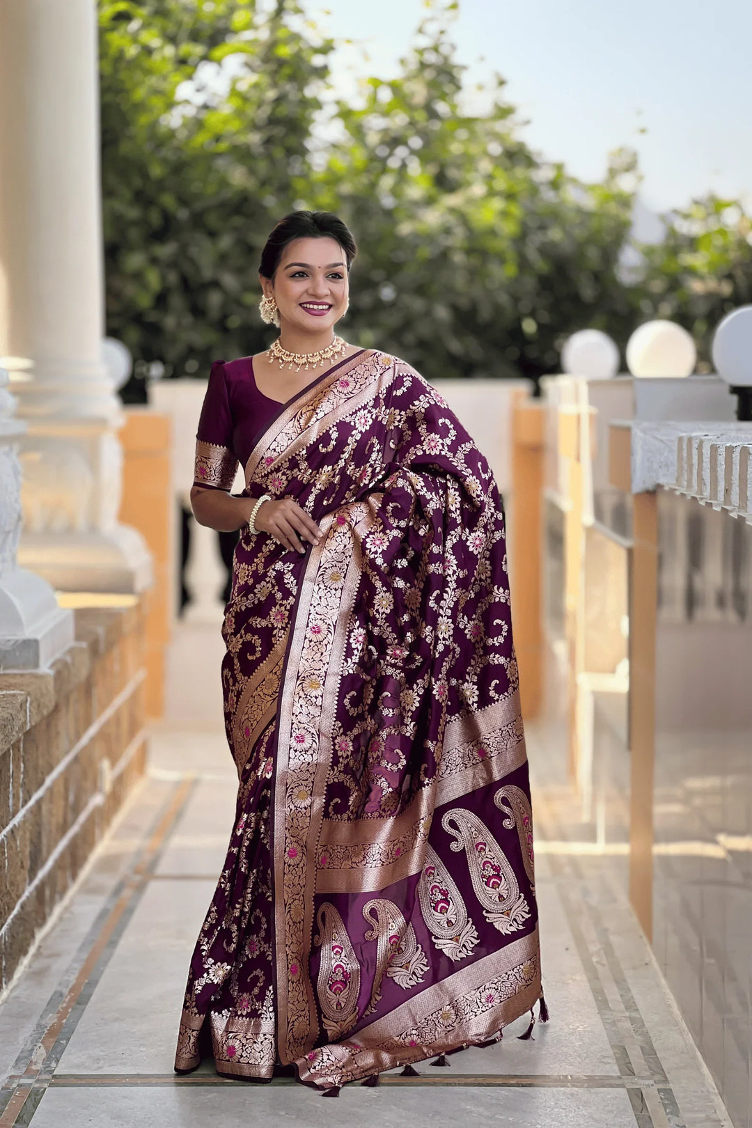 Introducing the Glamwiz Wine Banarasi Silk Saree. This royal banarasi silk saree has stitched pleats and is ideal for wedding or festive occasions.