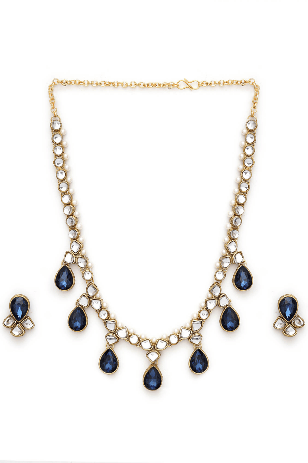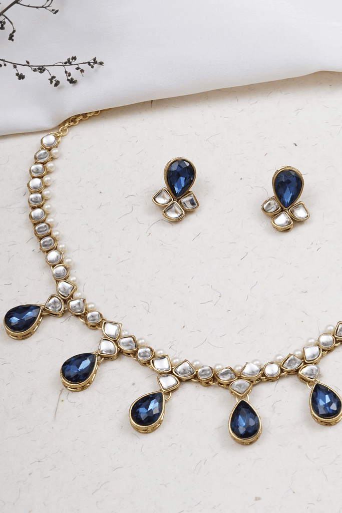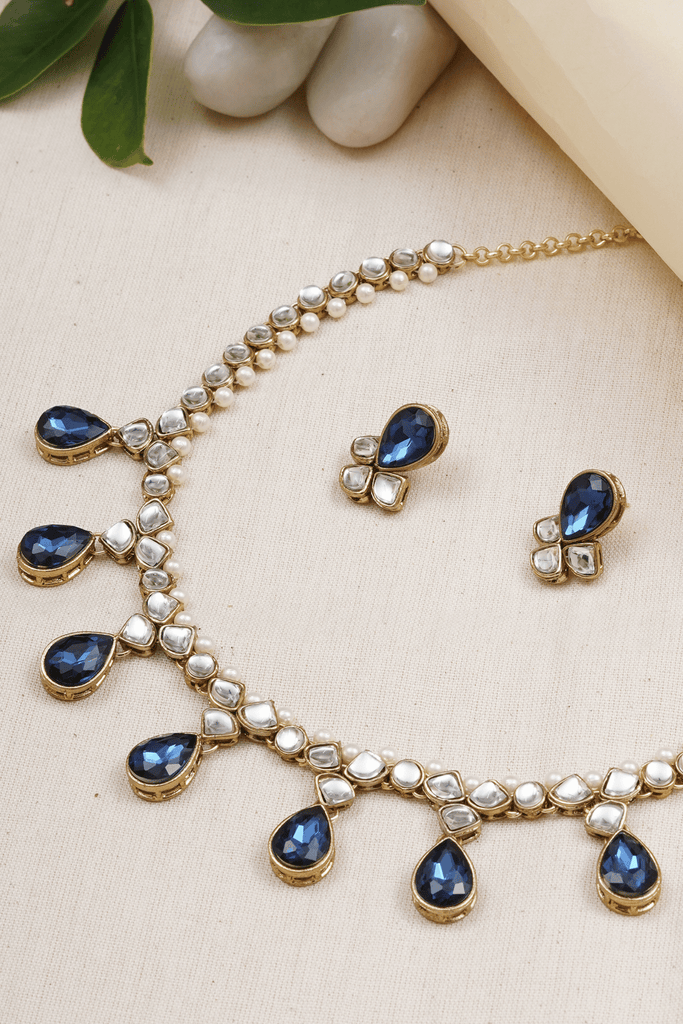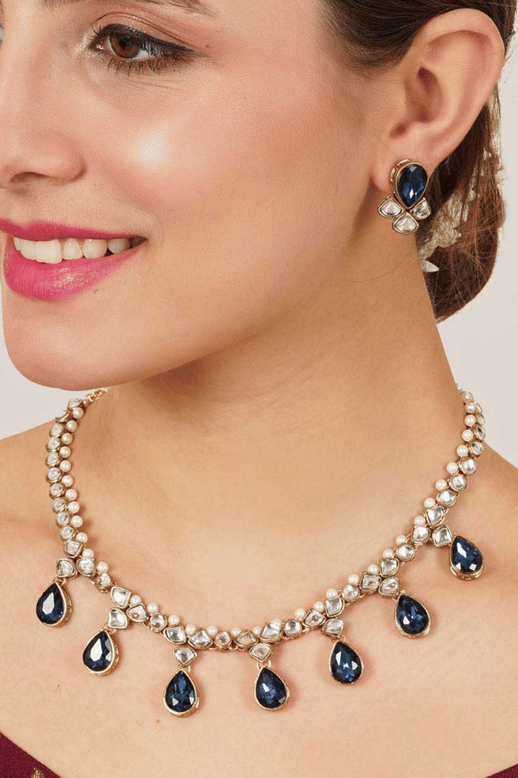 Pastels are the color of the season and what's better than mixing traditional and contemporary...Nothing! This Necklace is amalgamation of very Modern Slate Dark Blue colored crystals with Ethnic and Forever Classic Kundans. Adorned further with tiny white pearls the neckline gives off a very fresh vibe.