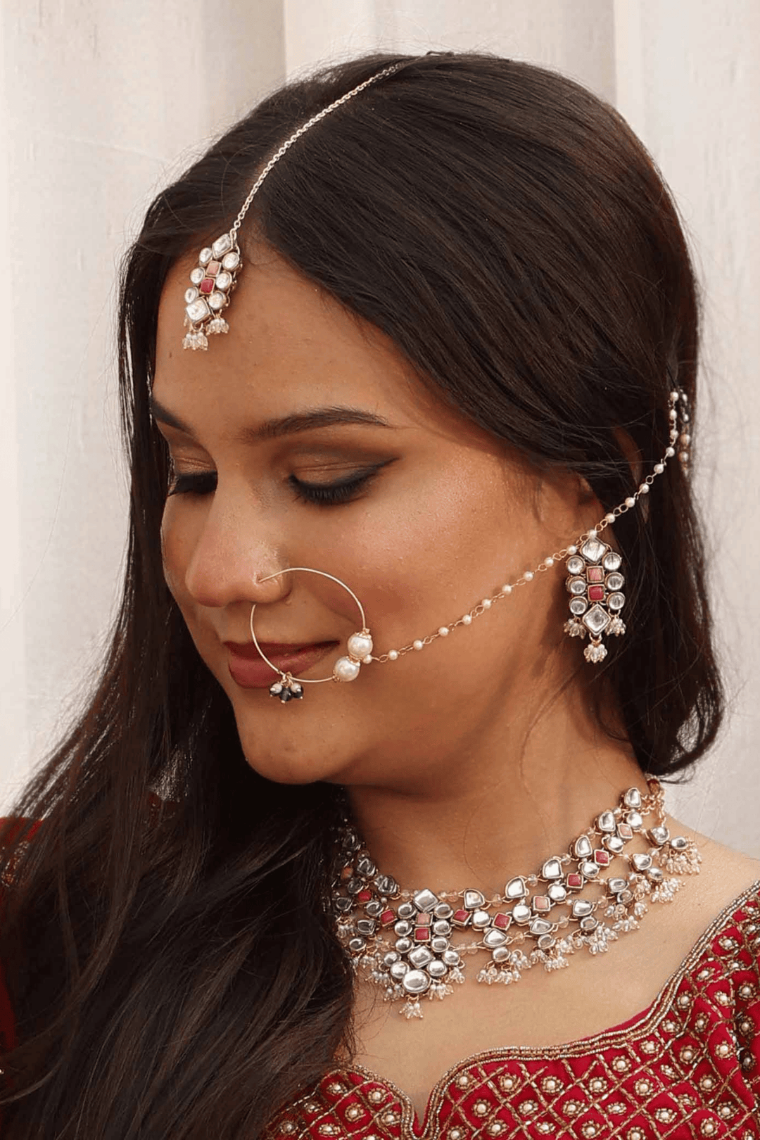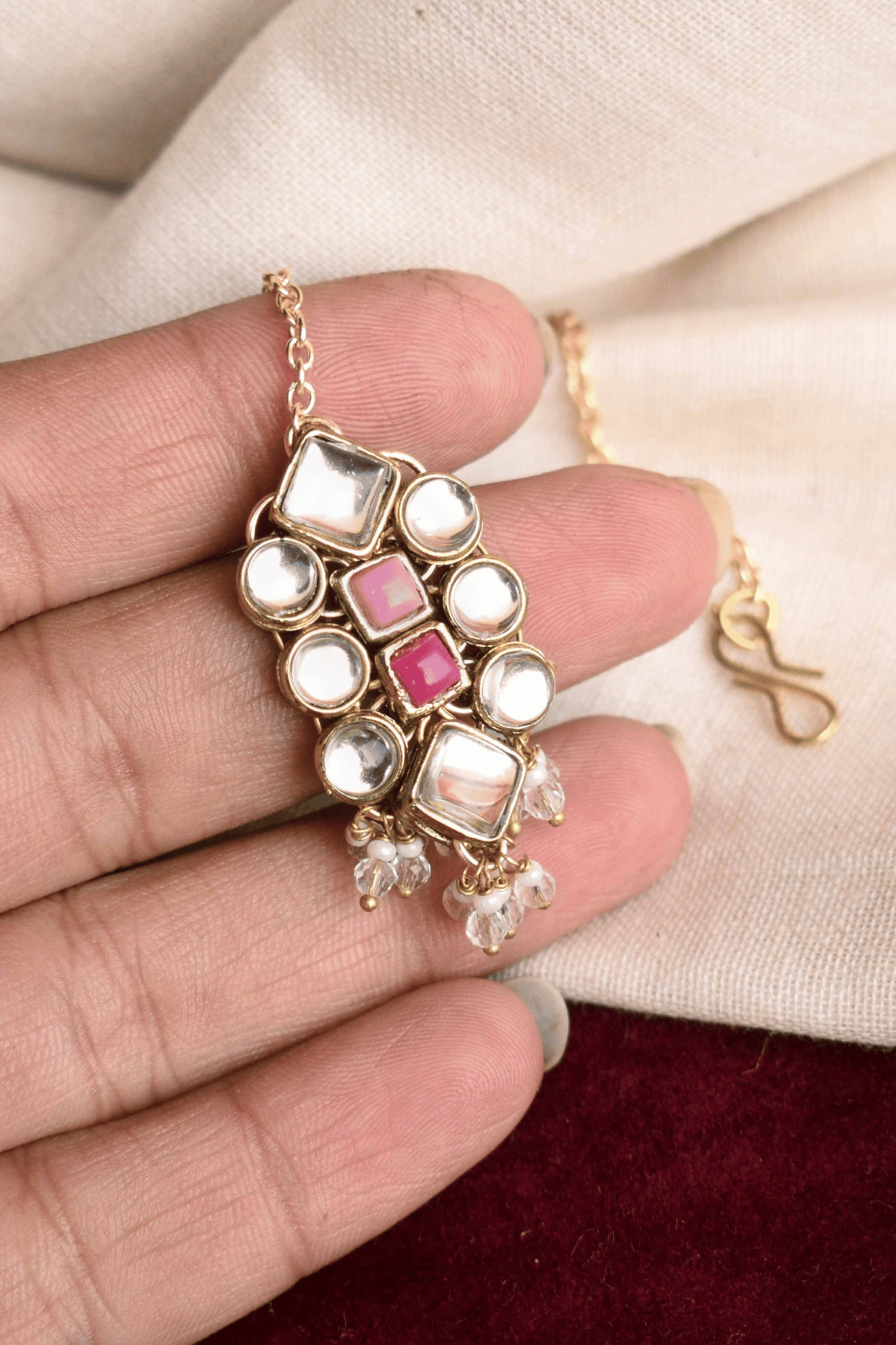 • Handcrafted with premium kundan, pearls, and pink gemstone accents