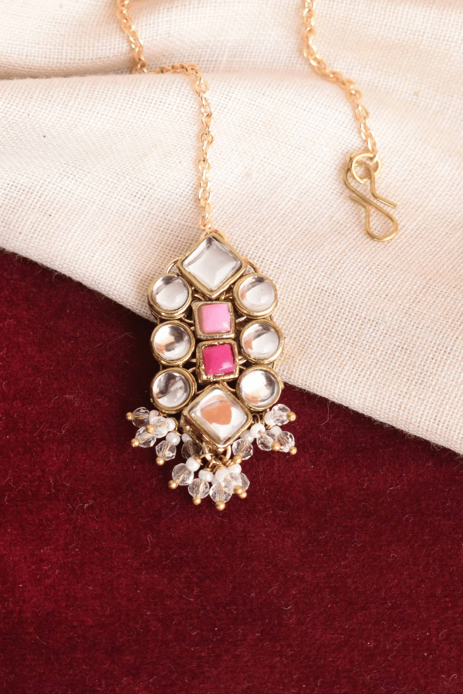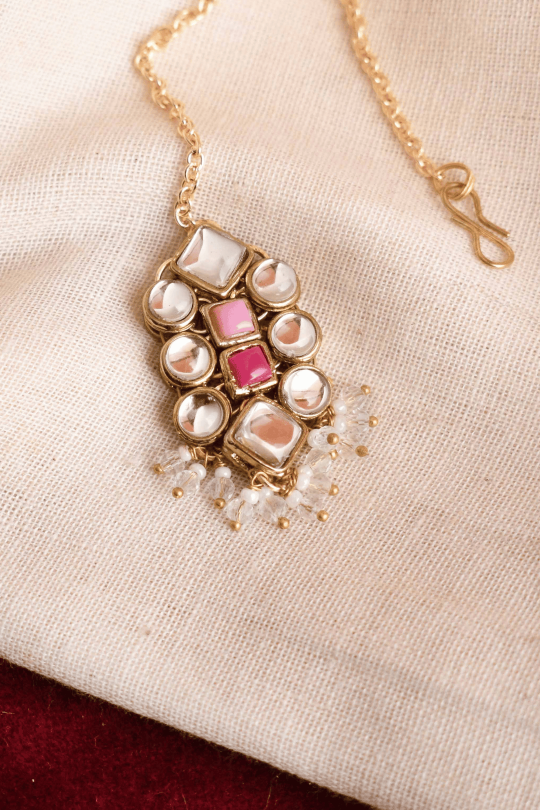 Elevate your bridal or festive look with the Enamoured Kundan Maangtikka, a stunning fusion of traditional craftsmanship and contemporary elegance. Featuring intricate kundan work, shimmering white pearls, and vibrant pink gemstones, this maangtika adds a delicate pop of color and sophistication. The gold-toned finish and handcrafted detailing make it a timeless piece to cherish for years.