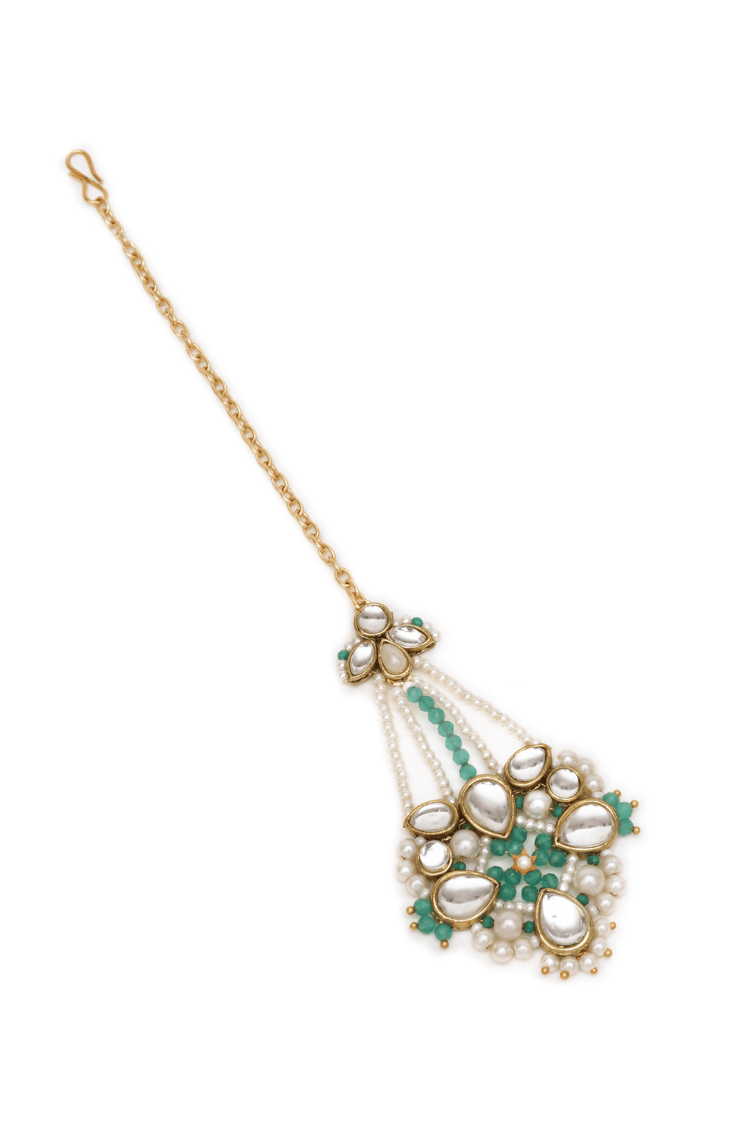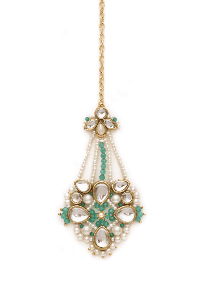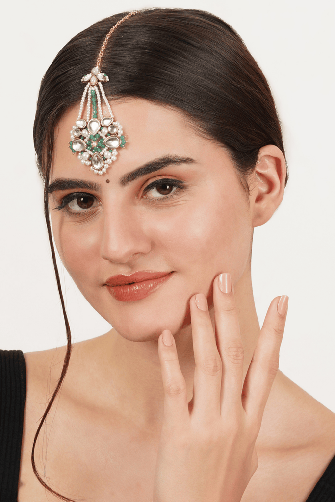 This exquisite Mangtika showcases a stunning blend of traditional Kundan work and contemporary design. Adorned with shimmering white pearls and vibrant emerald green gemstones, it's the perfect accessory to elevate any bridal look. The intricate detailing and gold-toned finish make it a timeless piece that will be cherished for years to come.