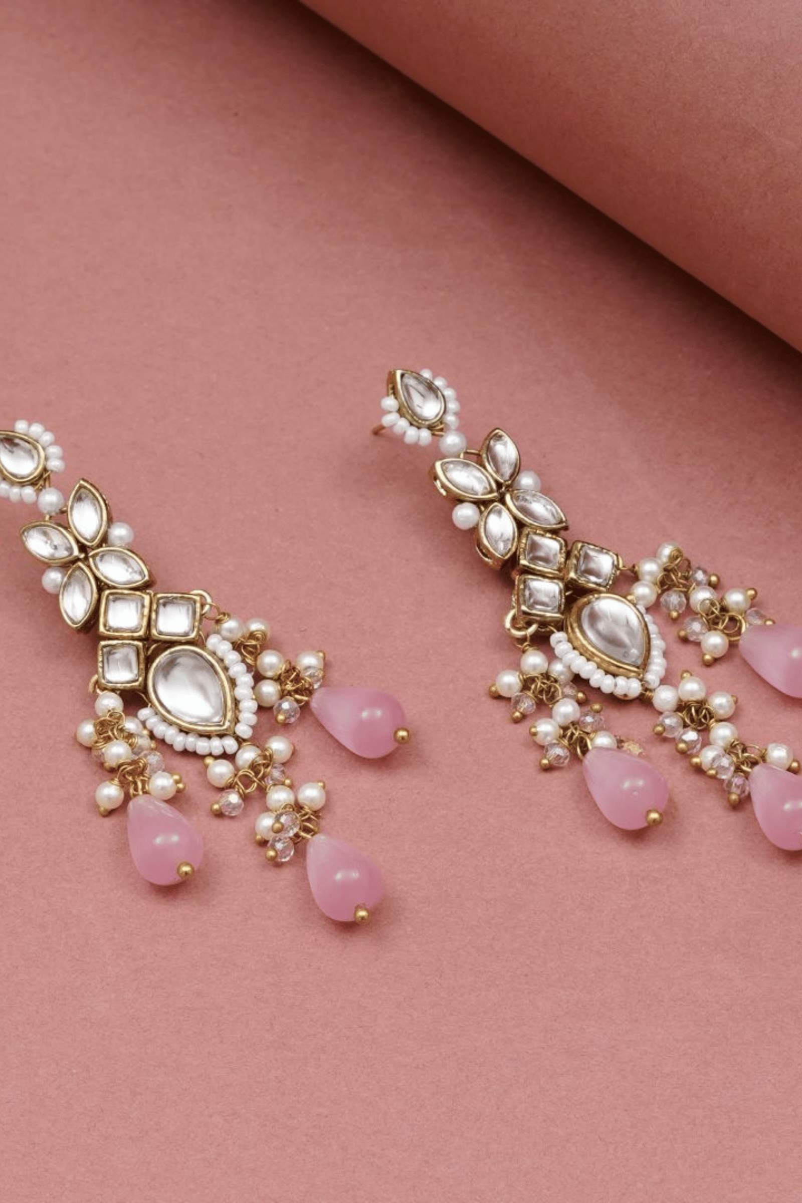 Add a touch of dreamy elegance to your festive or wedding look with the Rosé Cascade Kundan Drop Earrings. Featuring traditional kundan work, delicate pearls, and soft pink teardrop beads, these earrings are lightweight yet striking, making them perfect for celebrations that call for subtle charm and sophistication.