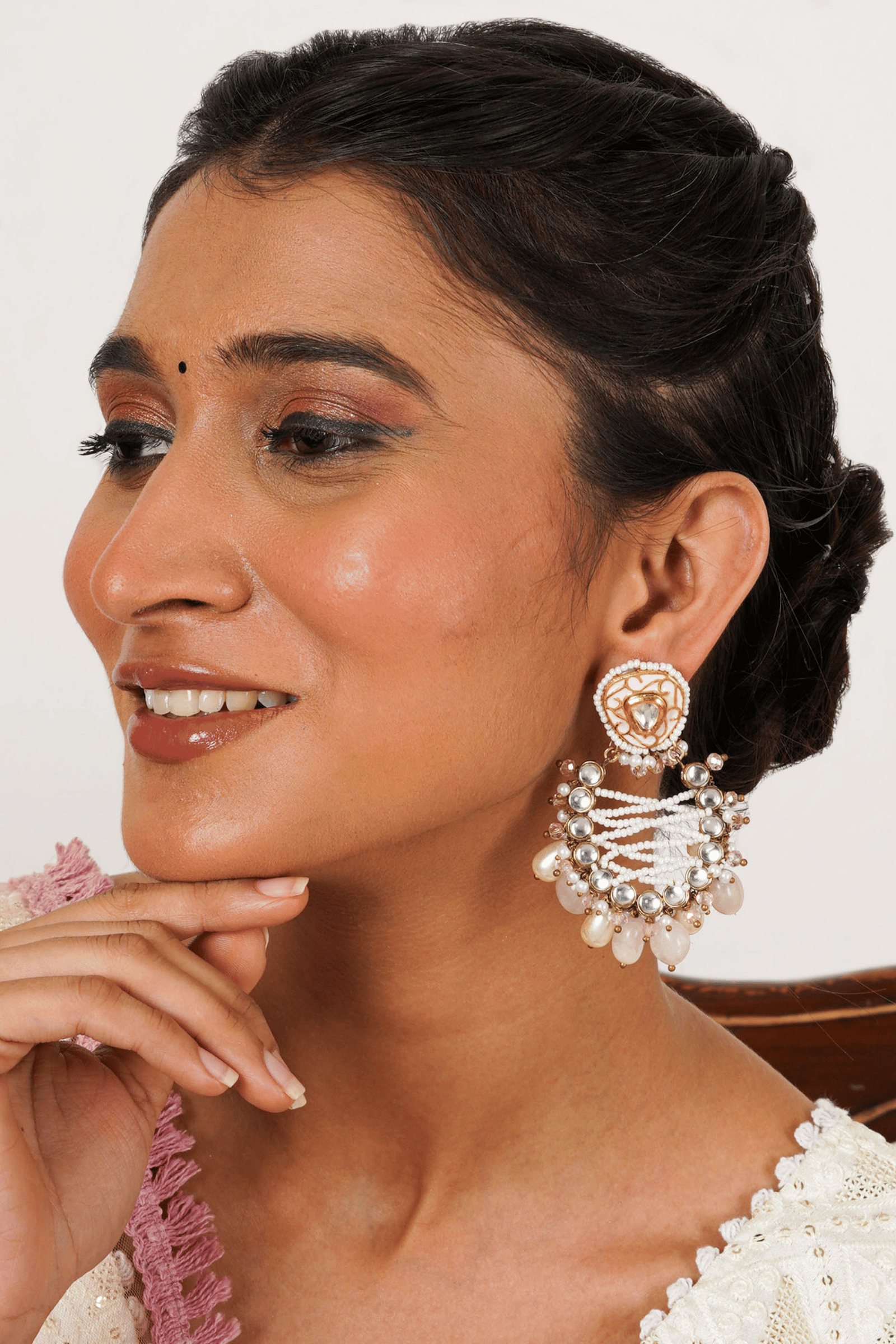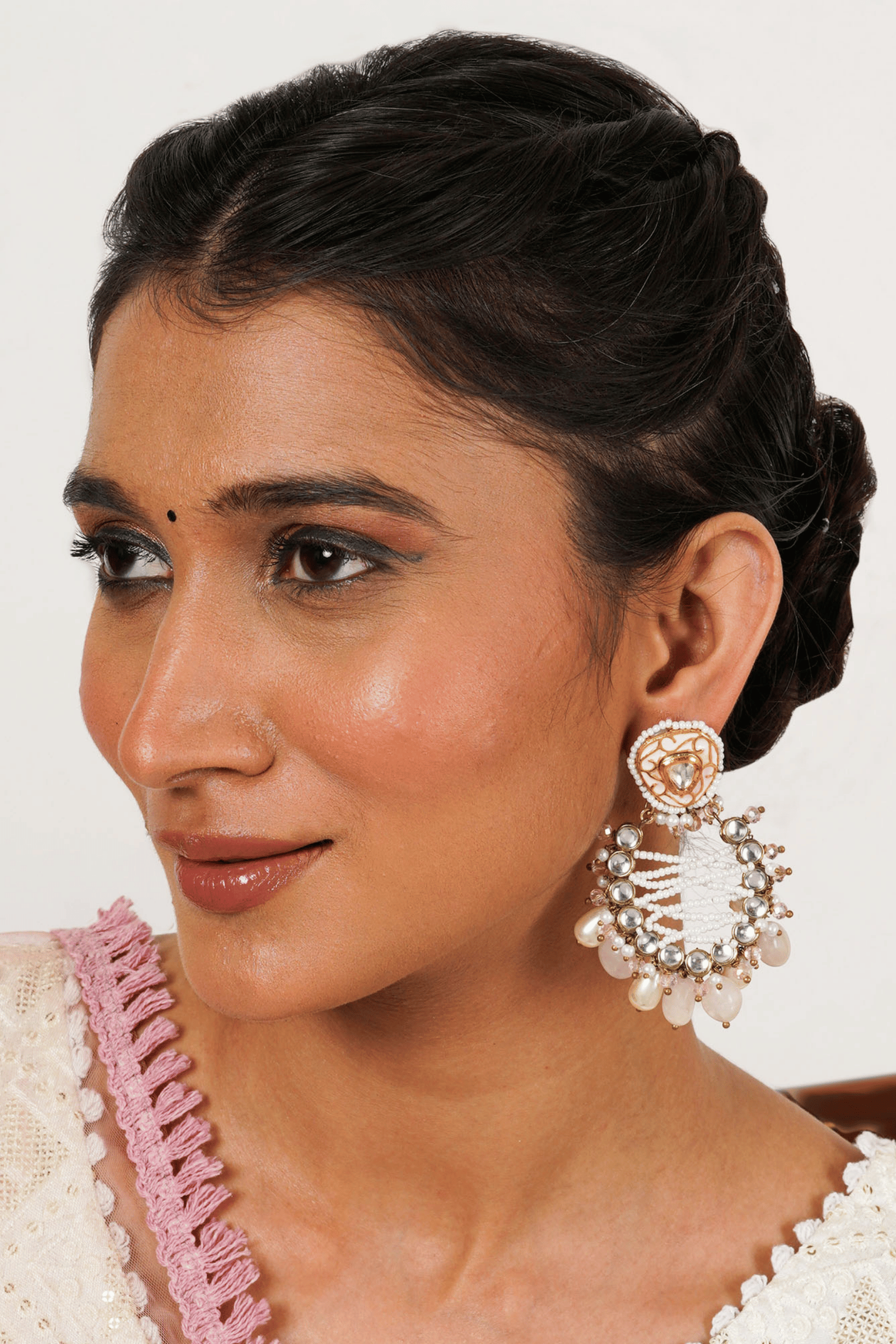 Add a touch of timeless elegance with the Pink Wink Earrings, a stunning blend of traditional artistry and modern charm. These handcrafted chandbali-style jhumkas feature hand-painted Meena detailing and sparkling Kundan stones set within an elegant frame, creating a look that is both classic and captivating.
