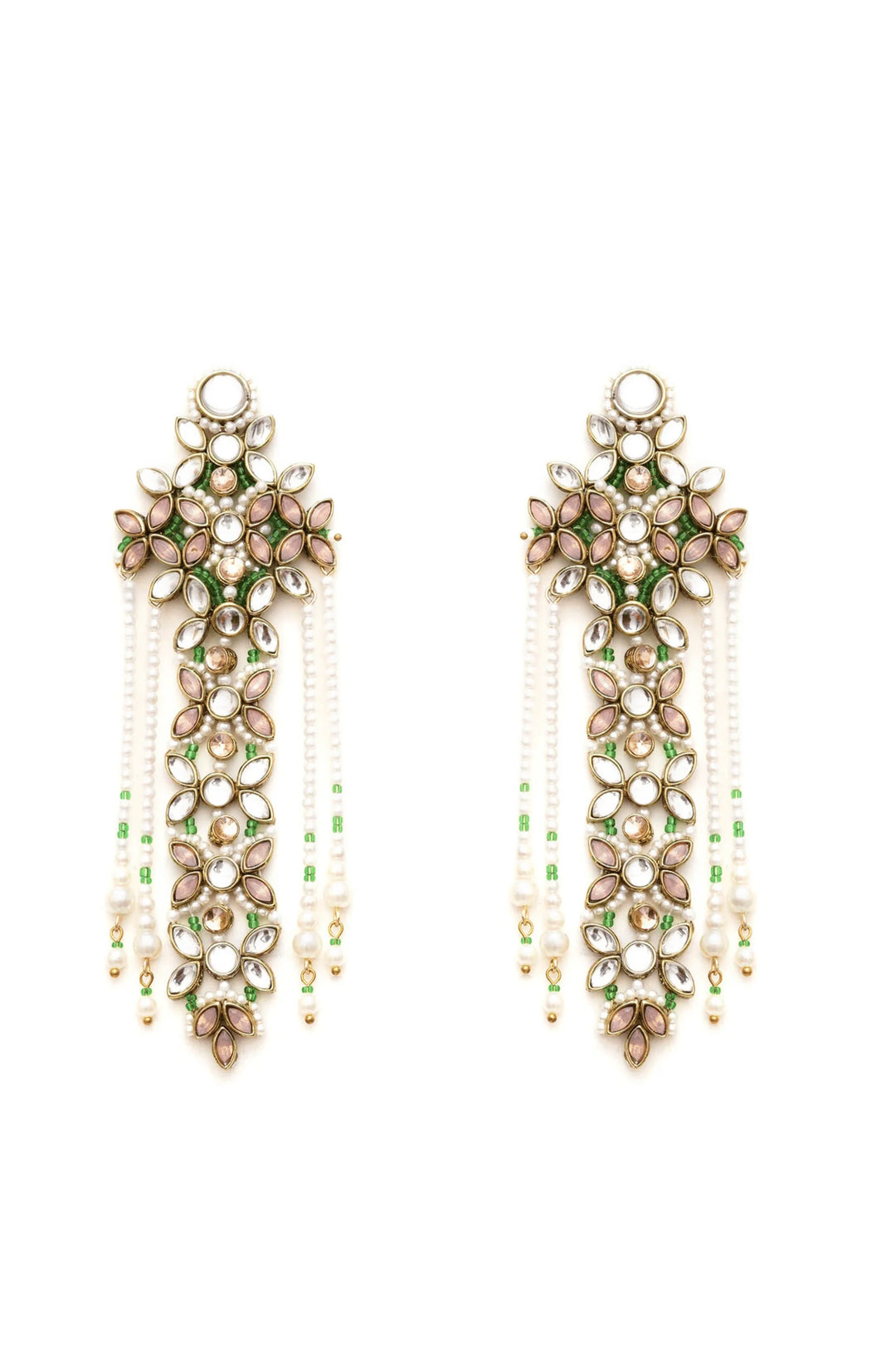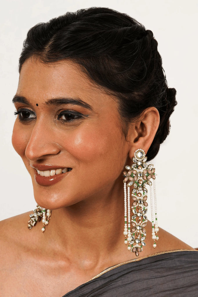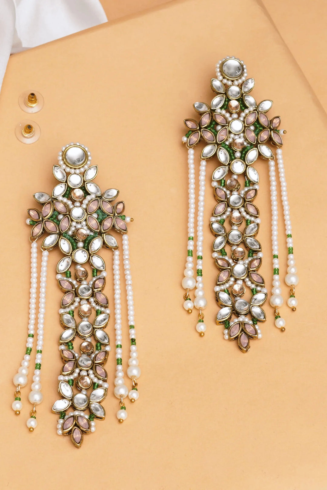 Jade Jharna | Long Green Kundan Earrings with Pearls