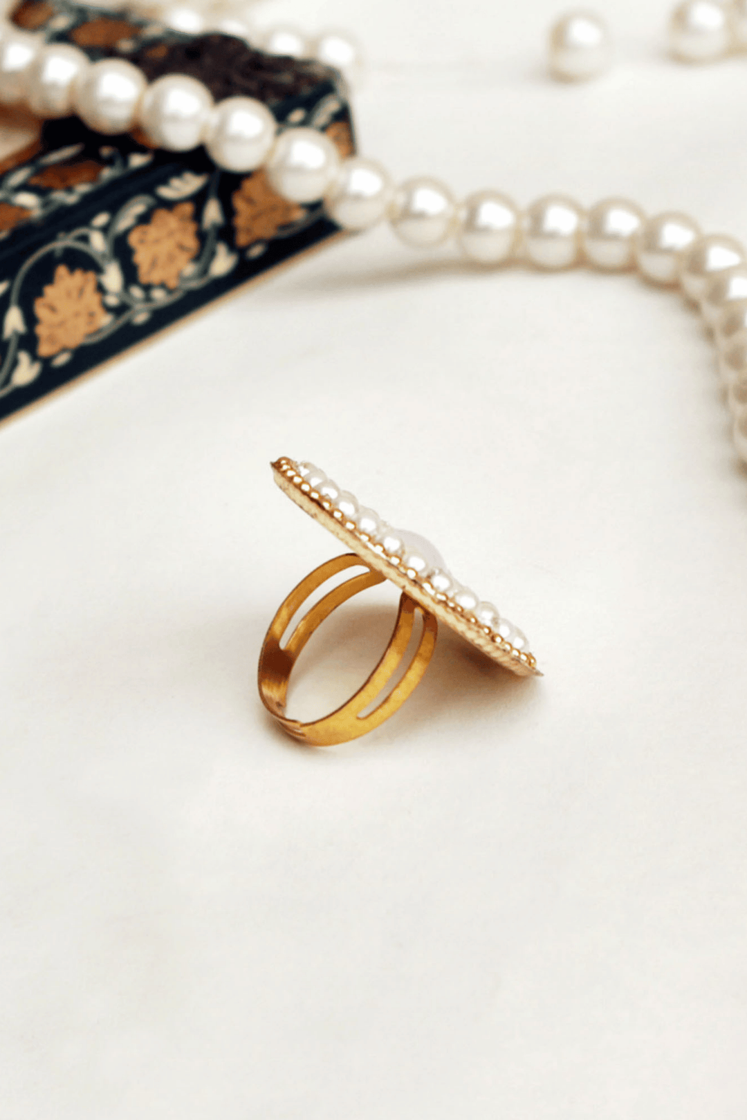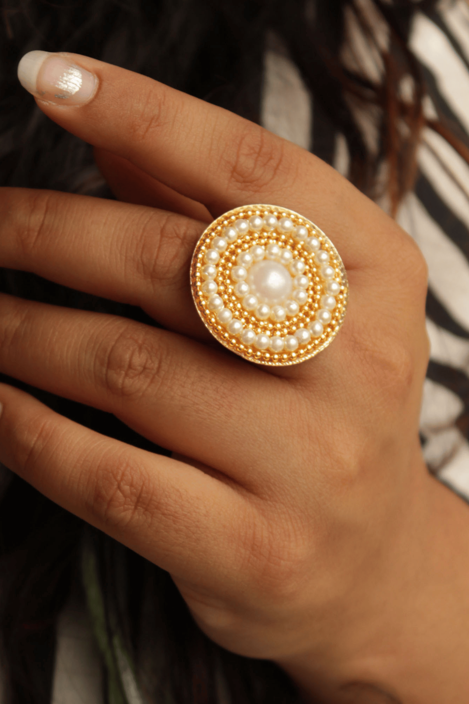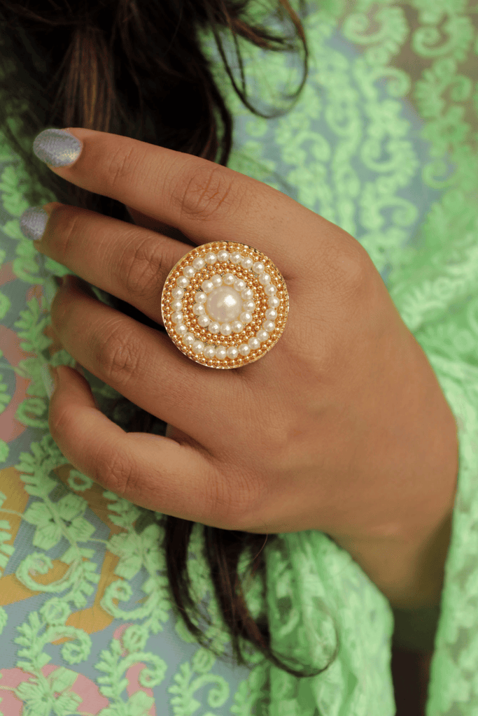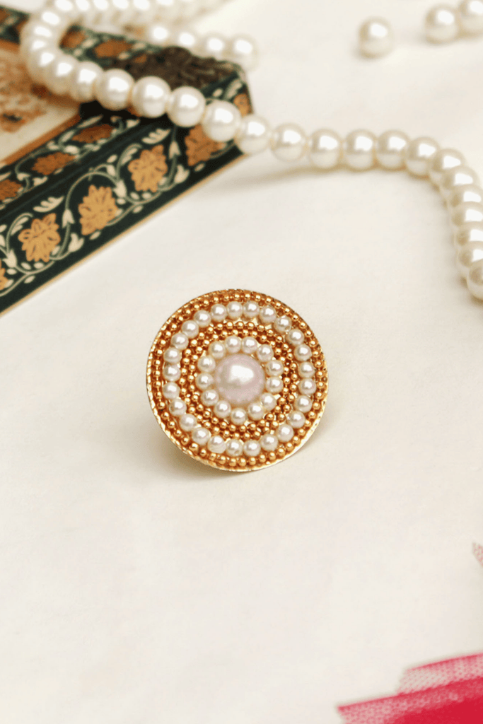 Make a statement with the Golden Swirl Pearl Ring, a stunning gold-toned accessory adorned with lustrous white pearls. Featuring a chic geometric design, this boho-inspired ring adds a touch of elegance to your wedding or festive wardrobe. Fully adjustable, it ensures a perfect fit for any finger, combining style with comfort.