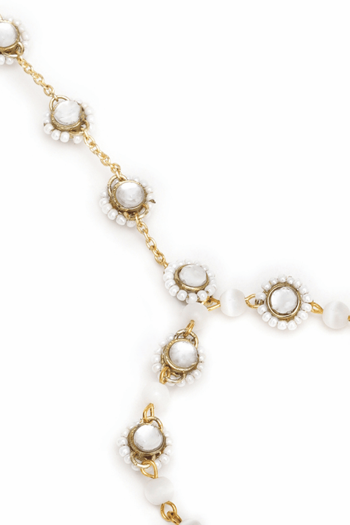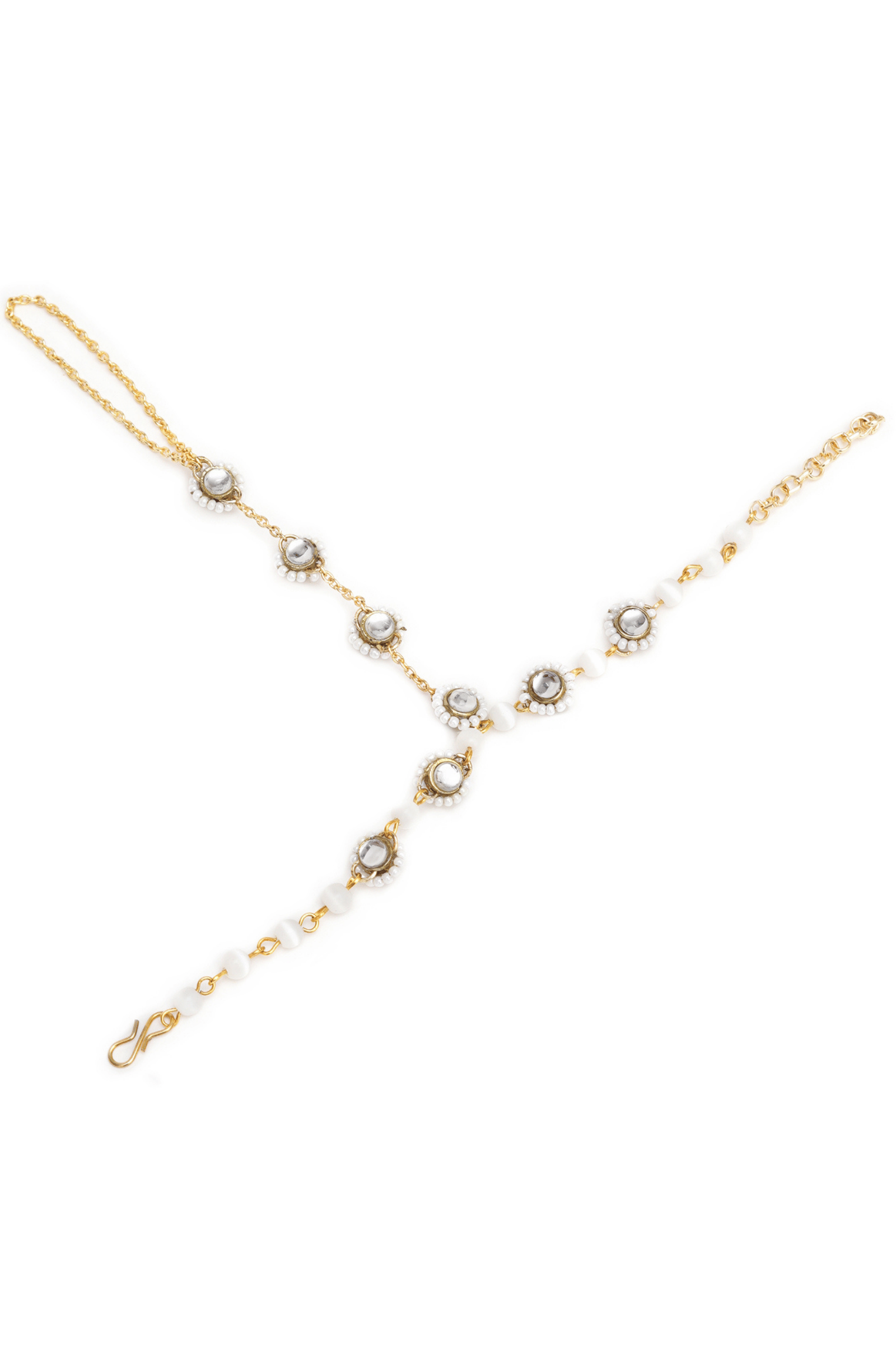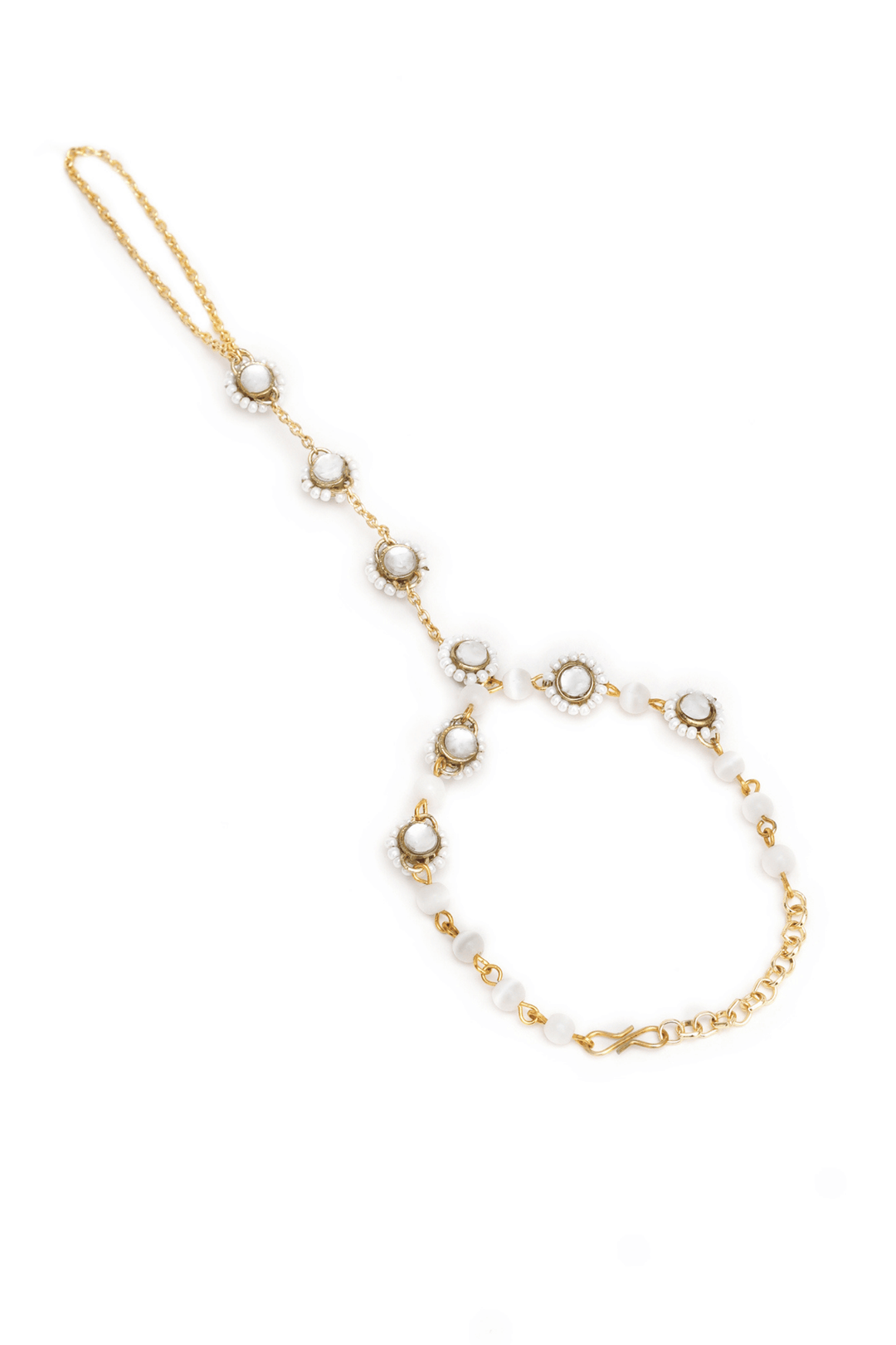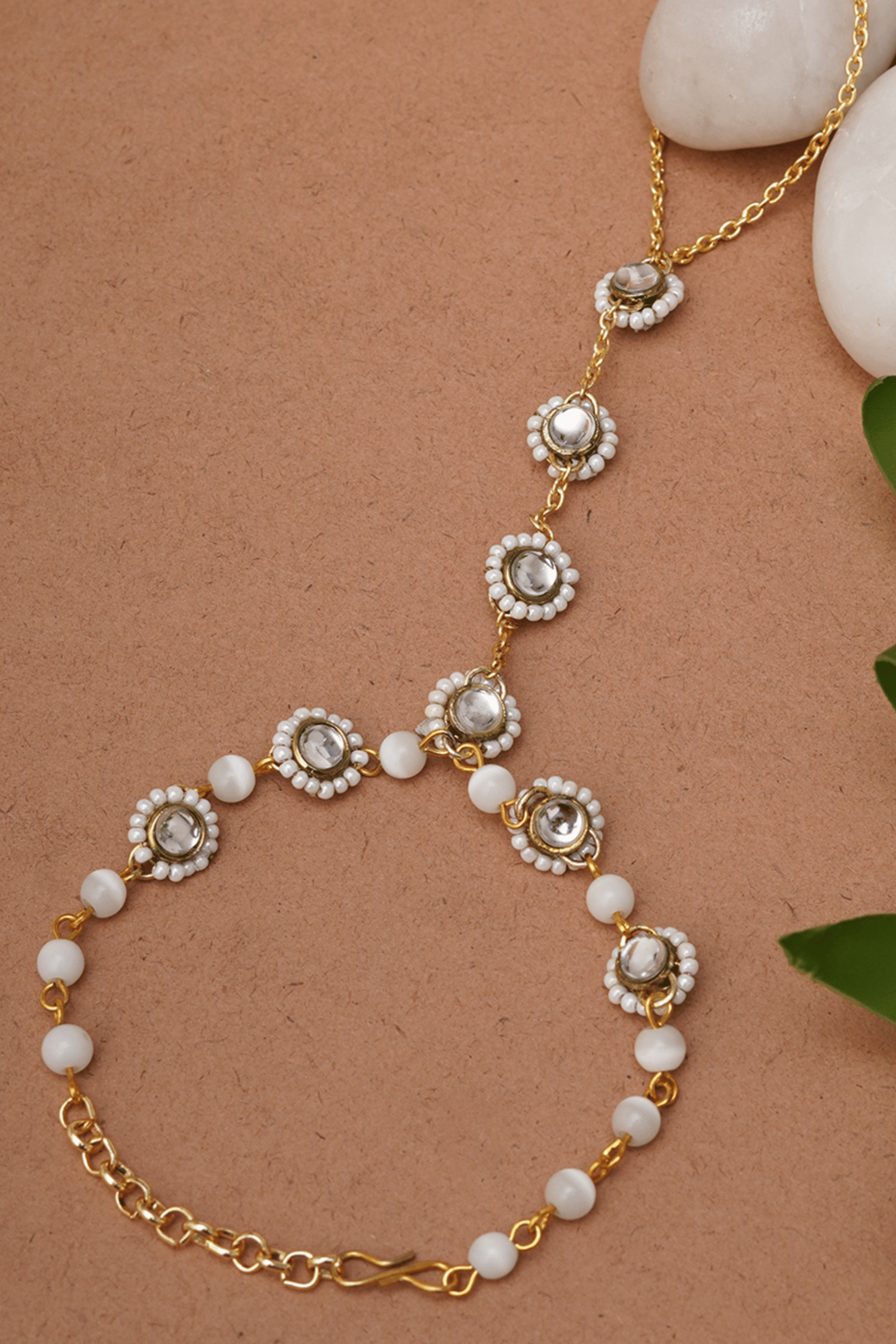 Add a touch of regal charm with the Maharani Pearls Hathphool Bracelet. Featuring golden round kundan stones at its center, each surrounded by a halo of lustrous white pearls, this piece is a perfect blend of tradition and sophistication. Crafted for comfort, the adjustable design ensures a flawless fit for all hand sizes.