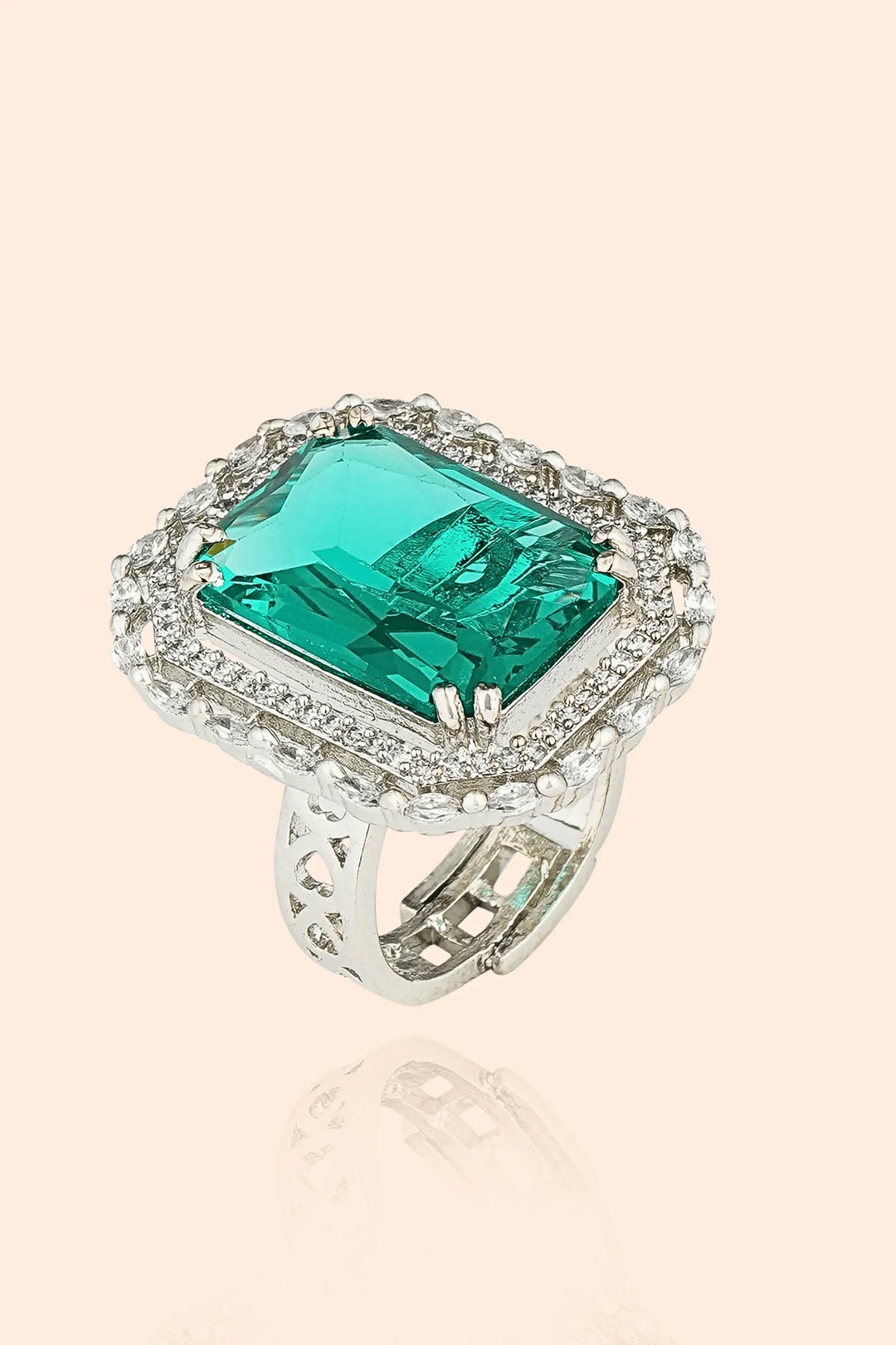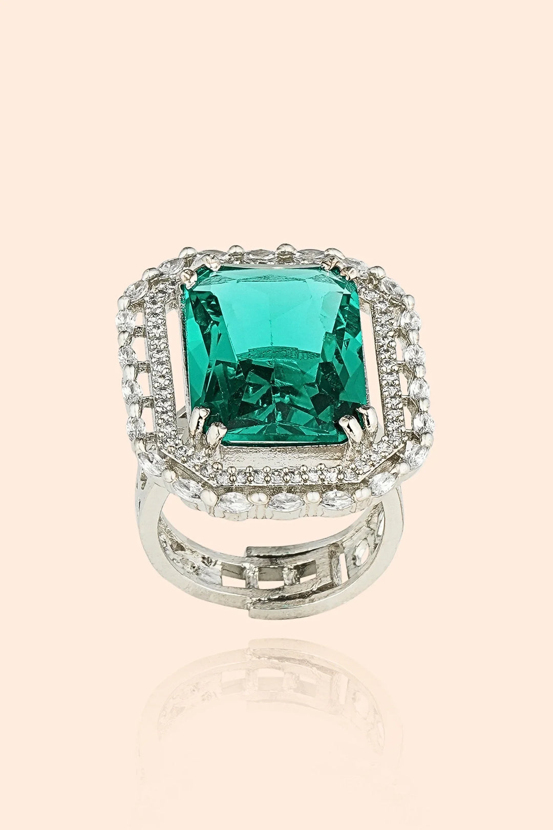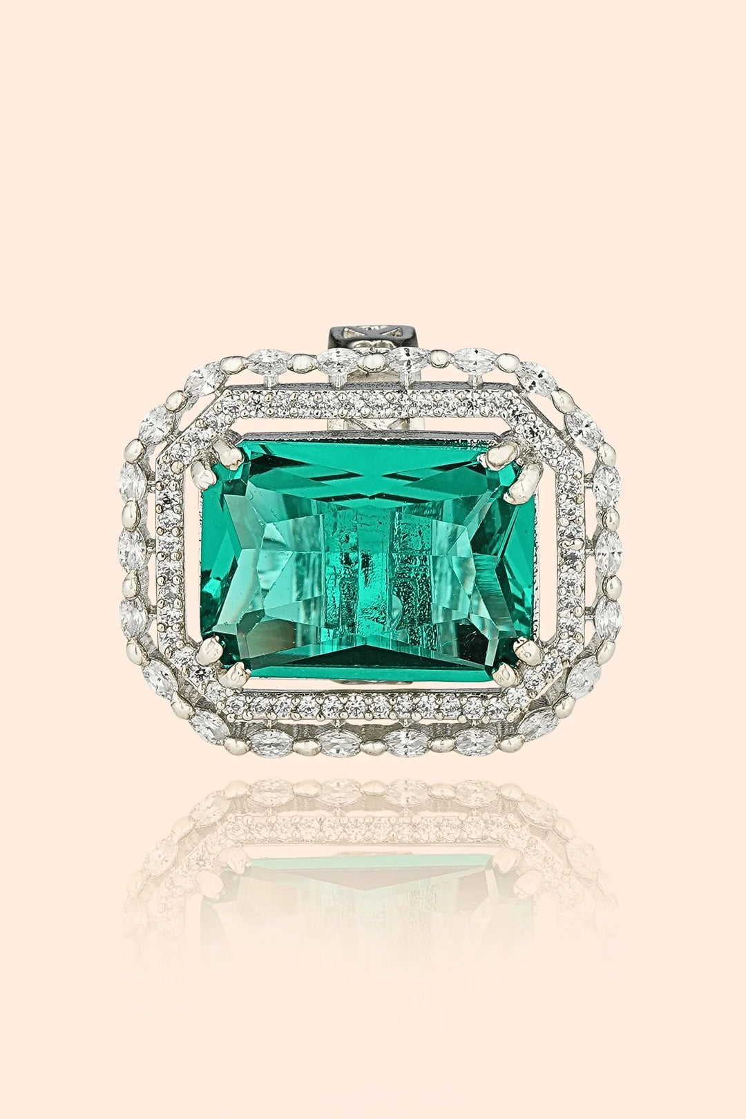 Indulge in the grandeur of royalty with the Maharani Noor Royal Green Emerald Ring, a masterpiece inspired by the opulent jewelry of Indian queens. This exquisite ring features a rich, emerald-green gemstone, set in a halo of dazzling white stones, symbolizing power, prosperity, and timeless beauty.