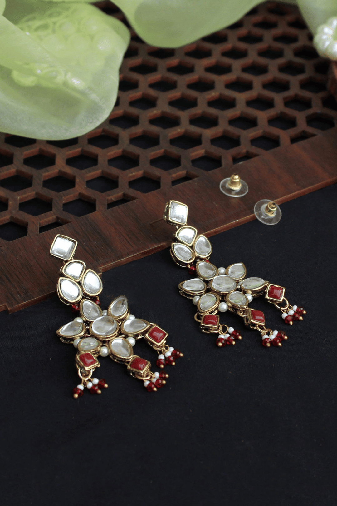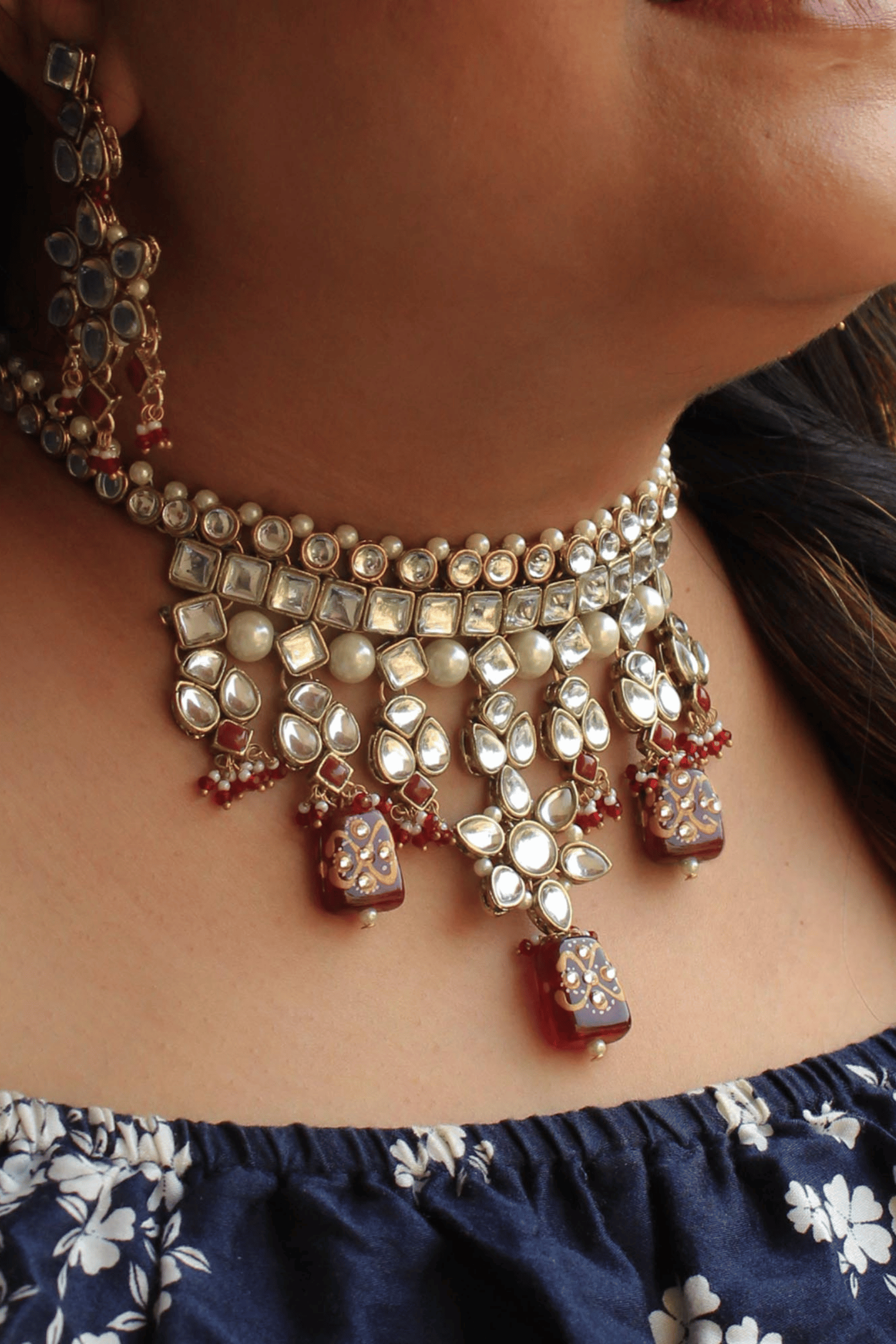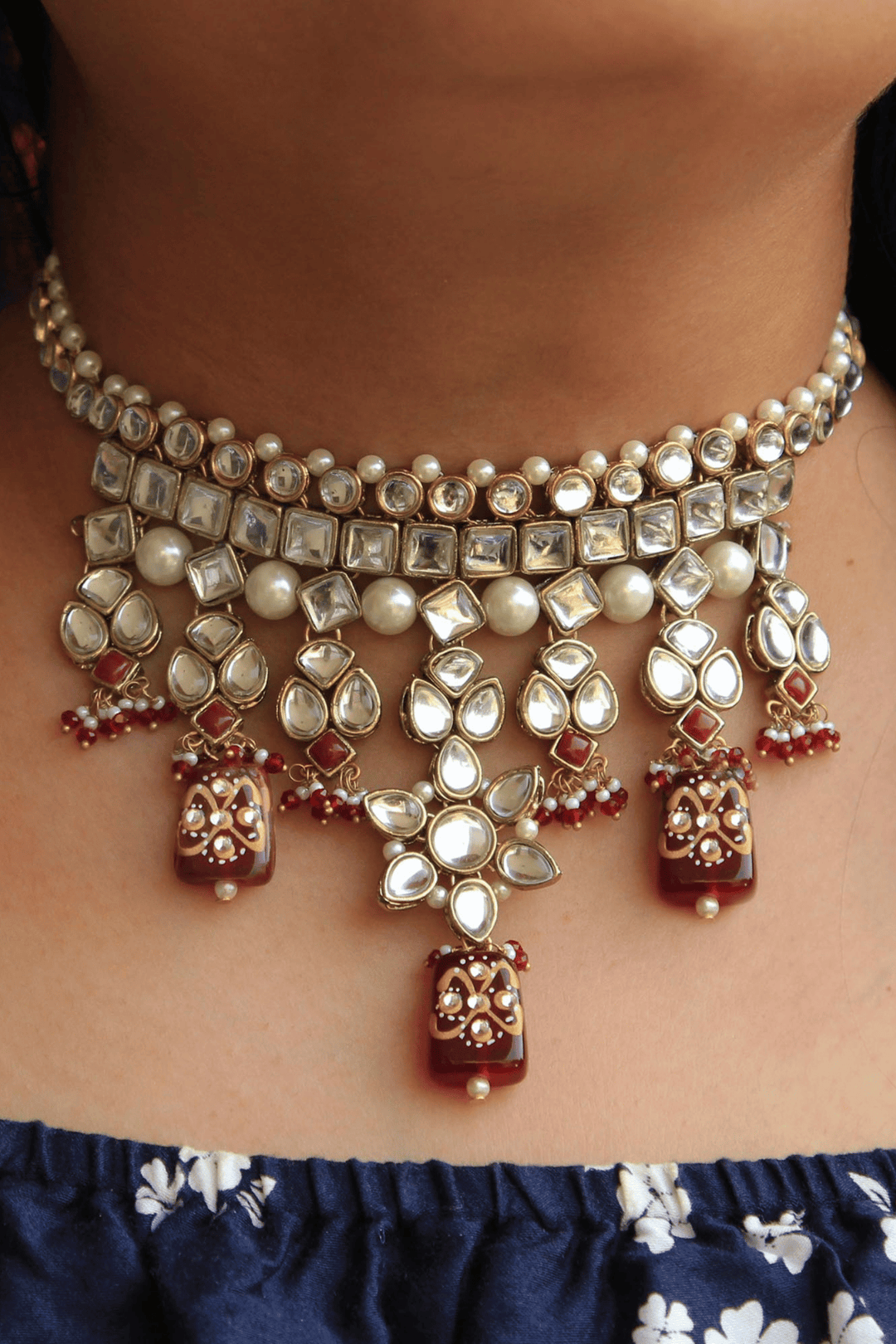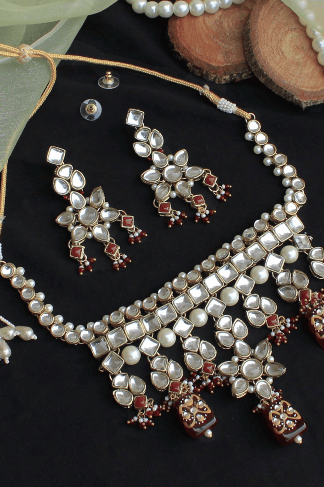Handcrafted floral kundan motifs with maroon bead accents