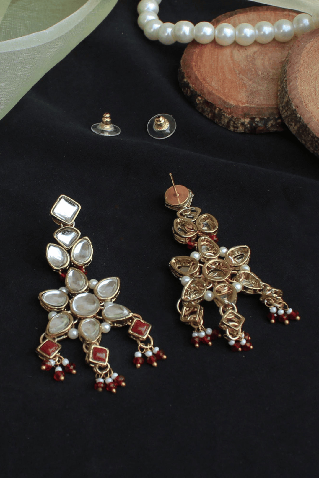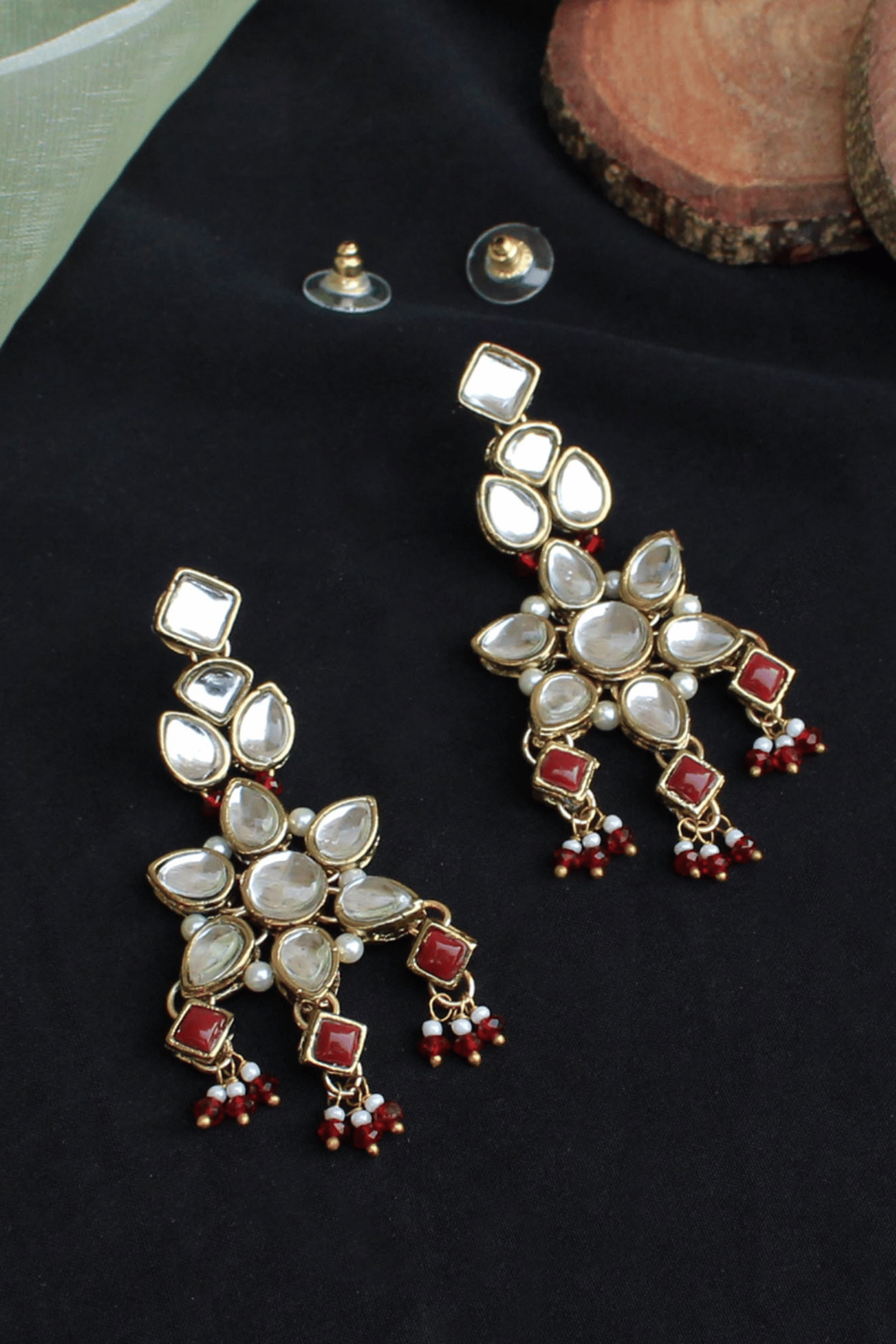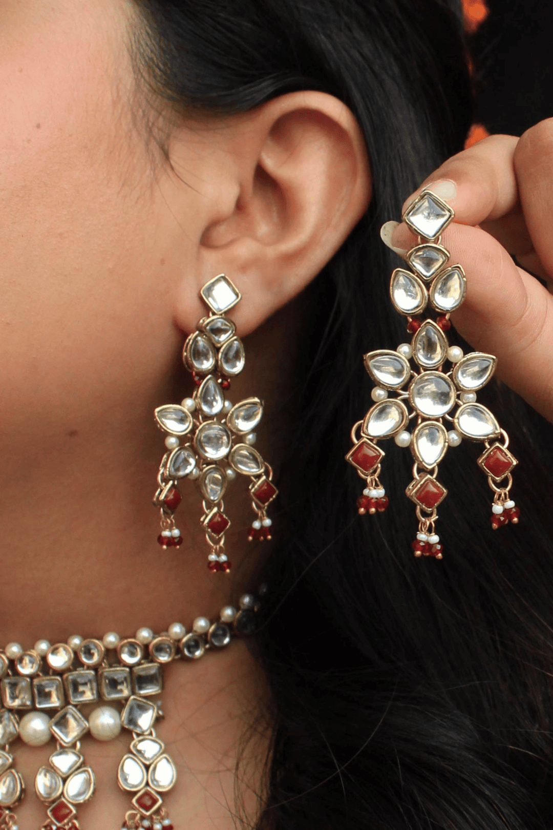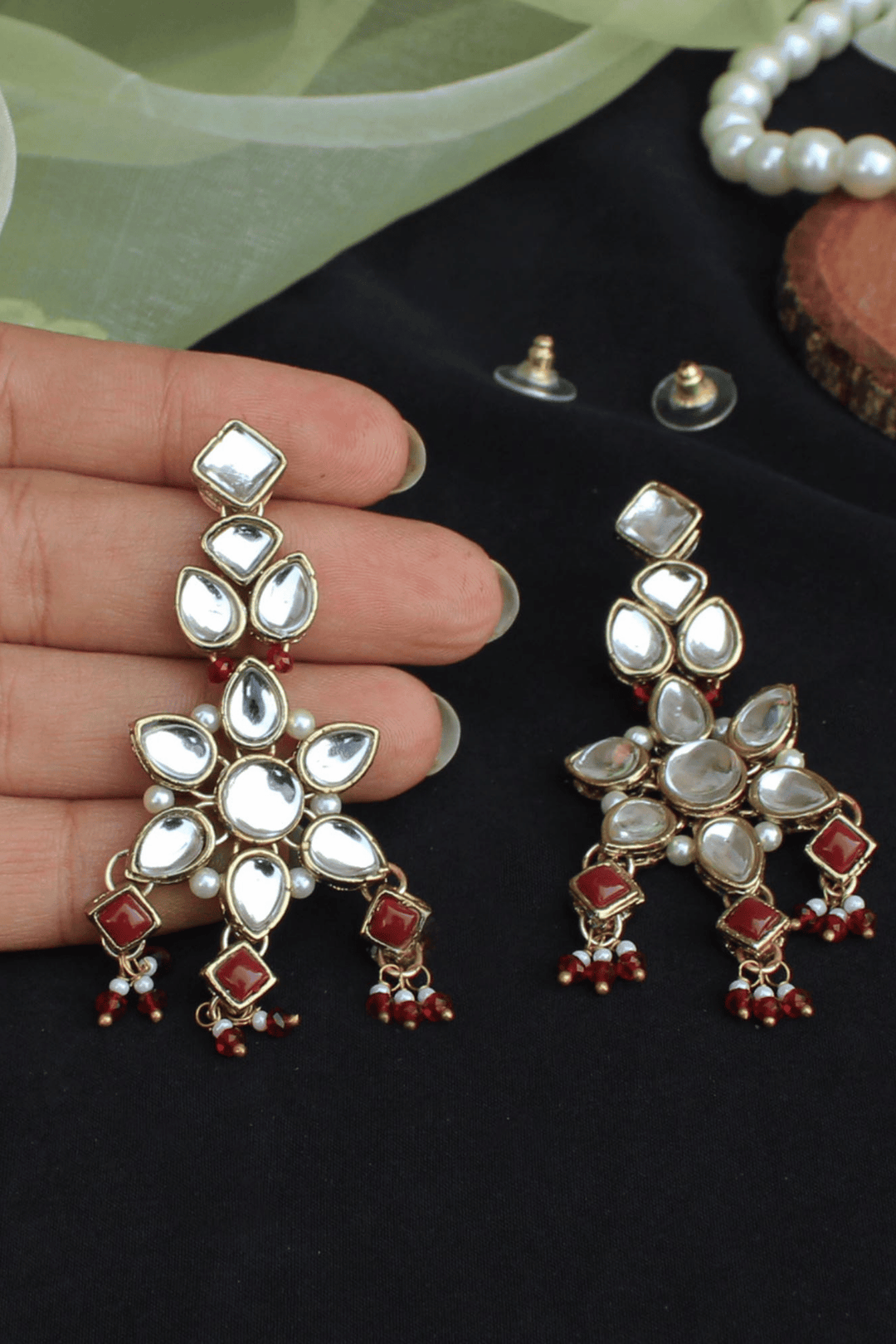 Handcrafted floral kundan motifs with maroon bead accents