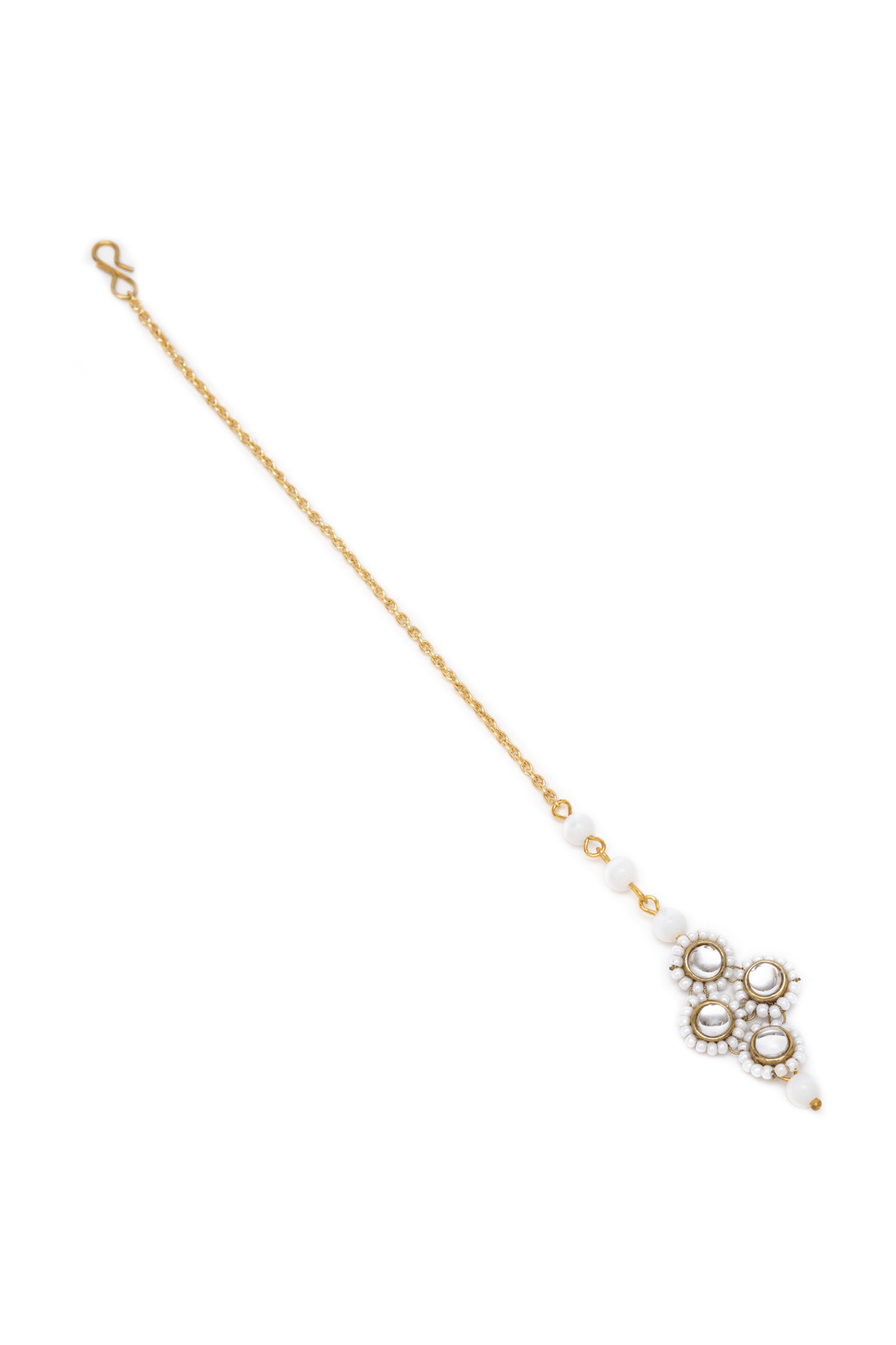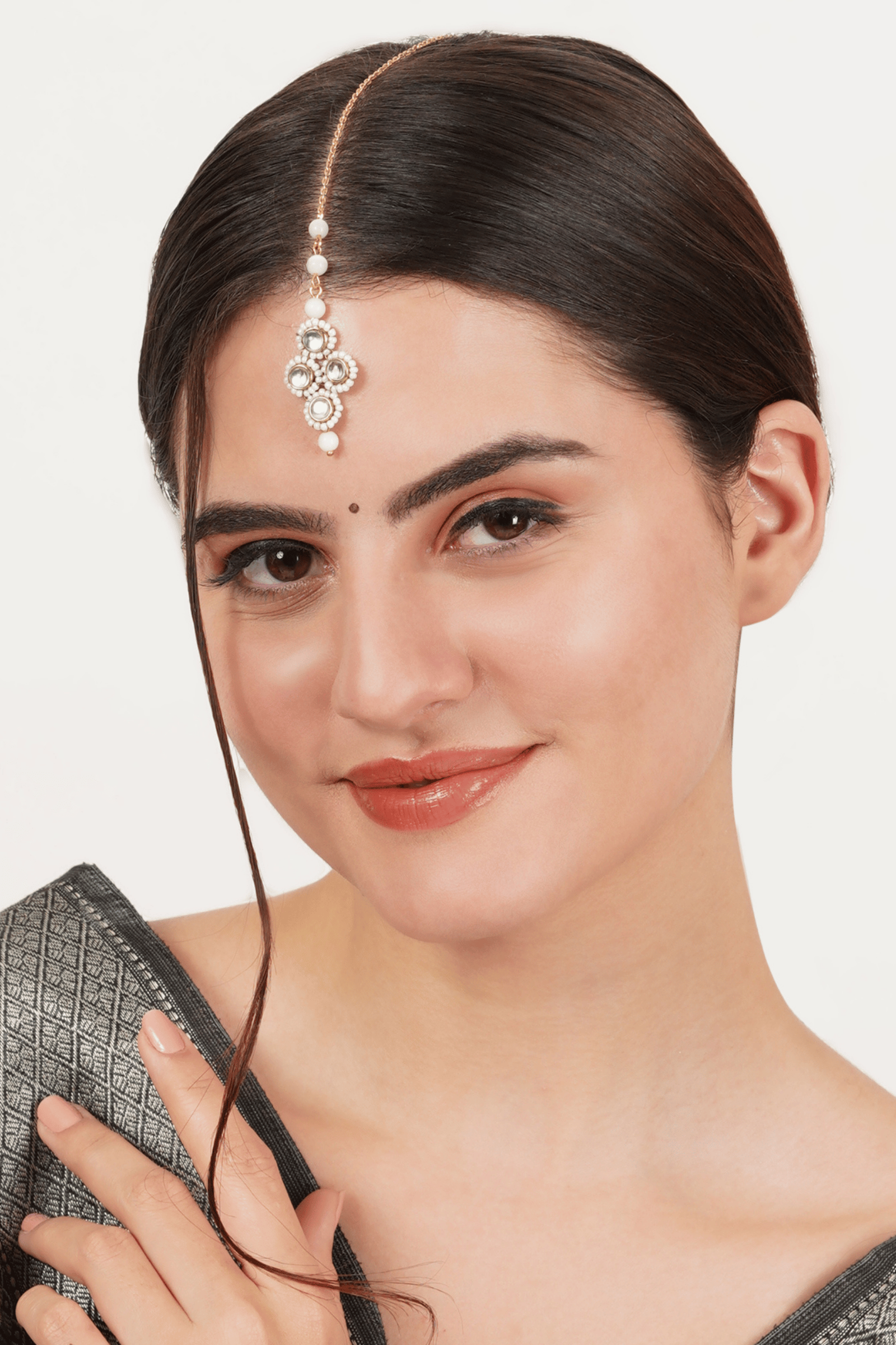 This exquisite Mangtika showcases a stunning cross design adorned with shimmering white pearls and sparkling Kundan stones. The intricate detailing and gold-toned finish make it a timeless piece that will elevate any bridal look. The minimalist design is perfect for those who prefer a subtle yet elegant touch of jewelry.