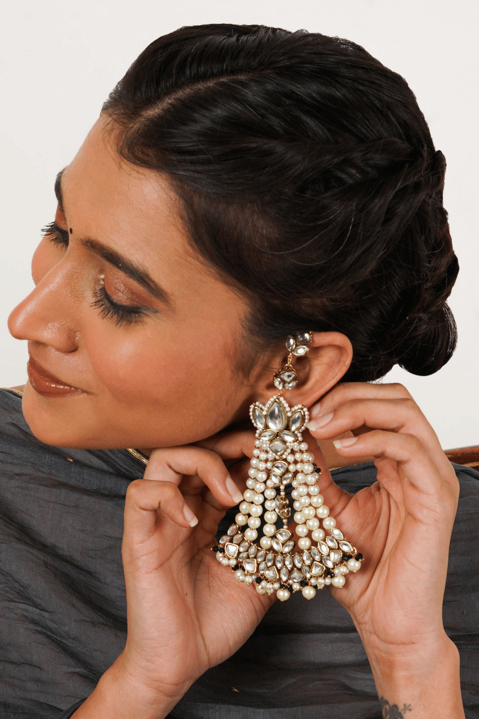 ✨ Hair & Makeup: Showcase the cascading pearls with a bun or half-updo. Pair with bold eyeliner and a nude lip for sophistication, or classic red lips for traditional appeal.