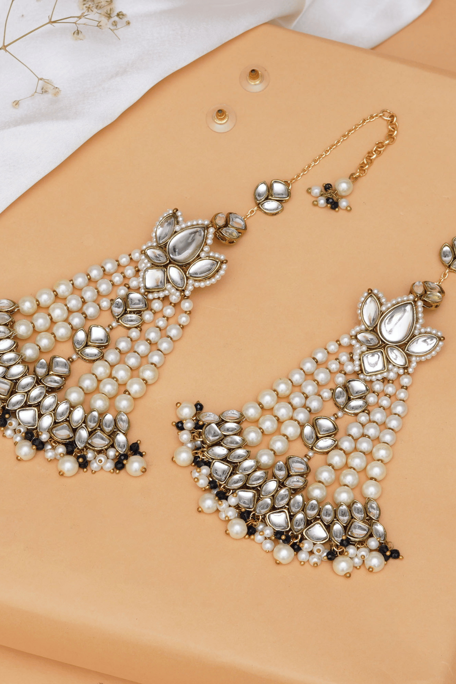✨ Floral Motif with Pearl Cascades: Striking floral centerpiece with cascading pearl strands for a rich, elegant effect.