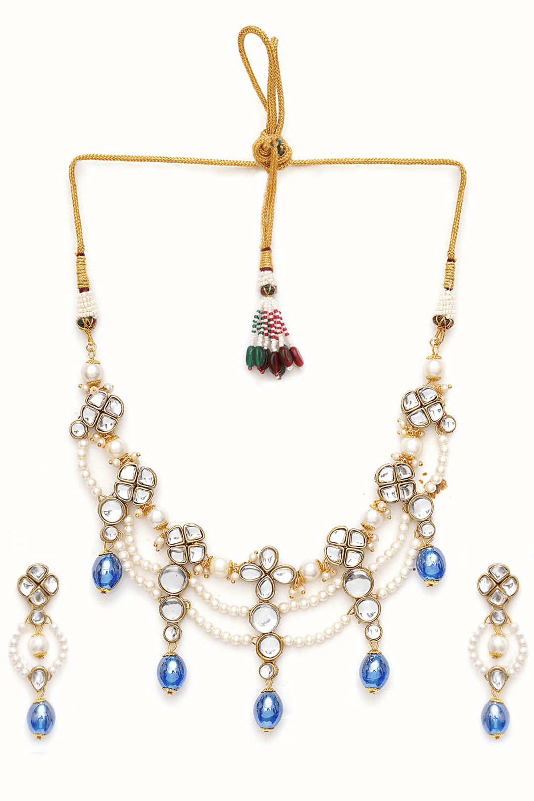 Create a buzz around your corner by wearing this Necklace Set. This Light Blue jewelry set is beautifully handcrafted with kundan motifs, featuring semi precious bead drops, is secured with drawstring closure. The earrings feature floral motif and are secured with a post-and-back closure.