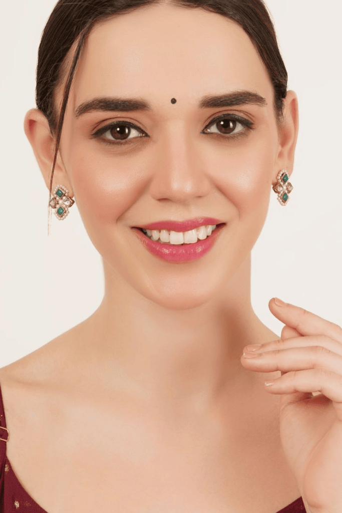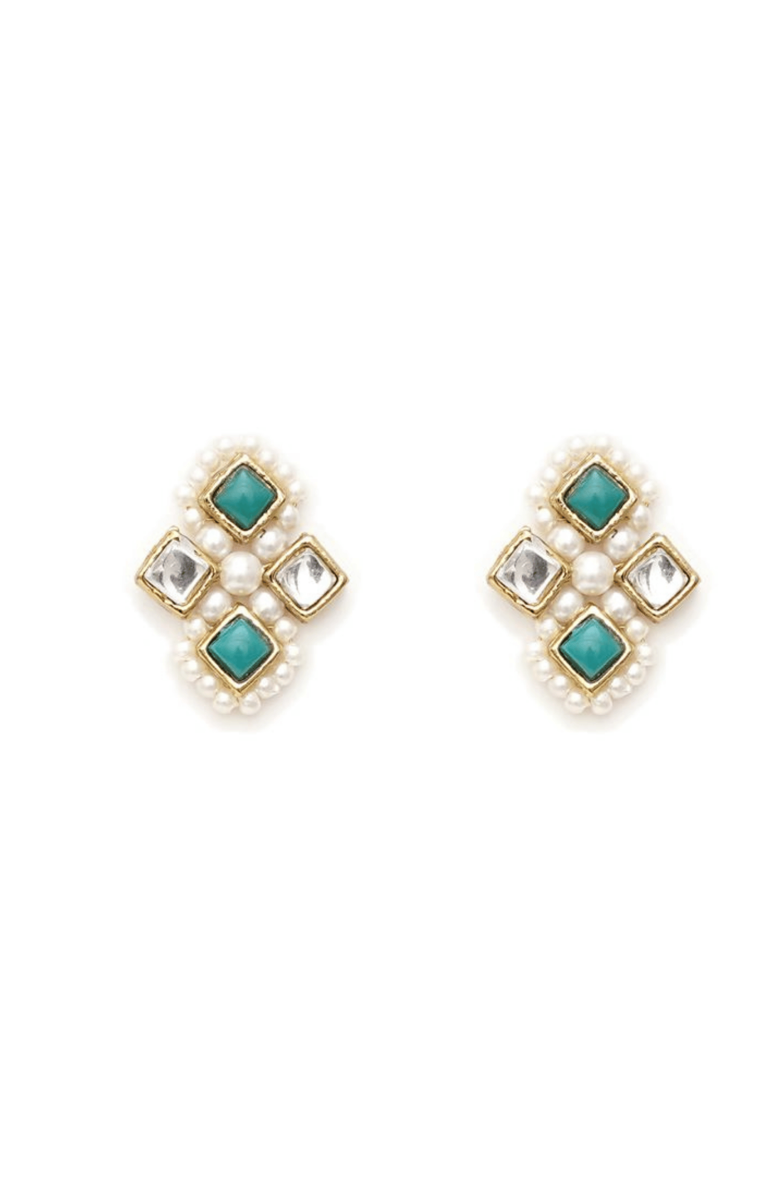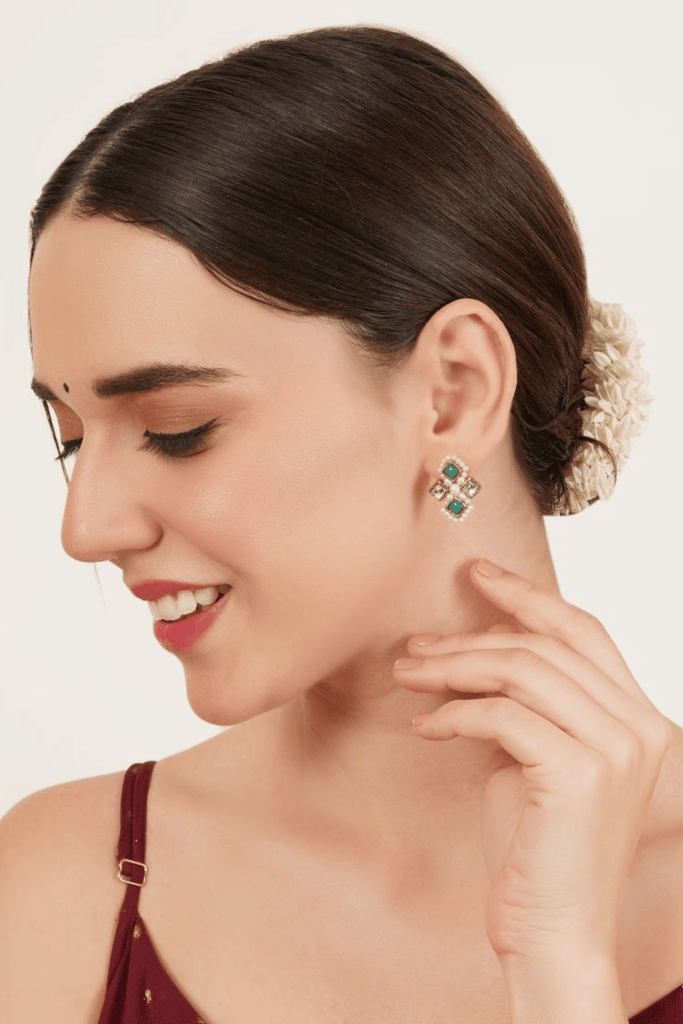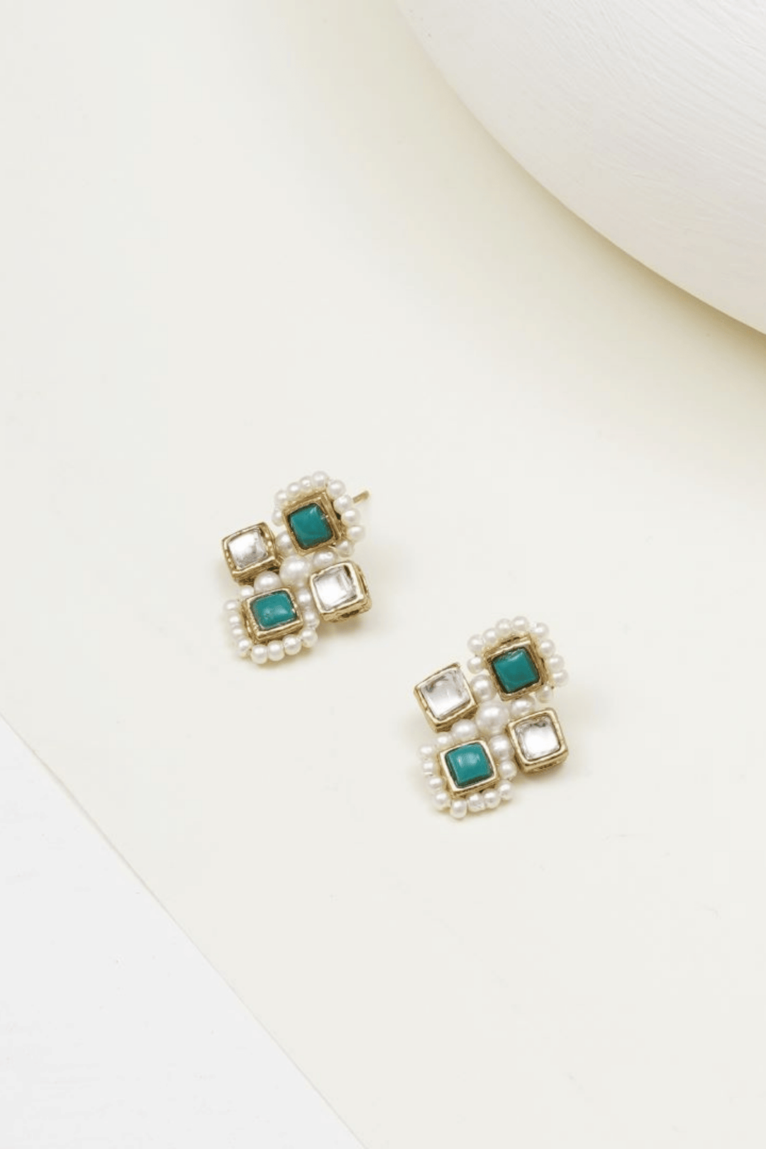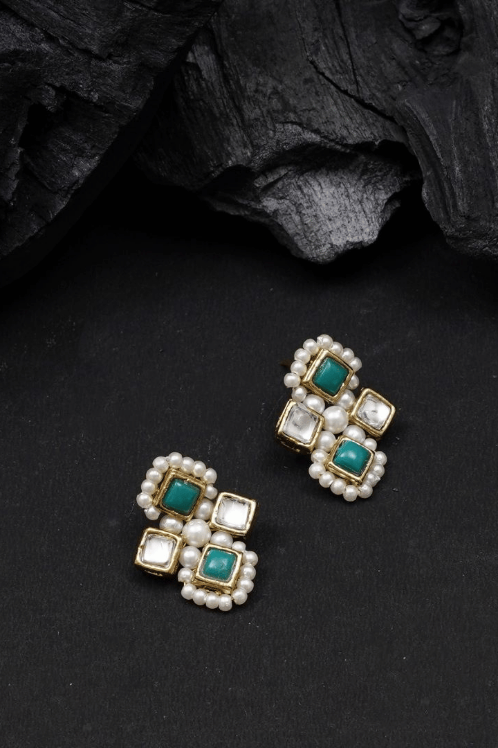 Delicate yet eye-catching, the Mint Royale Pearl Studs feature a square design with mint green and classic white kundan stones, framed by tiny pearls for a refined finish. Their symmetrical structure perfectly blends modern minimalism with traditional elegance, making them ideal for everyday ethnic wear or subtle festive styling.