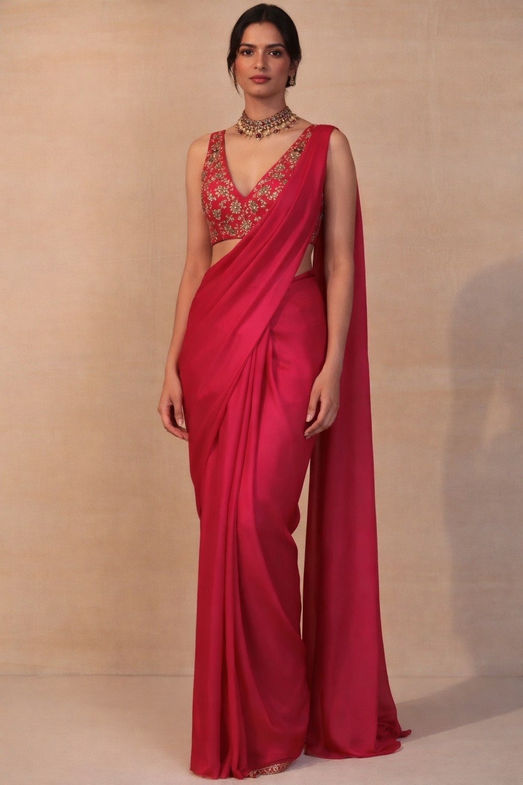 The striking hot pink hue radiates energy and charm, making it perfect for parties, weddings, or evening celebrations. Thoughtfully pre-stitched for convenience, Glam Rose ensures a neat, polished fall in minutes, paired with a coordinated blouse piece that lets you style it your way.