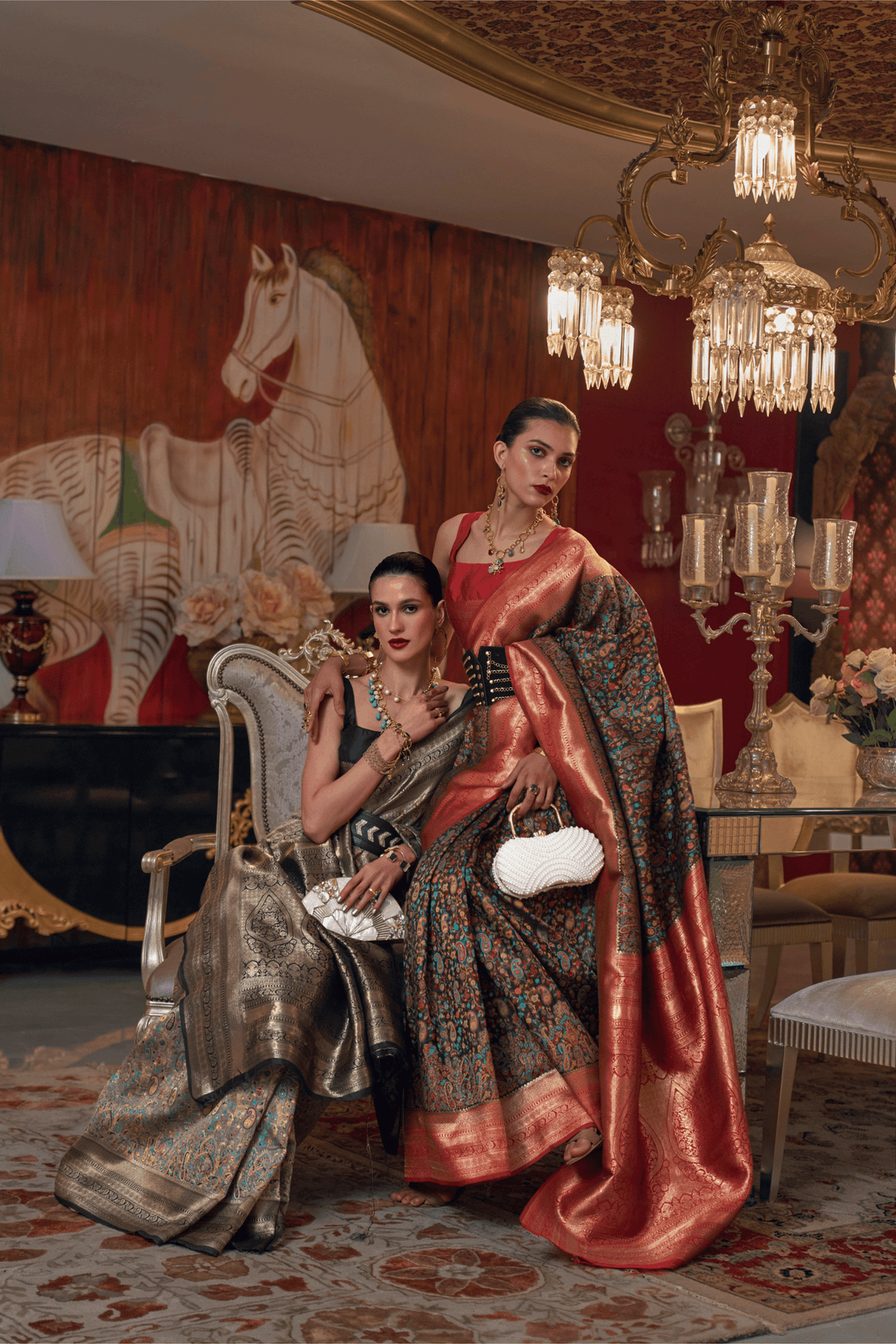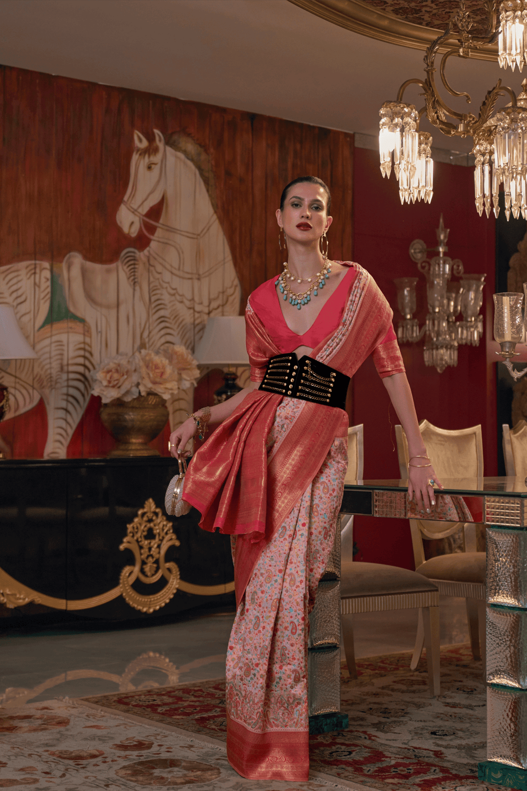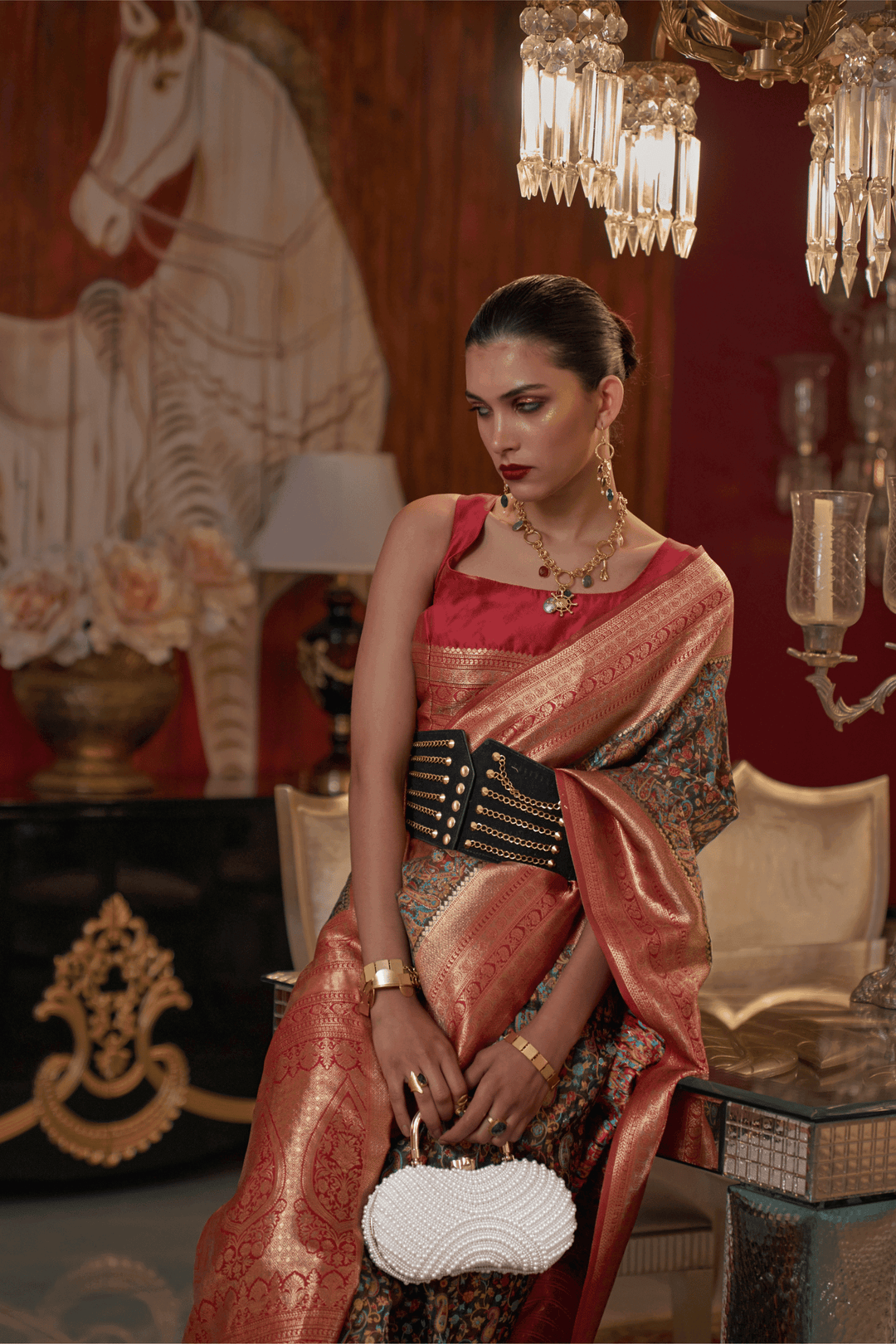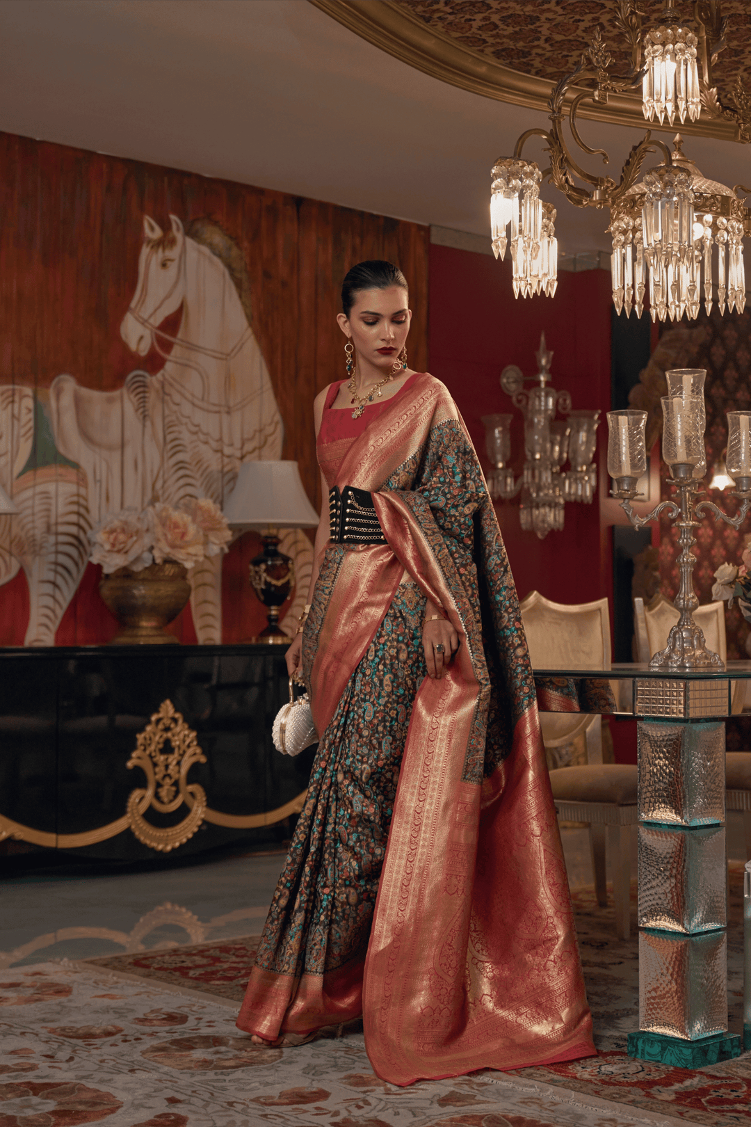 About: Introducing our vibrant ready-to-wear Kashmiri print Silk Saree, a true masterpiece that is perfect for weddings and other special occasions. The saree comes with a contrasting blouse piece and stitched waist pleats customizable till 5xl size.