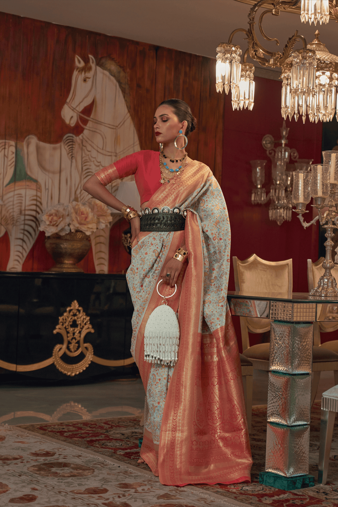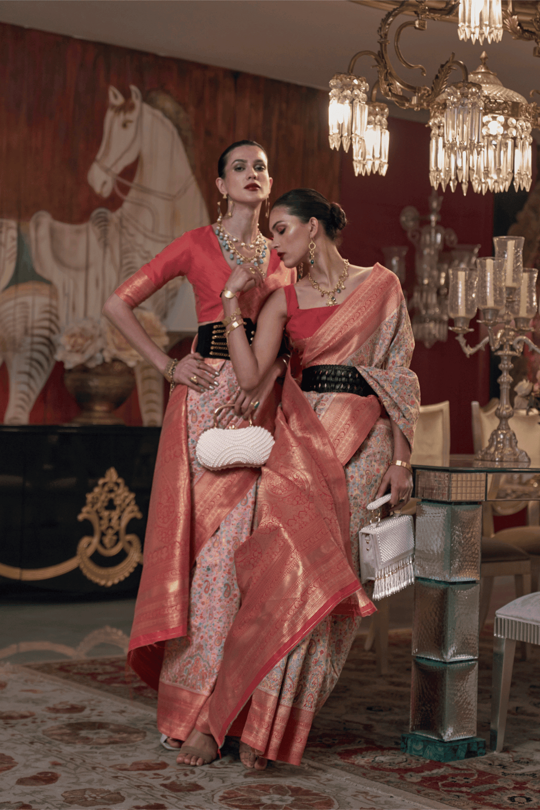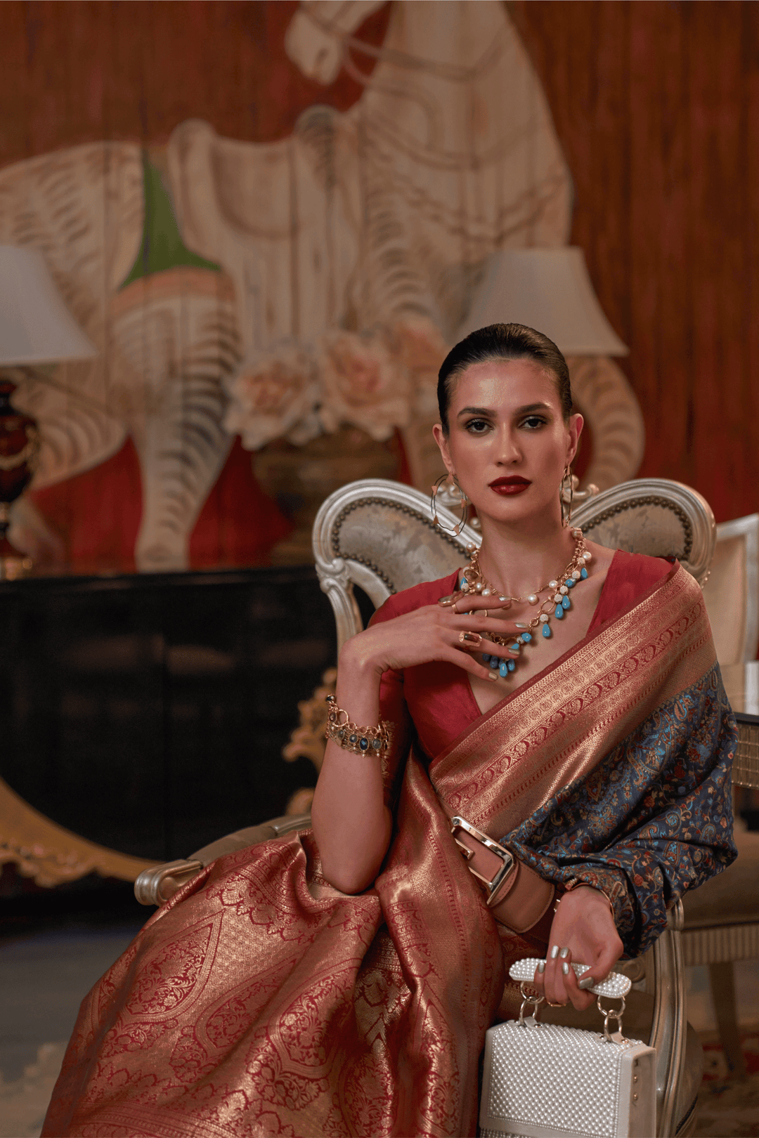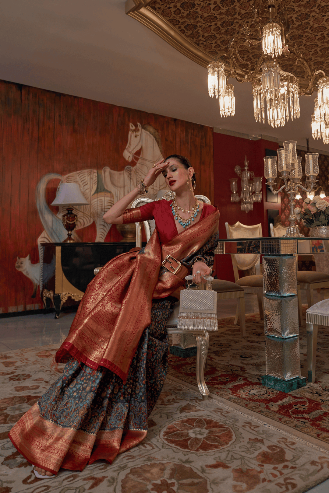 About: Introducing our vibrant ready-to-wear Kashmiri print Silk Saree, a true masterpiece that is perfect for weddings and other special occasions. The saree comes with a contrasting blouse piece and stitched waist pleats customizable till 5xl size.