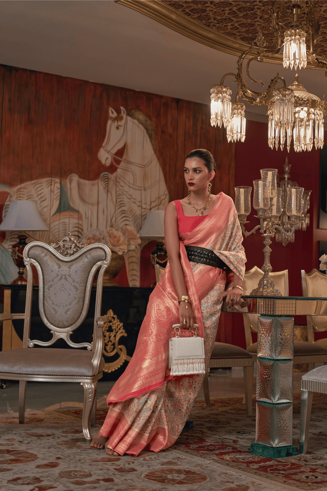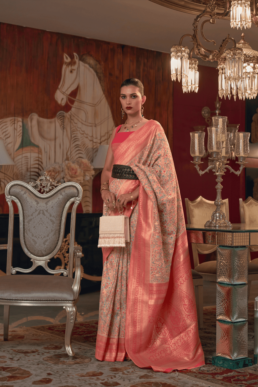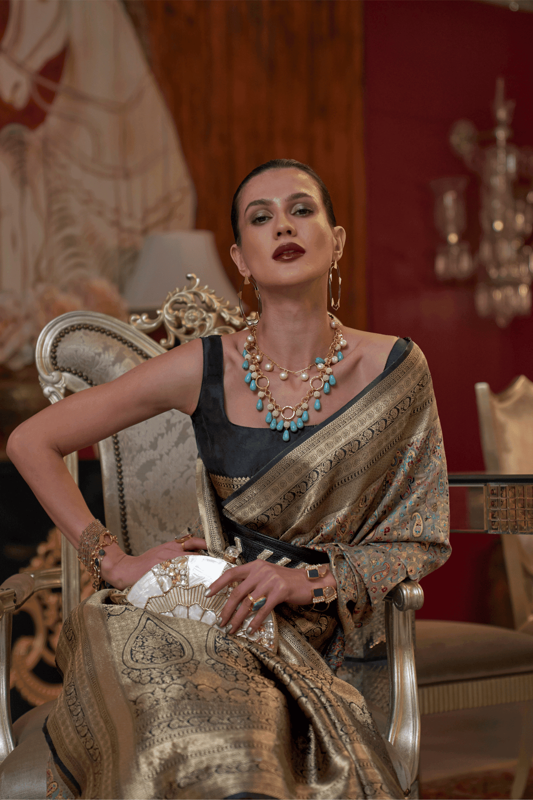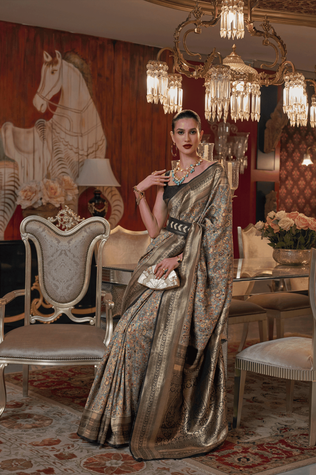 About: Introducing our vibrant ready-to-wear Kashmiri print Silk Saree, a true masterpiece that is perfect for weddings and other special occasions. The saree comes with a contrasting blouse piece and stitched waist pleats customizable till 5xl size.