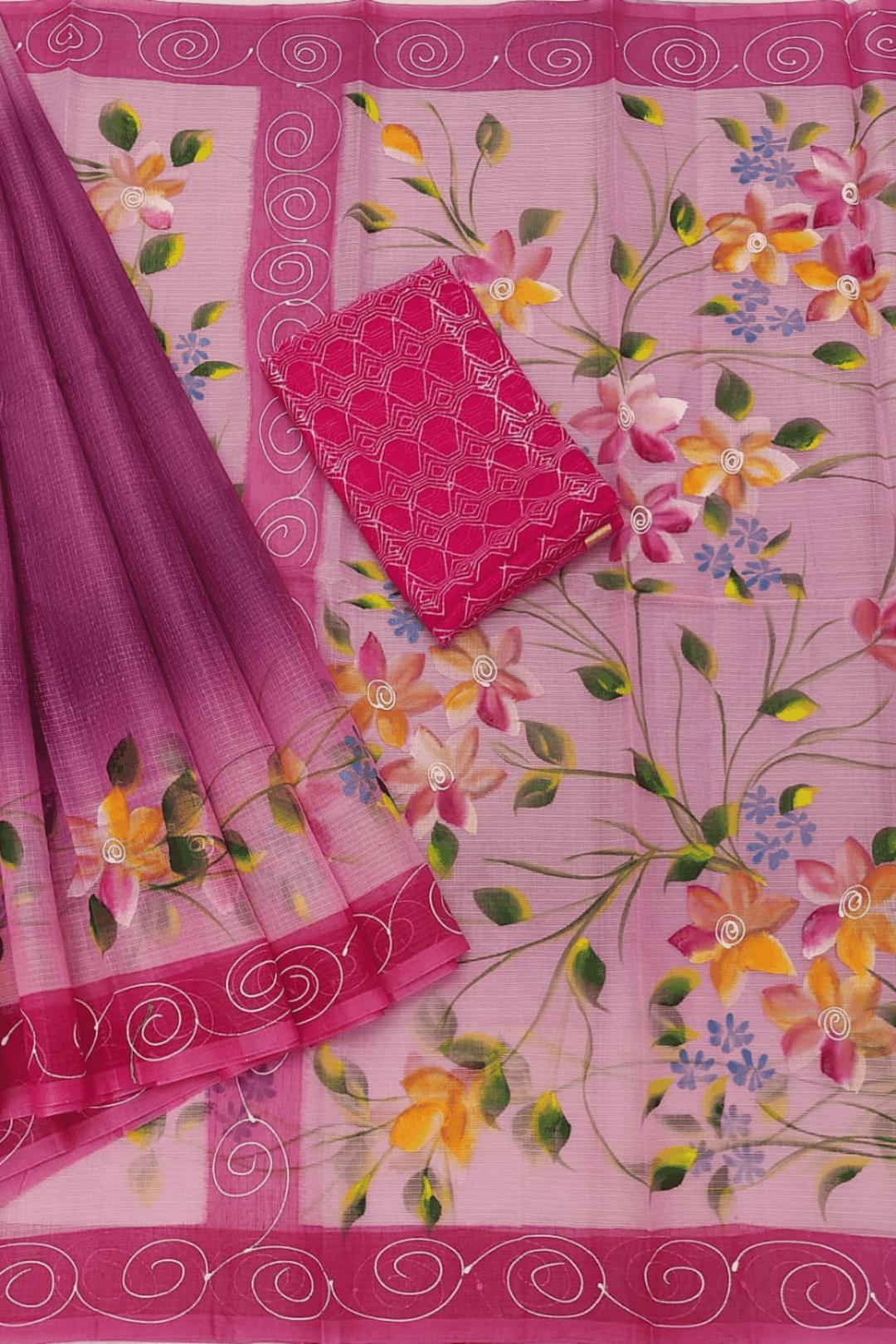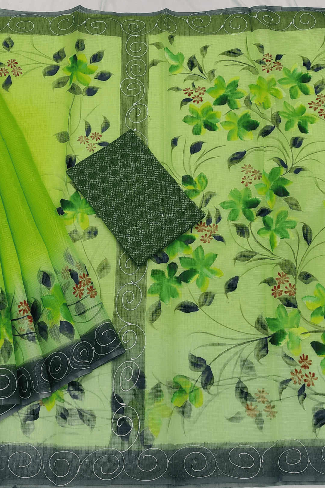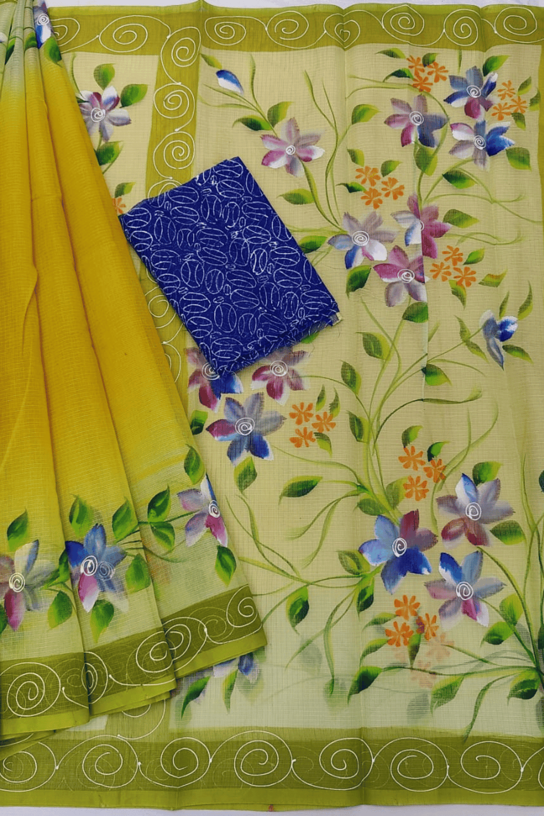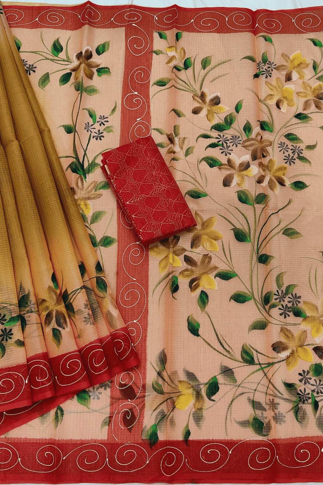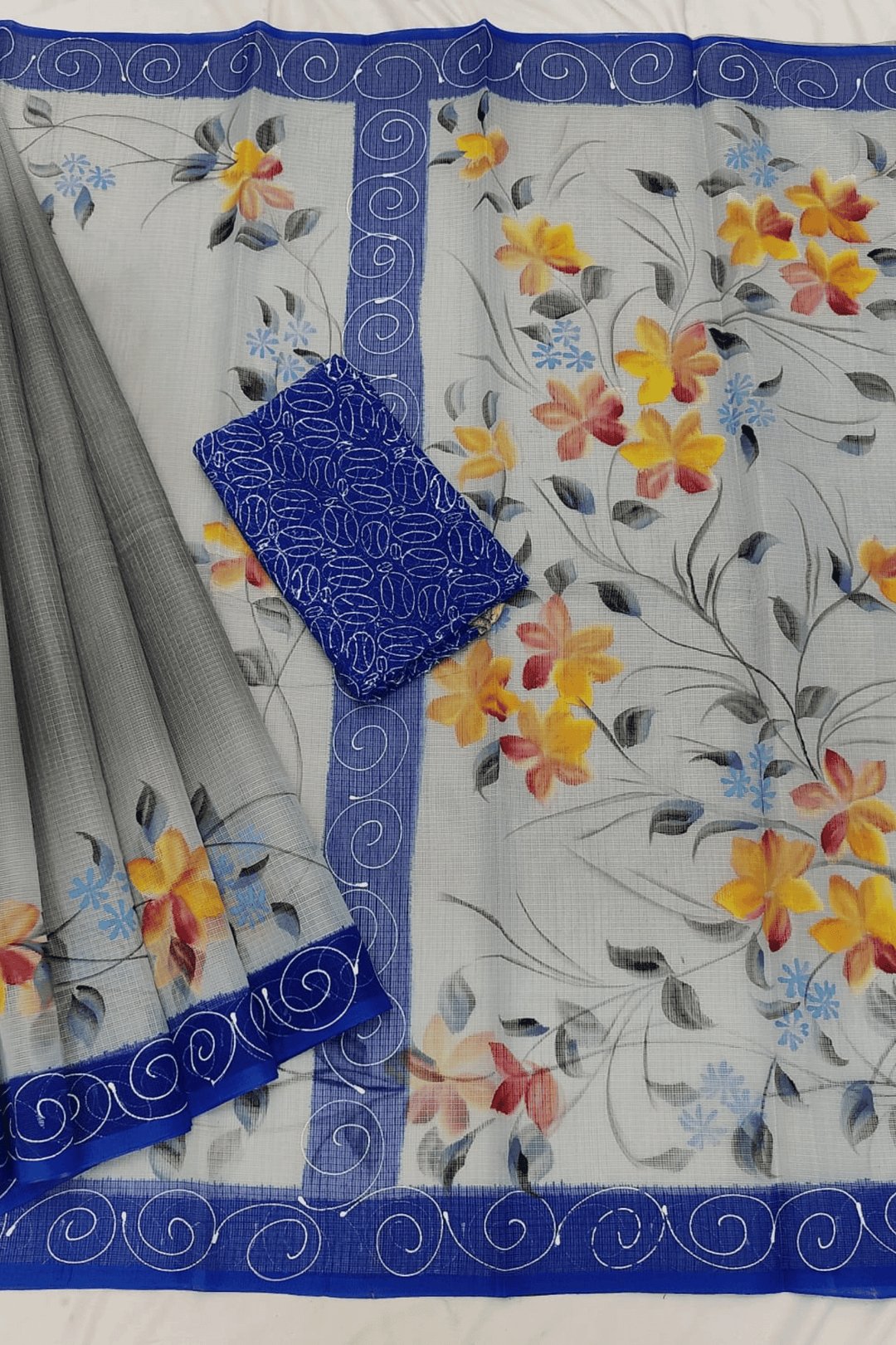 Product Information: Introducing Glamwiz Cotton Hand Painted Kota Doria Saree, a captivating collection of Kota Cotton Sarees with Contrast Blouse. Each saree is a masterpiece of artistry, featuring intricate embroidery that adds a touch of elegance and sophistication.
