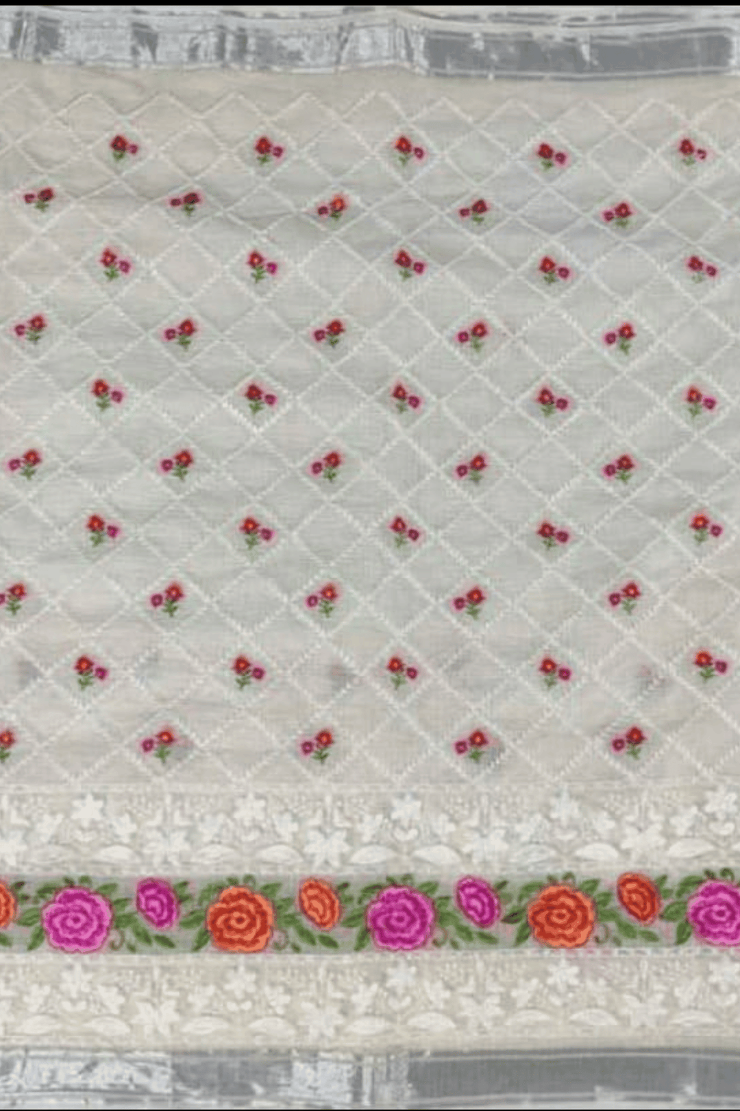 Product Information: Introducing Glamwiz Off White Floral Chikankari Kota Doria Saree a collection of exquisite Kota Doria Chicken Kari Embroidery Work Sarees with Blouse. Each saree is a testament to traditional craftsmanship, featuring intricate chicken kari embroidery work on fine Kota Doria fabric.
