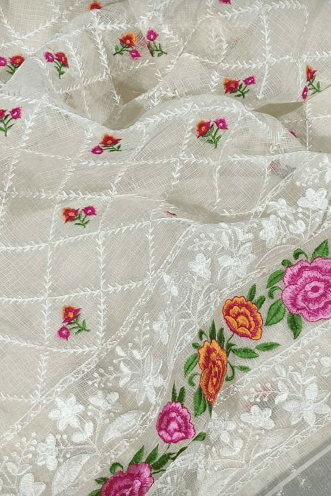 Glamwiz Floral Chikankari Kota Doria Saree- Off White