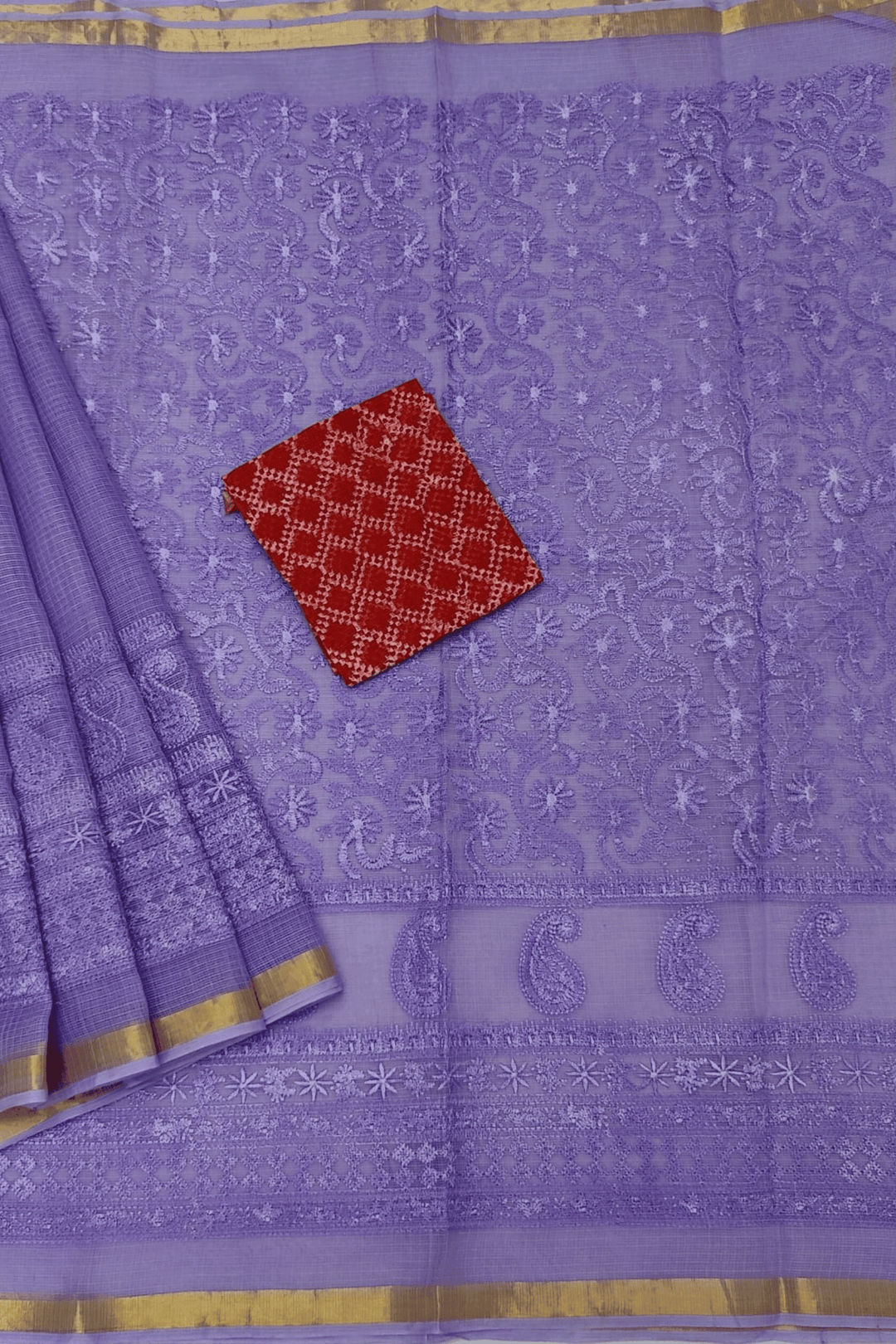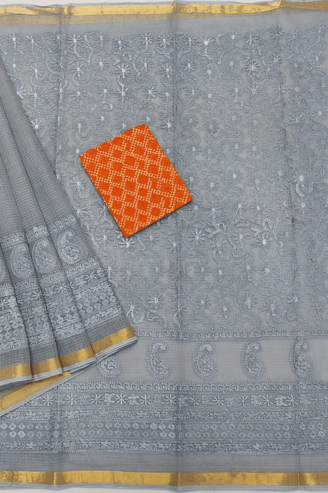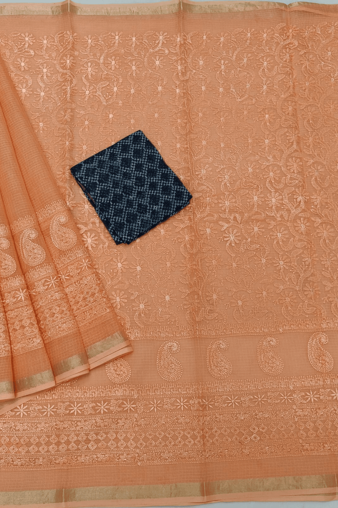 The saree is further elevated by Chikankari, the centuries-old embroidery art from Lucknow. Known for its delicate, hand-done stitches, Chikankari brings an intricate charm to the soft fabric. Each motif—whether floral vines, paisleys, or geometric details—is a testament to the artisan’s skill. Together with Kota Doria’s airy weave, the embroidery adds depth, dimension, and sophistication to the drape, making every saree a wearable piece of art.