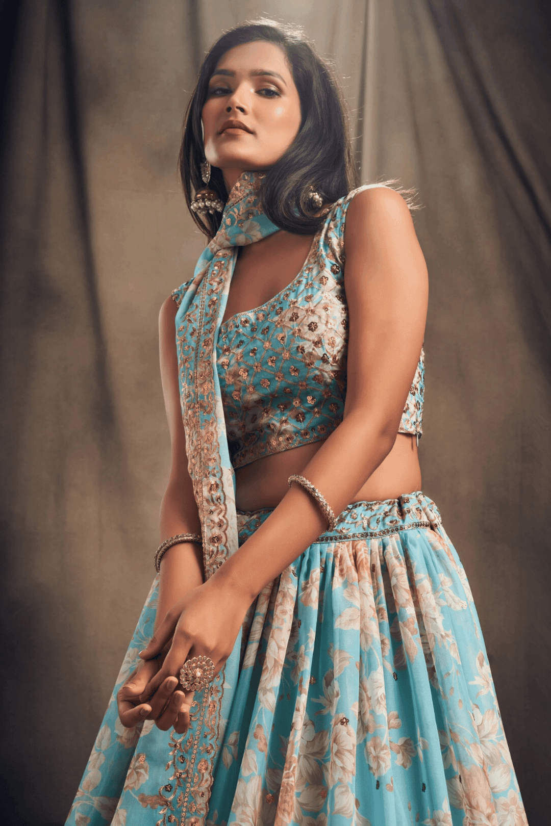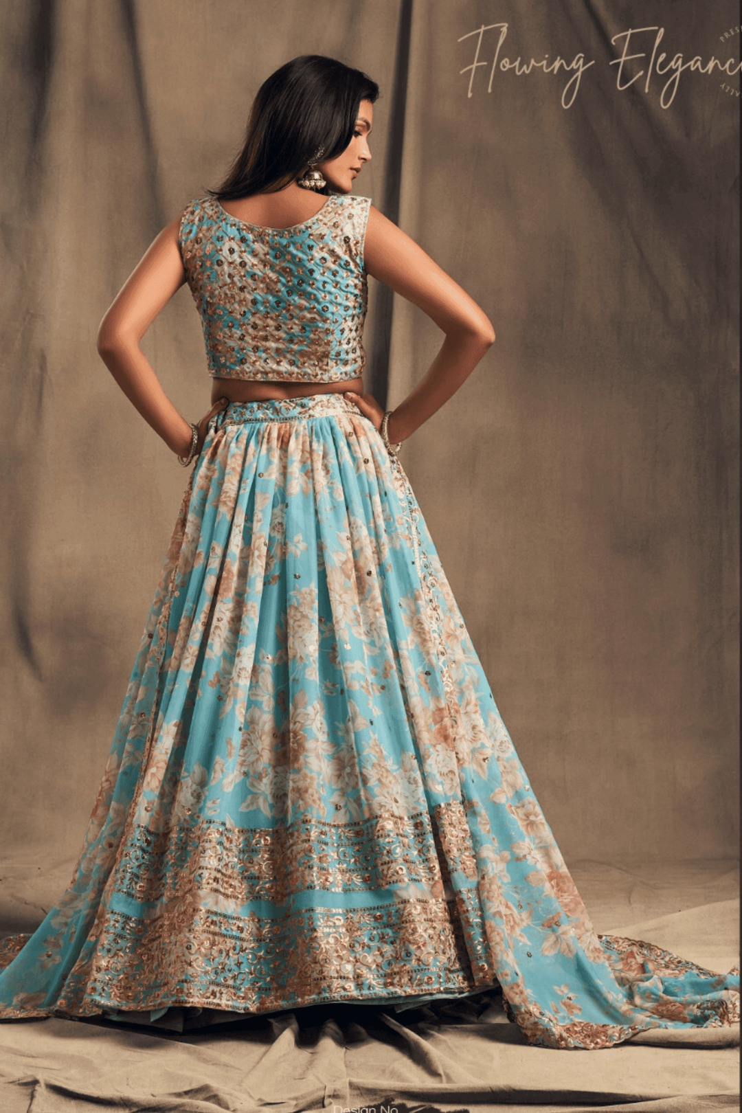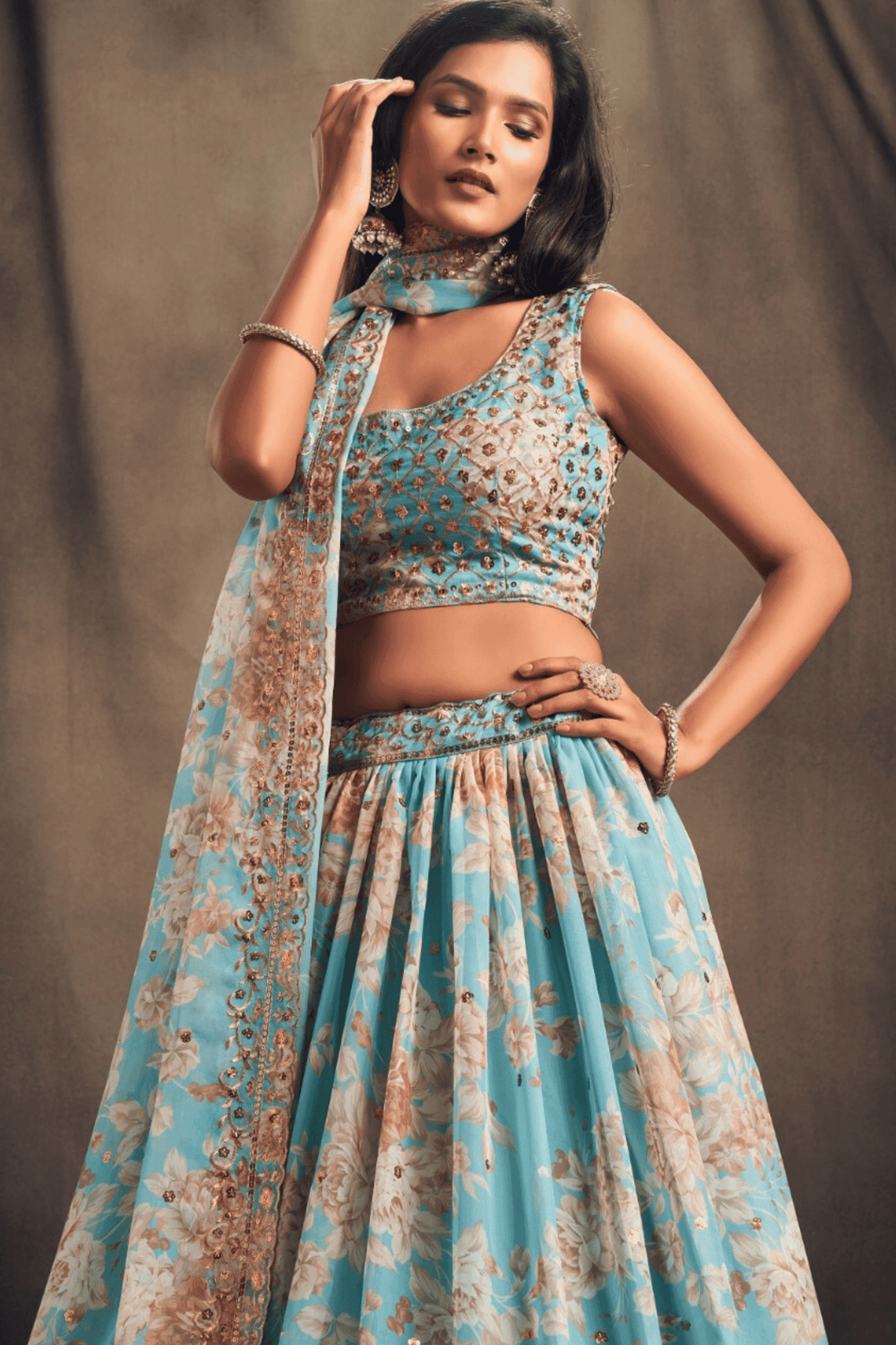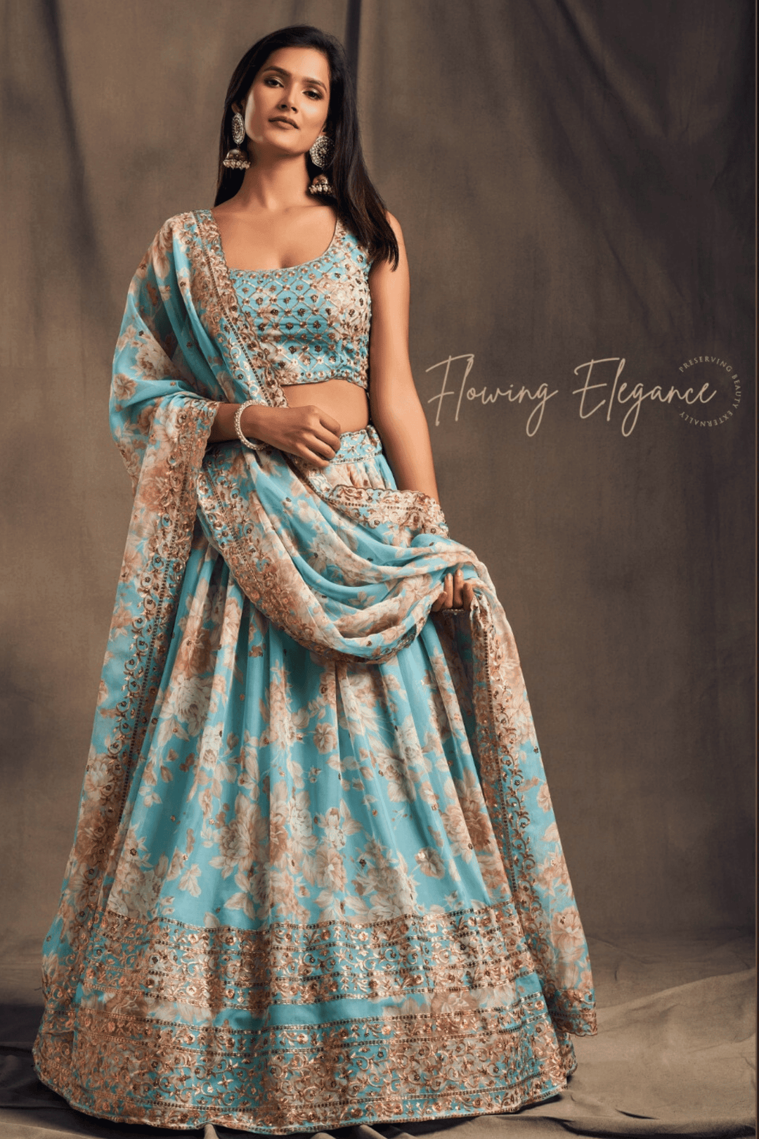 Introducing Glamwiz Dove Blue Organza Lehenga Set, this lehenga stuns with beautiful floral print. Perfect for summer weddings or festive occasions.