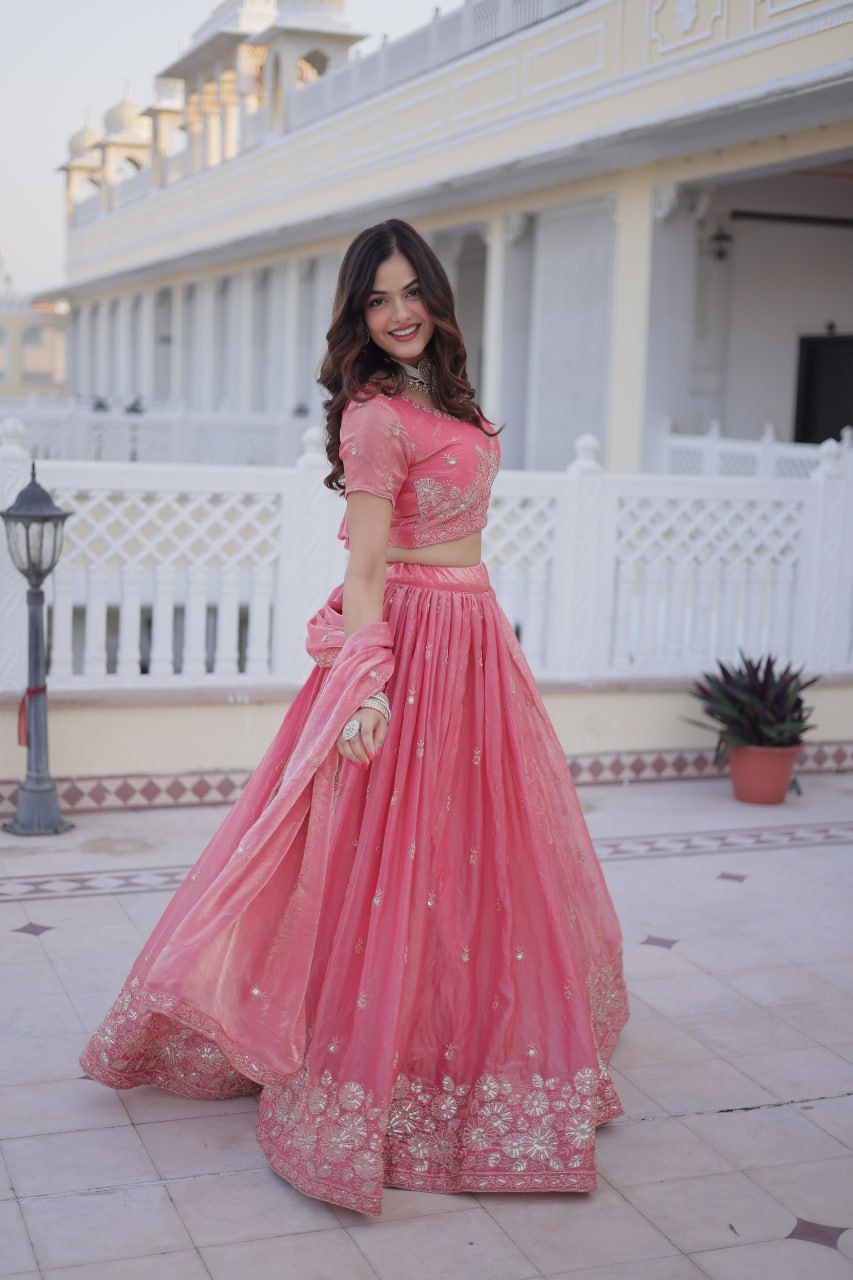 Gracefully radiant and undeniably regal, the Maison Rosé Lehenga Set is a celebration of feminine elegance wrapped in luxurious detail. Crafted in premium Fendi silk, this pink ensemble is richly adorned with heavy sequins and intricate zari thread embroidery, creating a luminous finish that captures light with every movement.