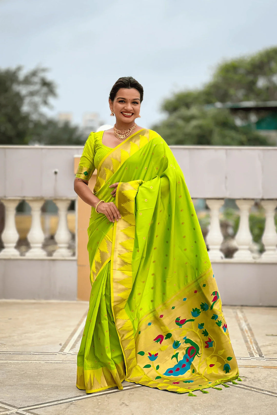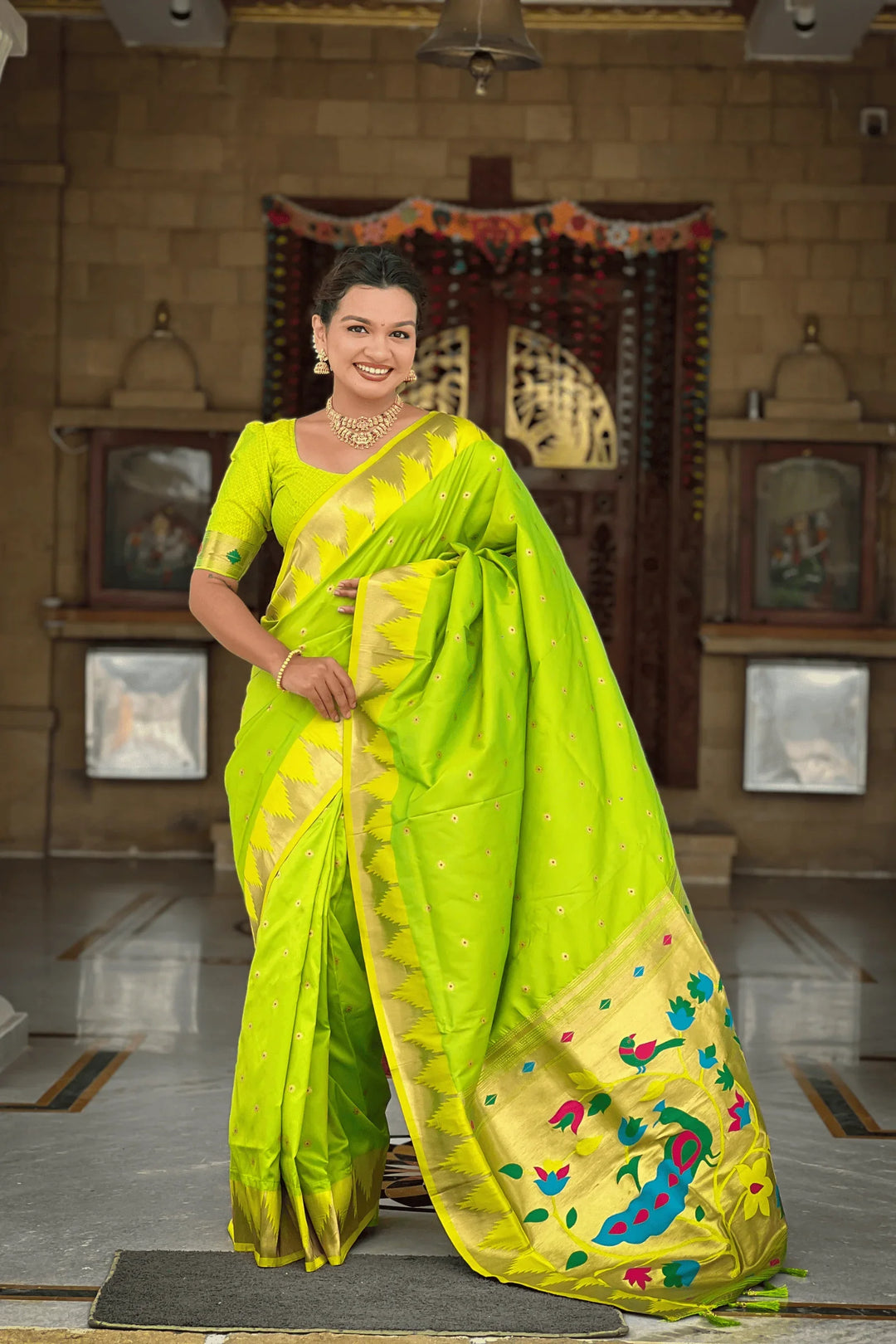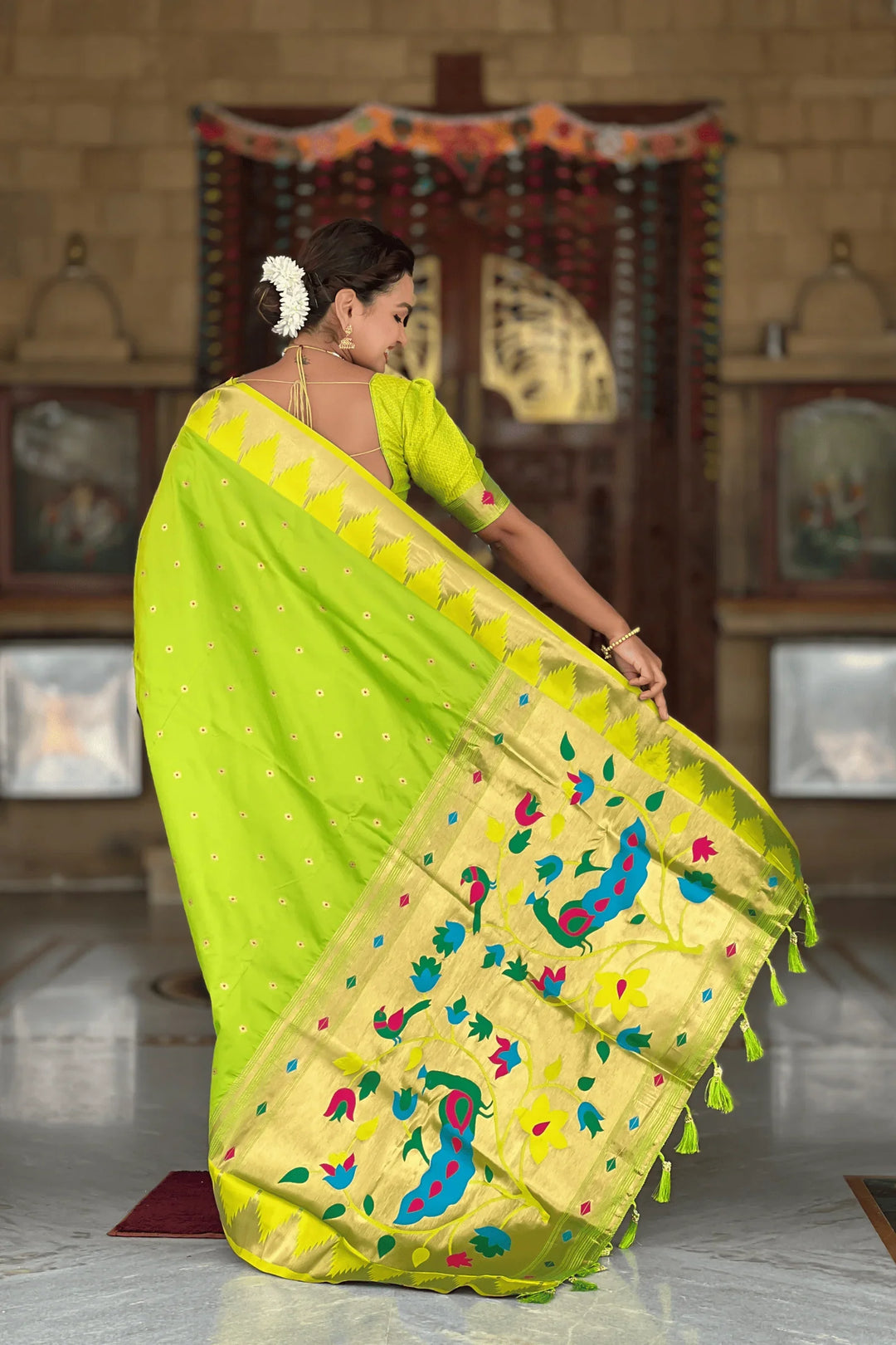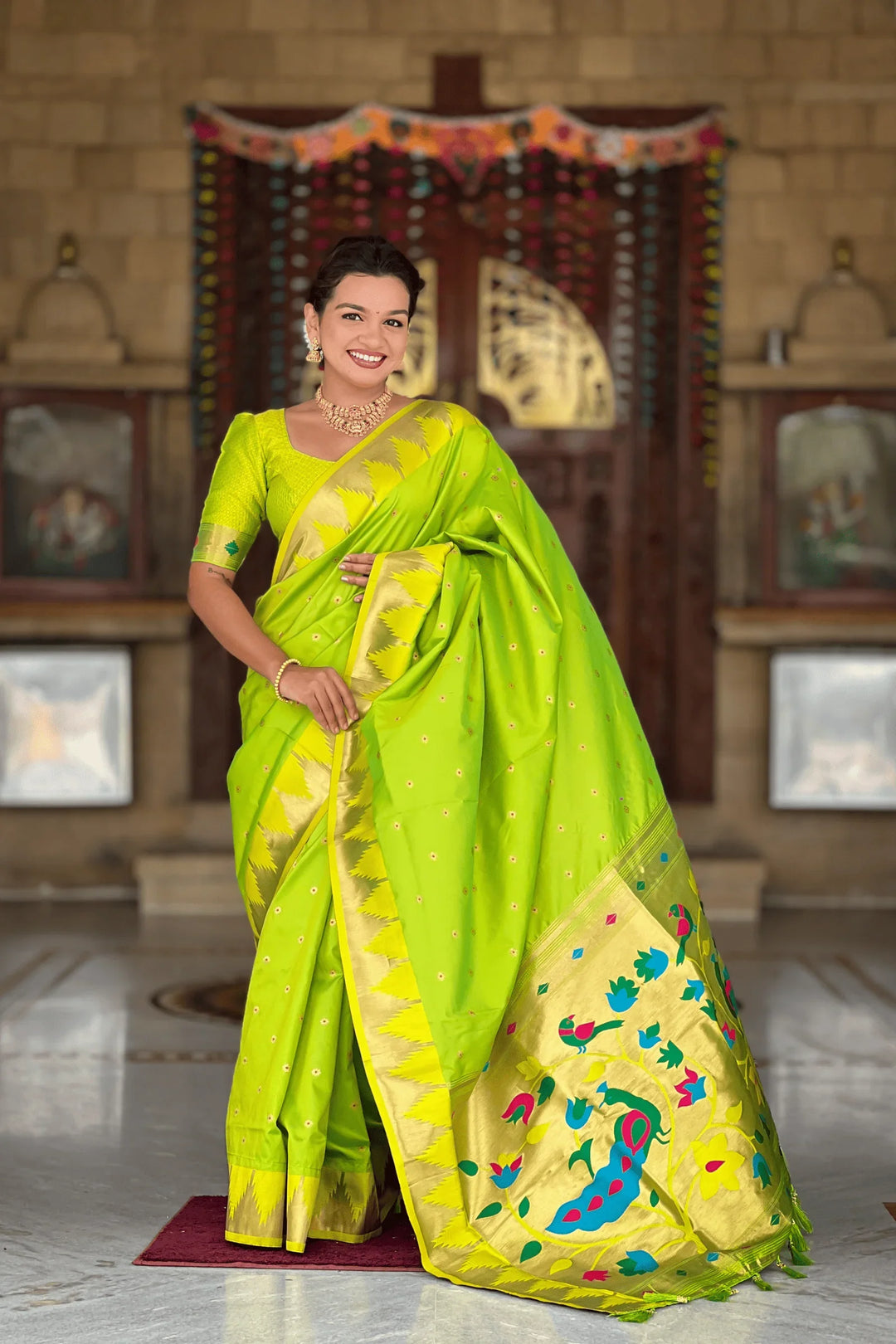 Imperial Peacock | Ready to Wear Parrot Green Paithani Silk Saree