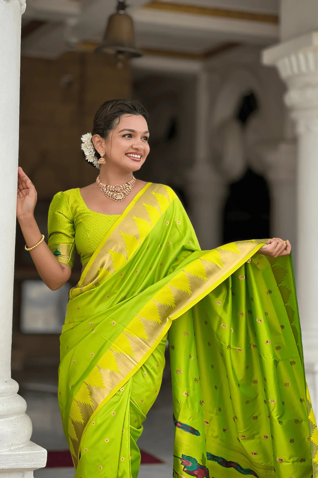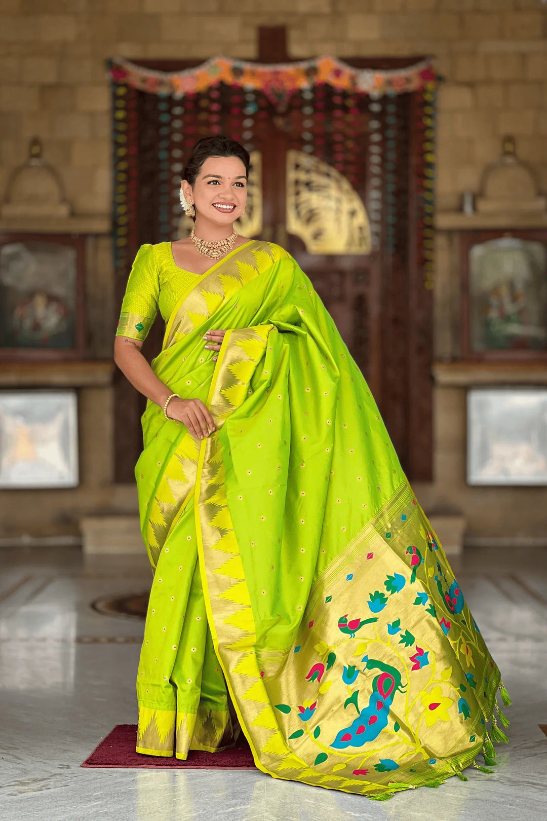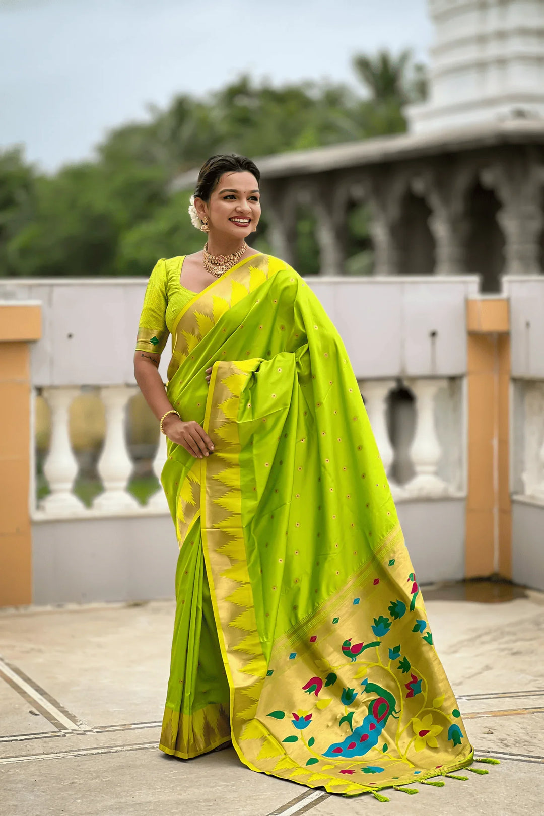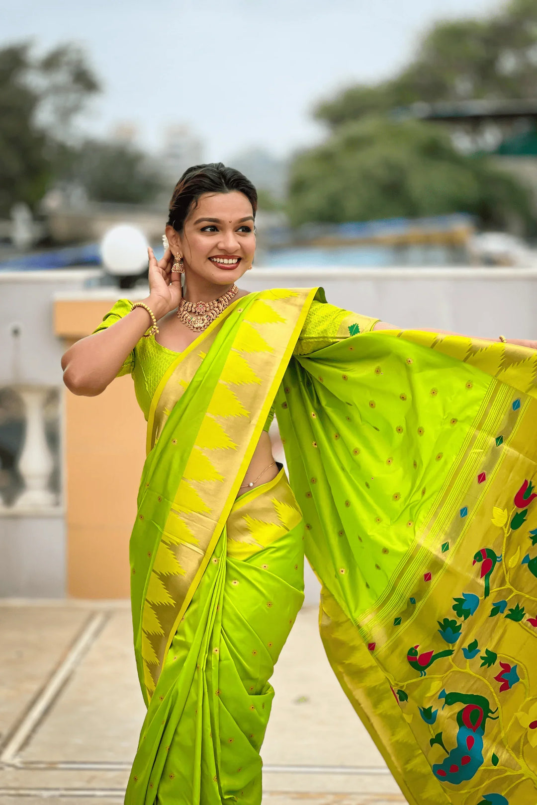 Imperial Peacock | Ready to Wear Parrot Green Paithani Silk Saree