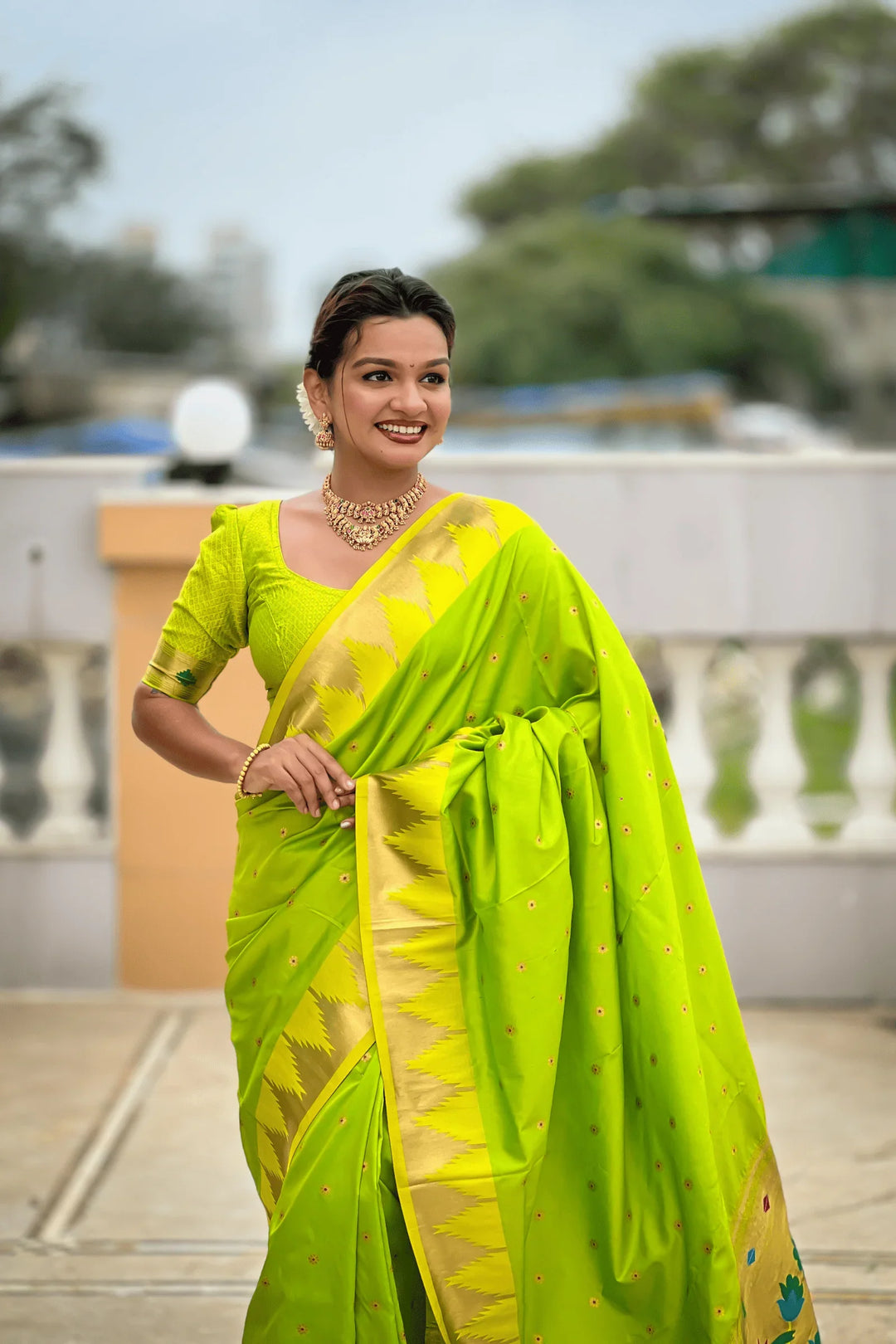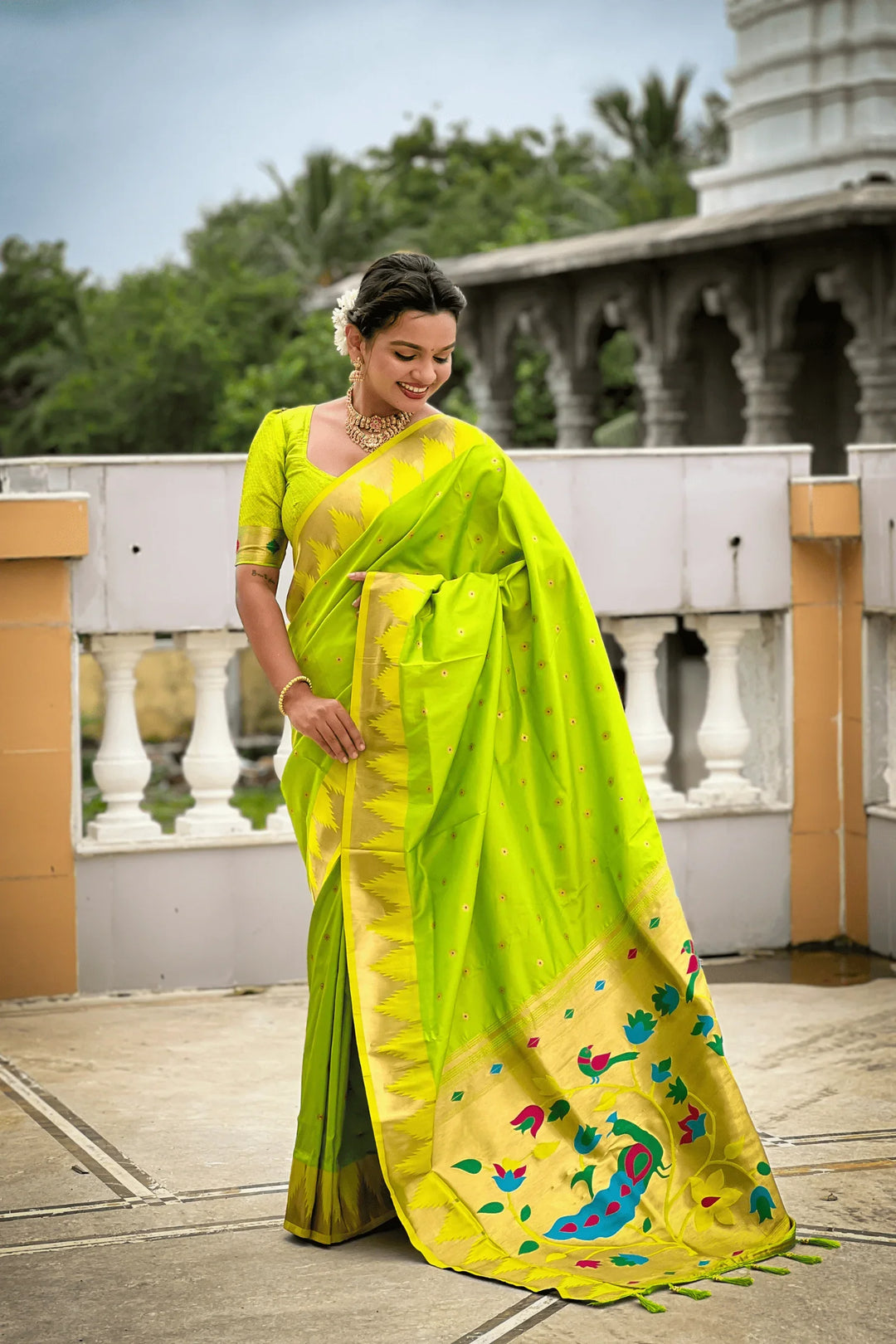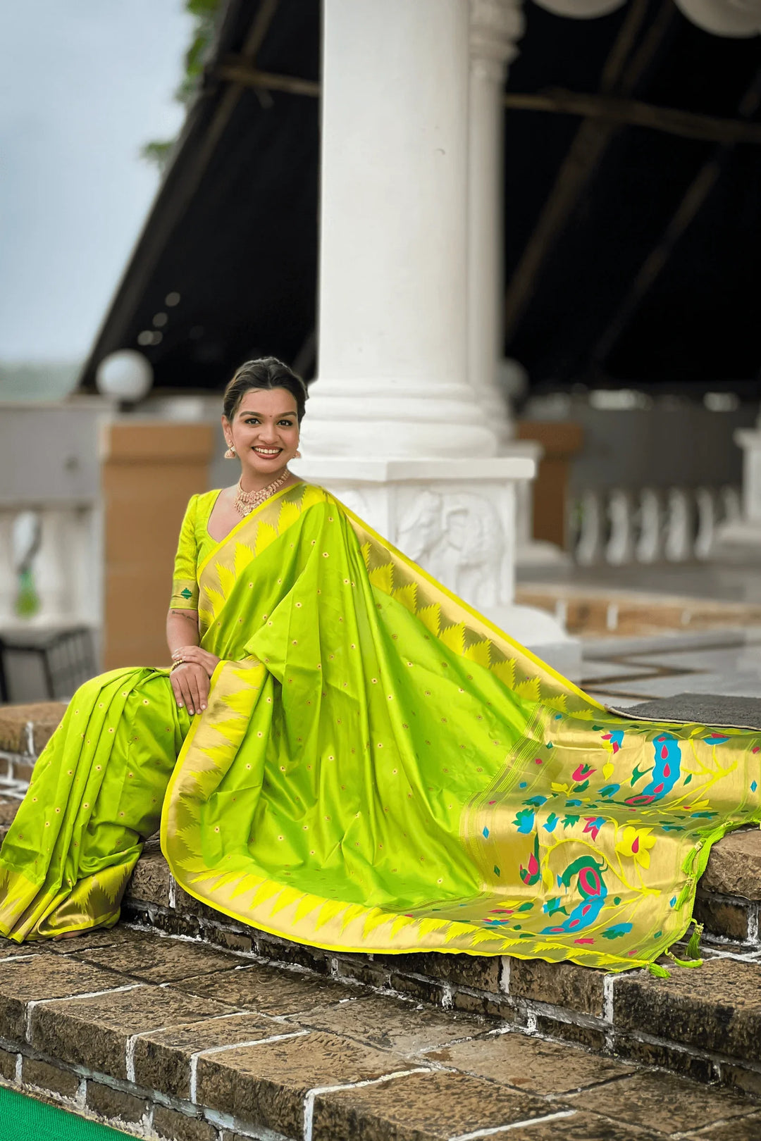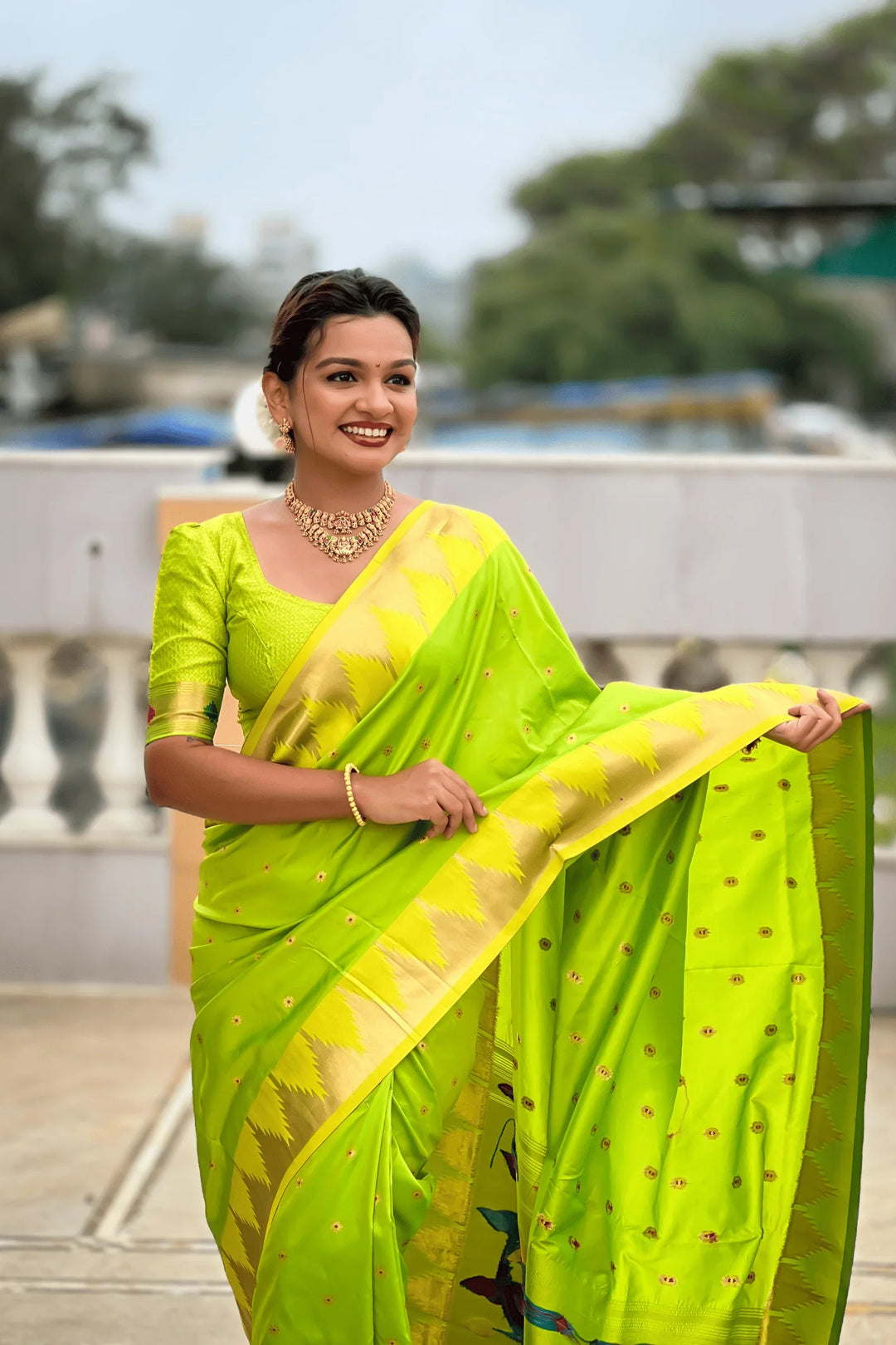 Imperial Peacock | Ready to Wear Parrot Green Paithani Silk Saree