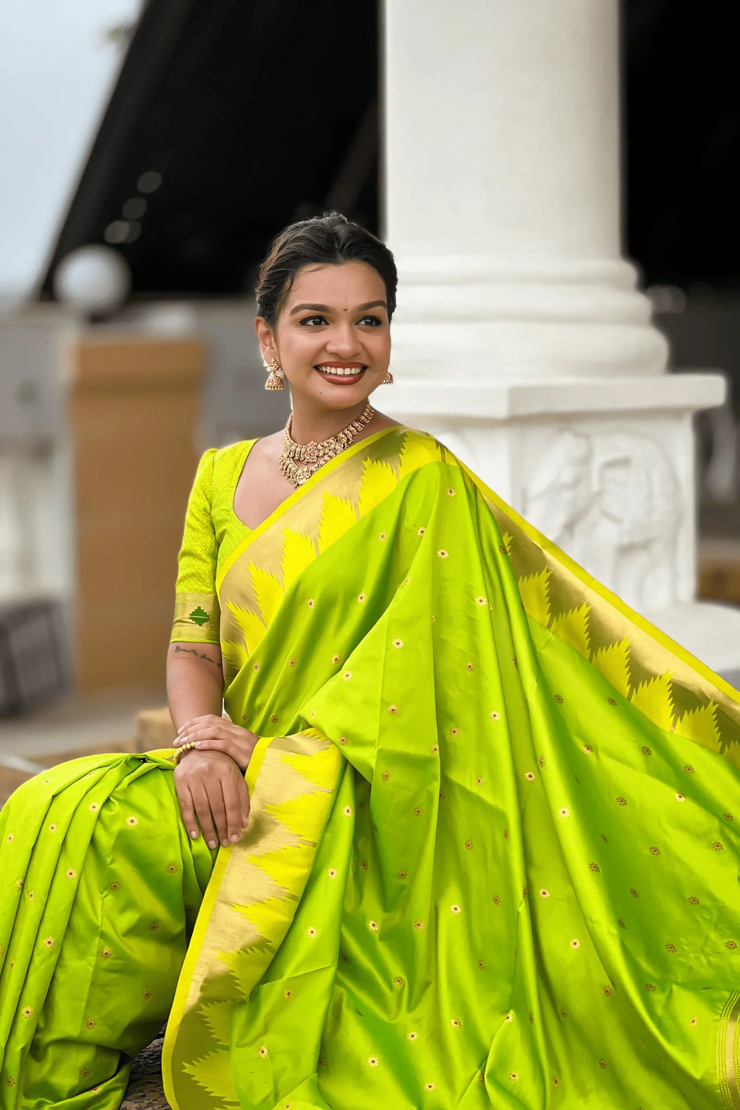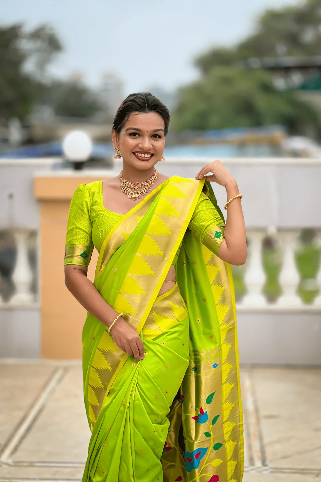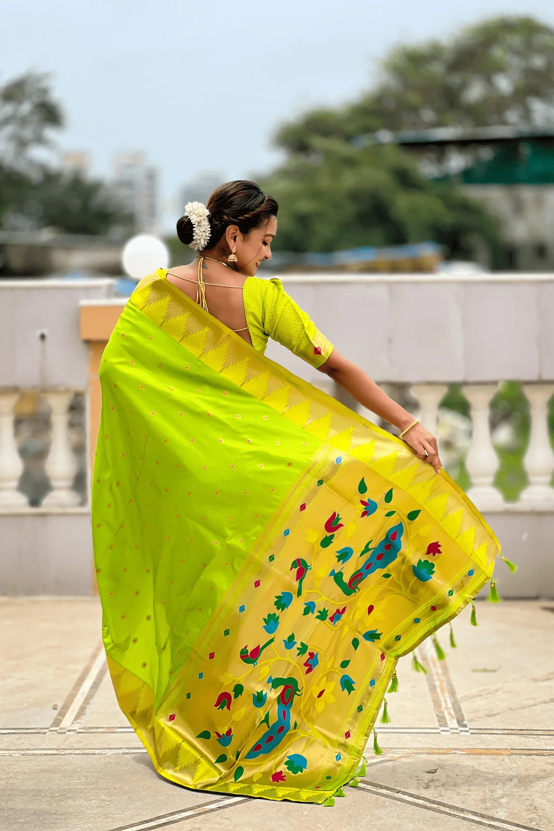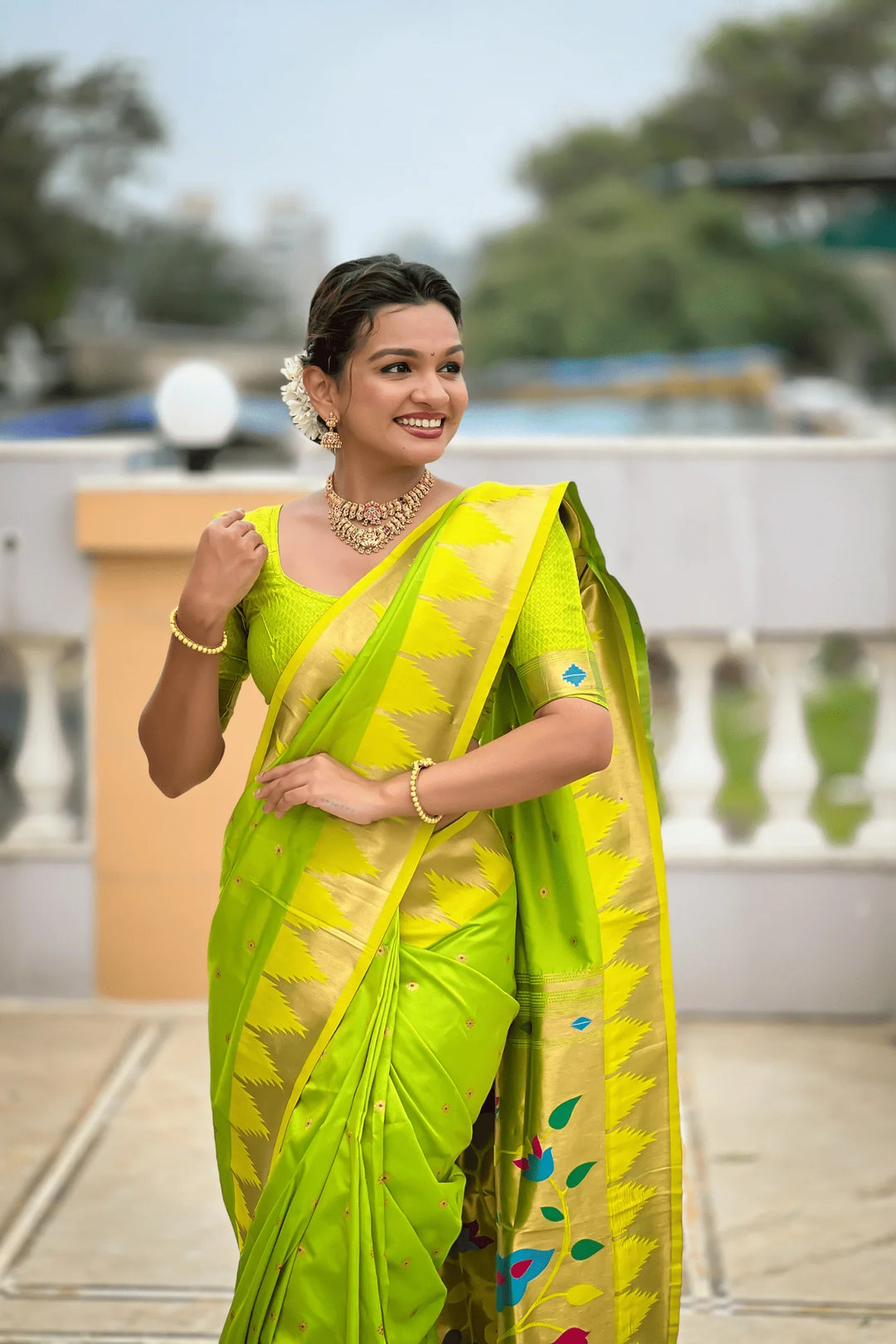 Imperial Peacock | Ready to Wear Parrot Green Paithani Silk Saree