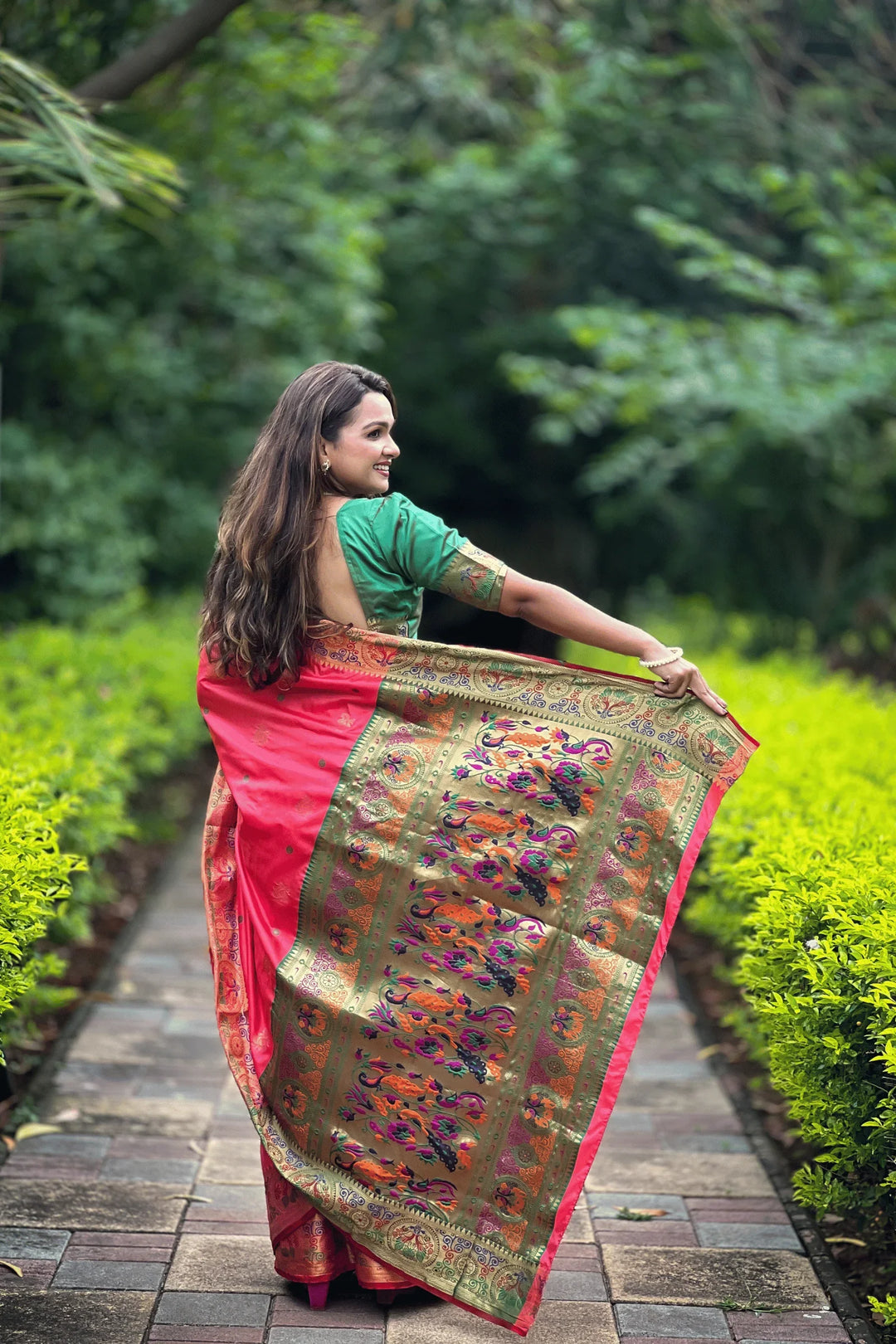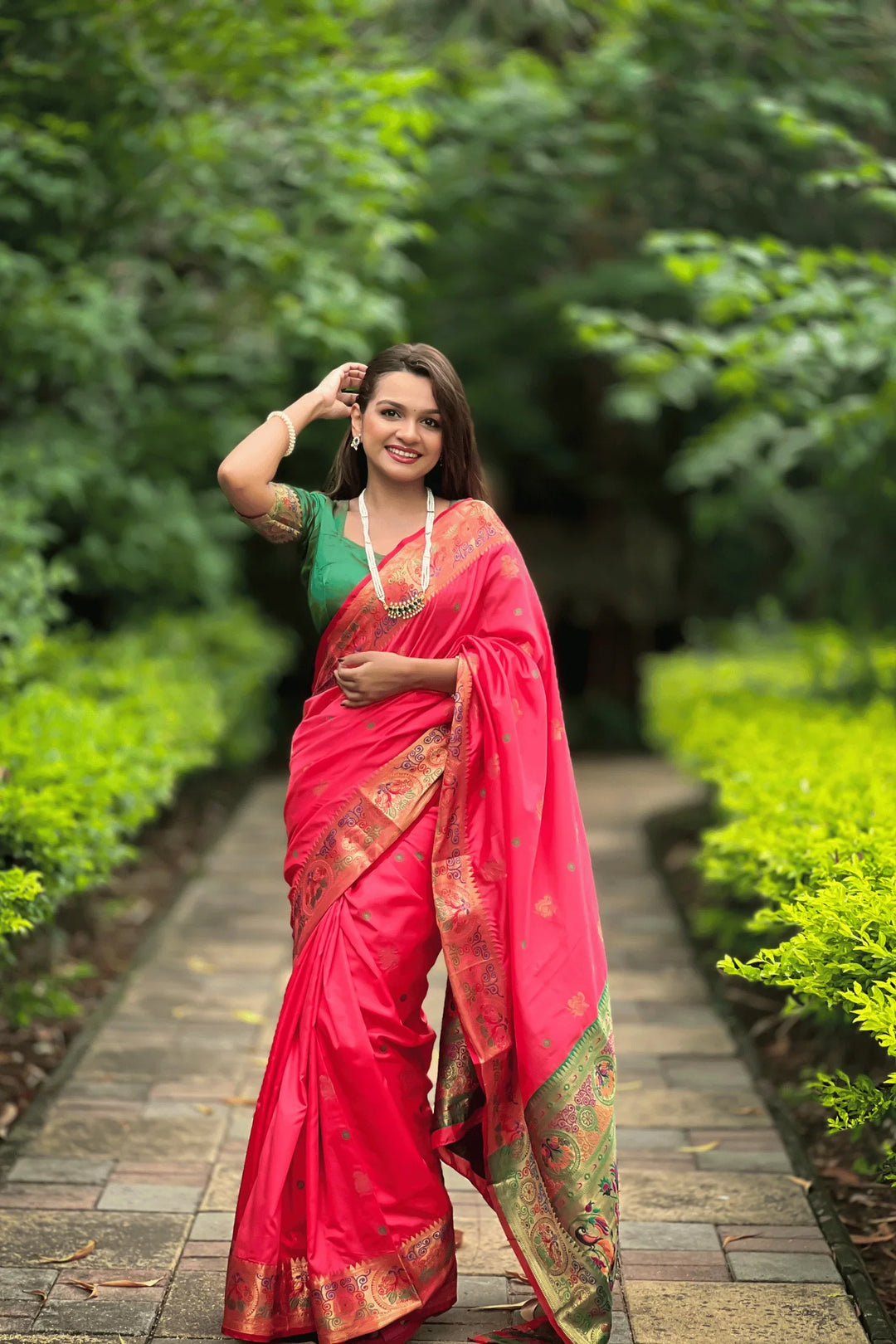 A timeless piece of art, this Pink Mayuri Silk Paithani Saree with Peacock border is a must-have for any saree lover. Handwoven in the heart of Maharashtra, this saree features intricate gold zari work and a vibrant palette. Perfect for weddings, festivals, and special occasions, this saree is sure to make you stand out.