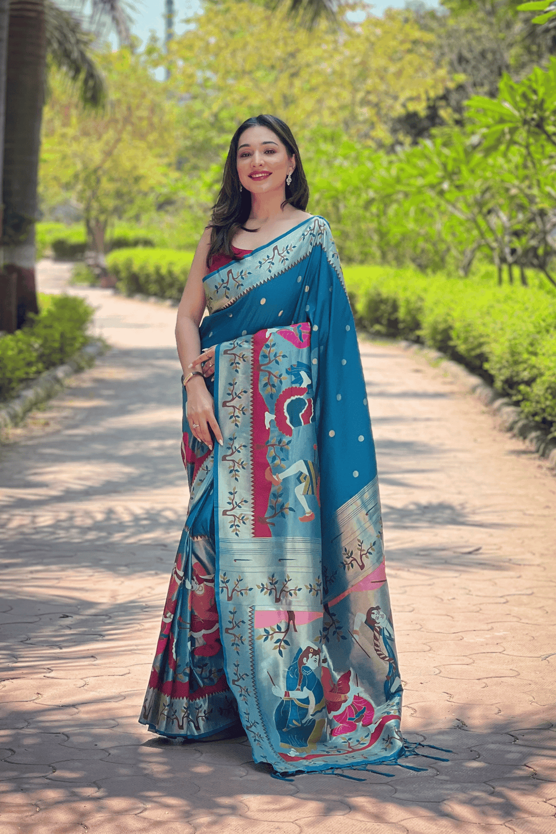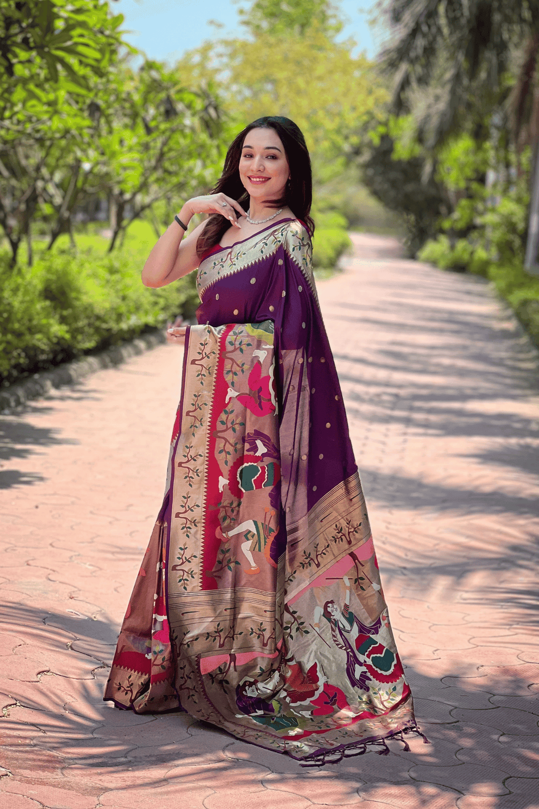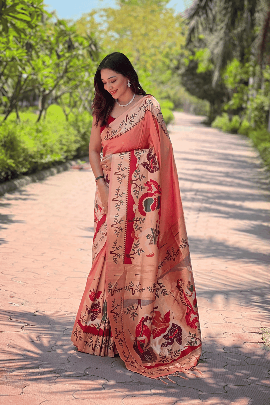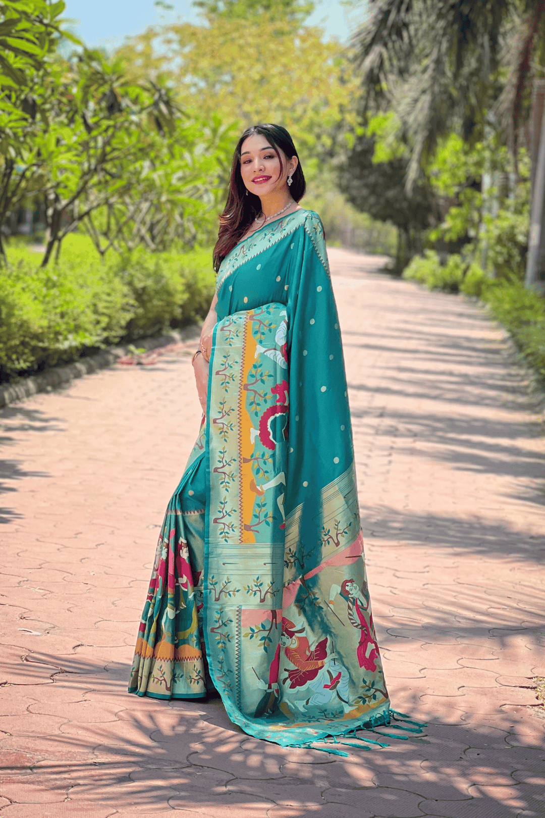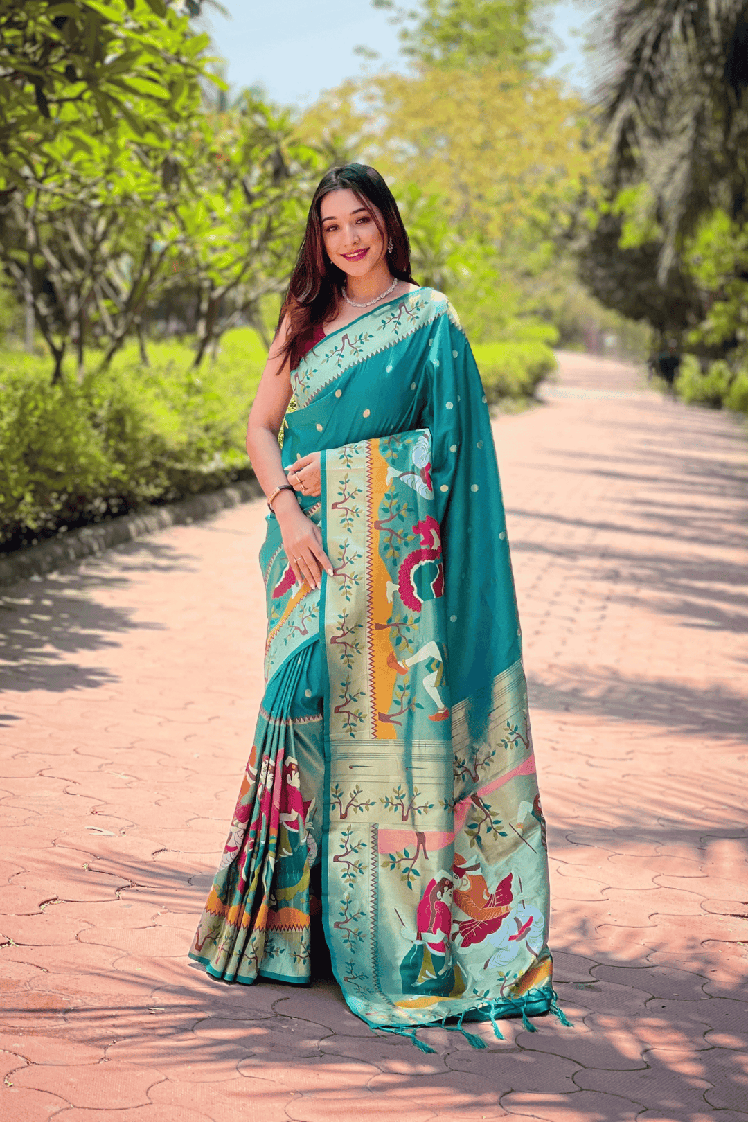 A Ready to Wear Royal Meenakari Paithani Saree with stitched pleats woven with Grand meenakari paithani border.  The soft silk saree comes along with tone-to-tone matching blouse.