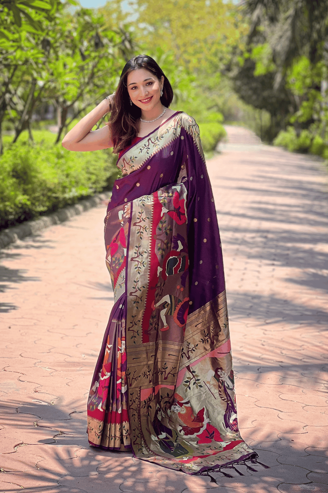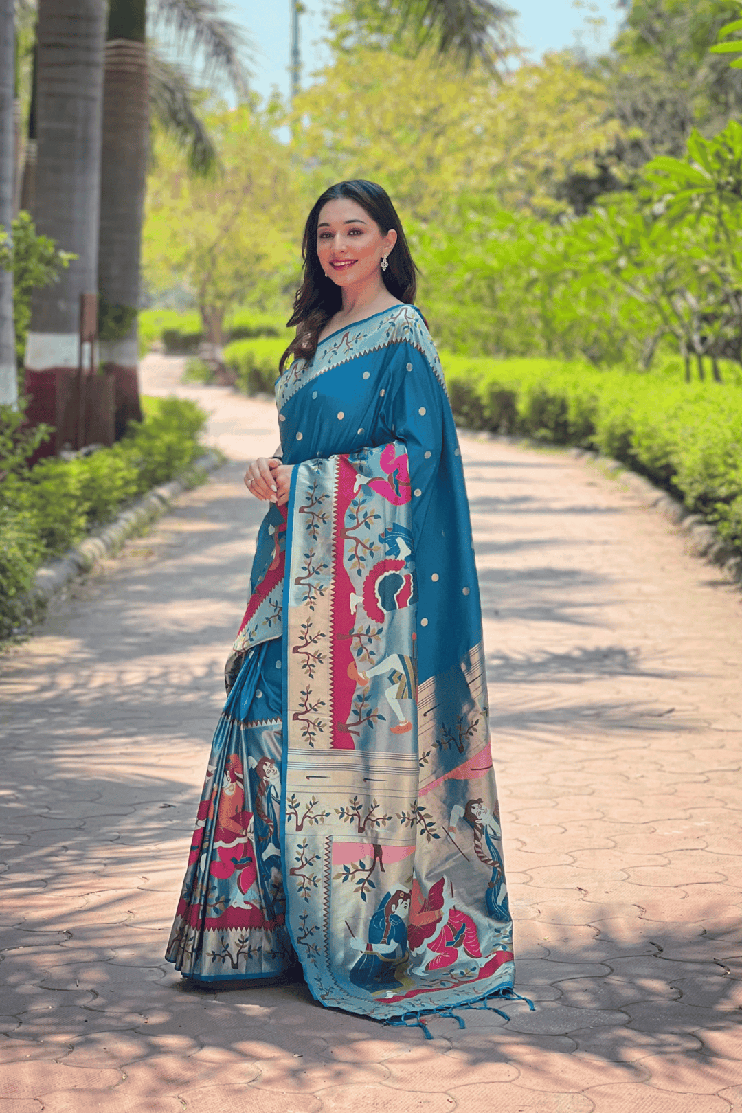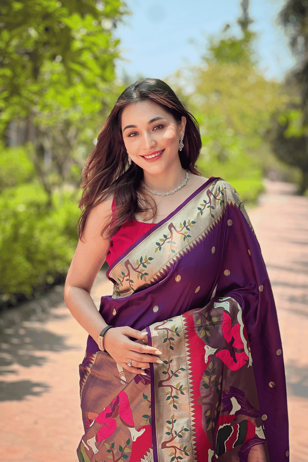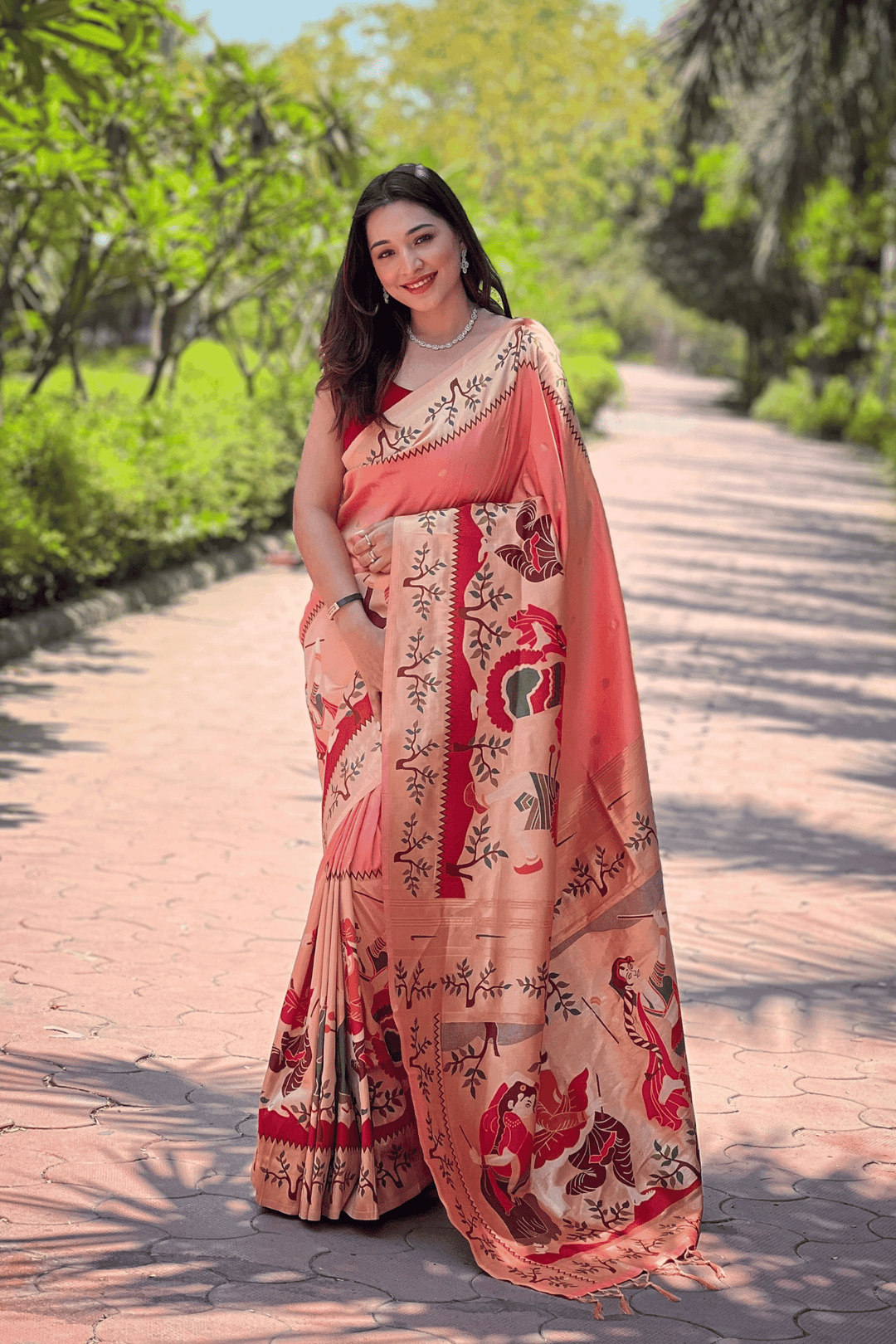 A Ready to Wear Royal Meenakari Paithani Saree with stitched pleats woven with Grand meenakari paithani border.  The soft silk saree comes along with tone-to-tone matching blouse.