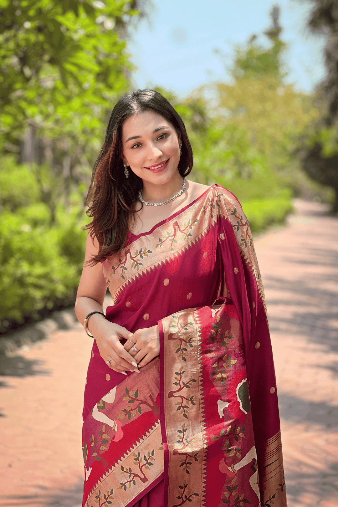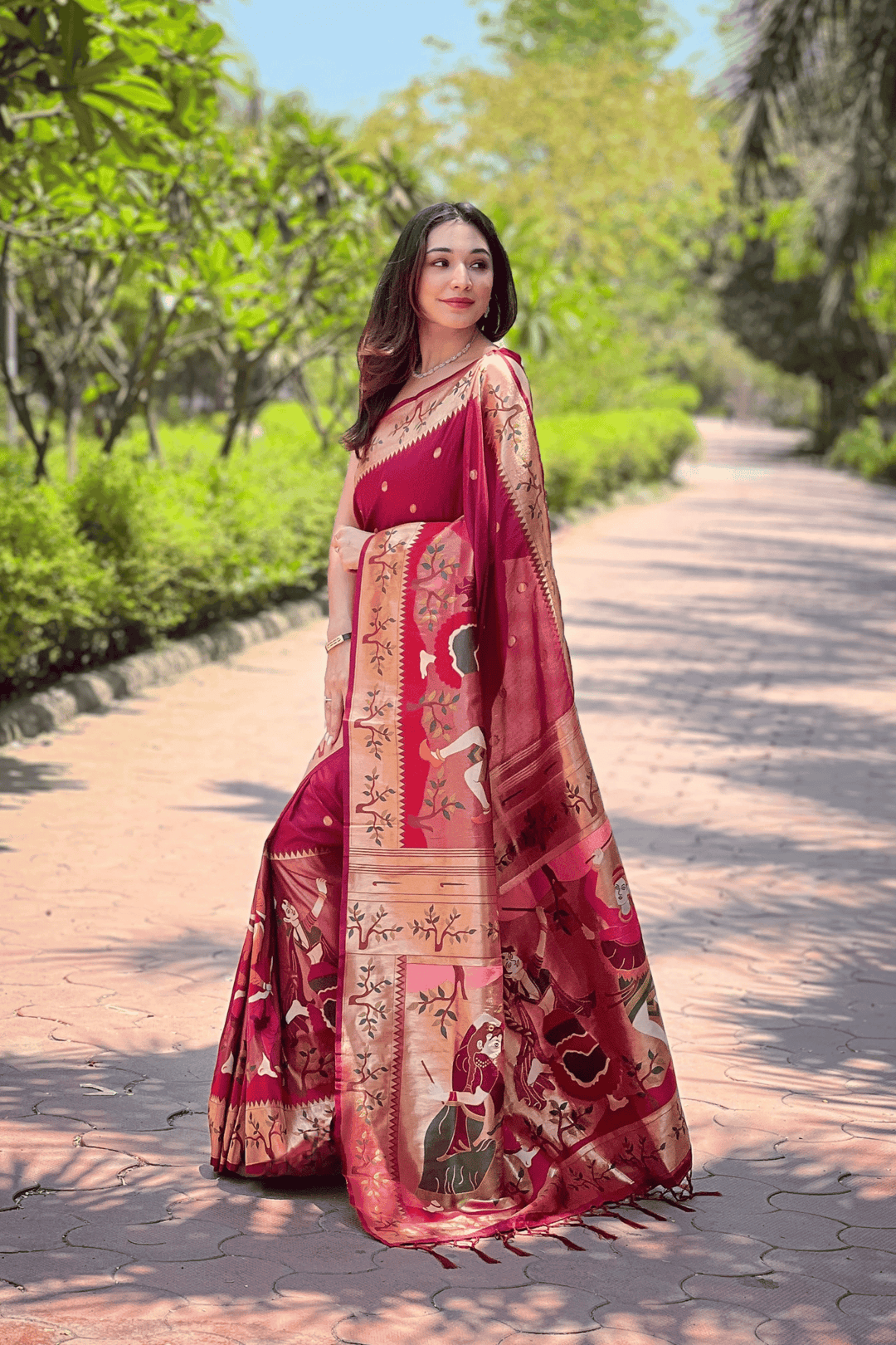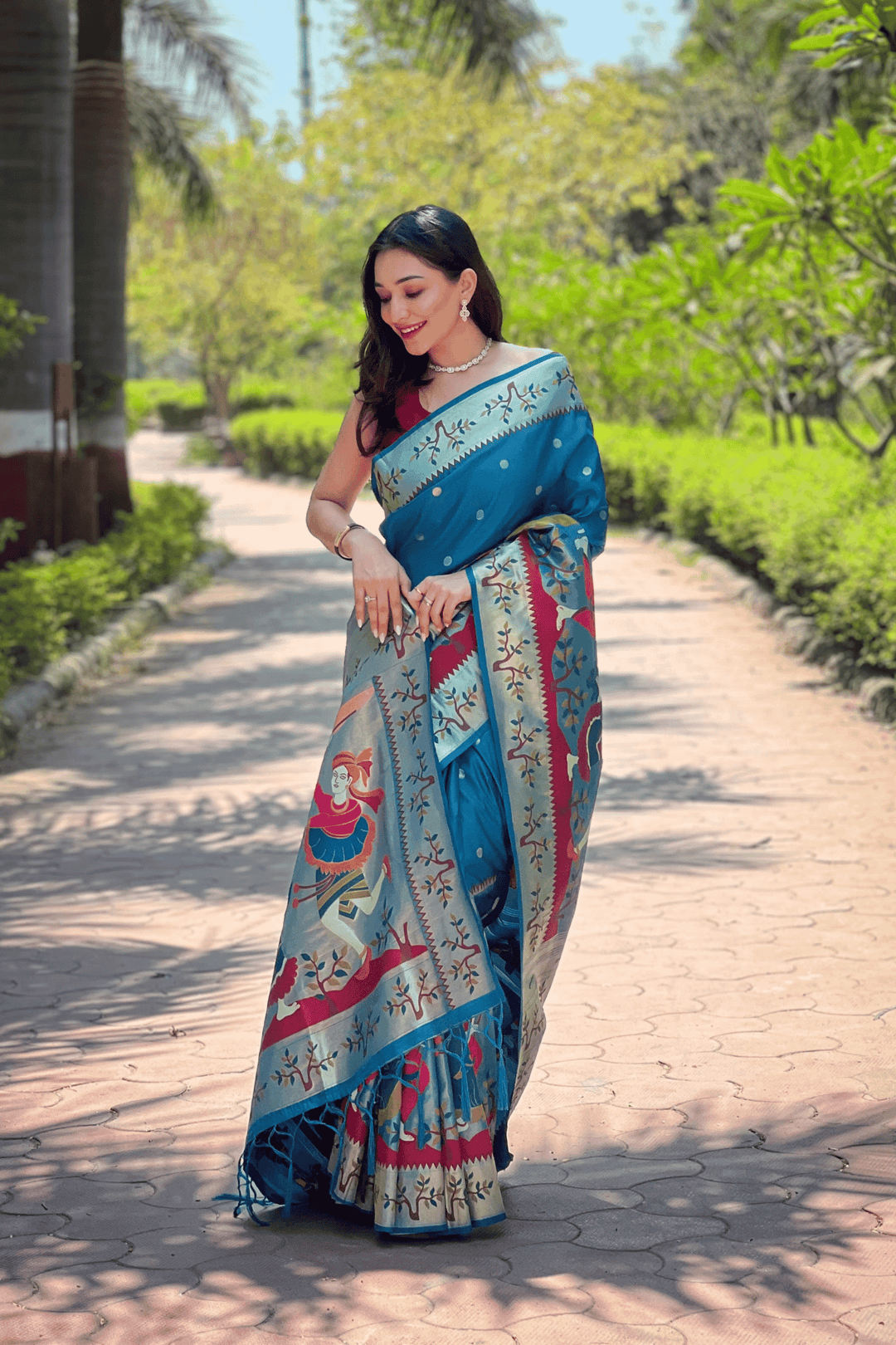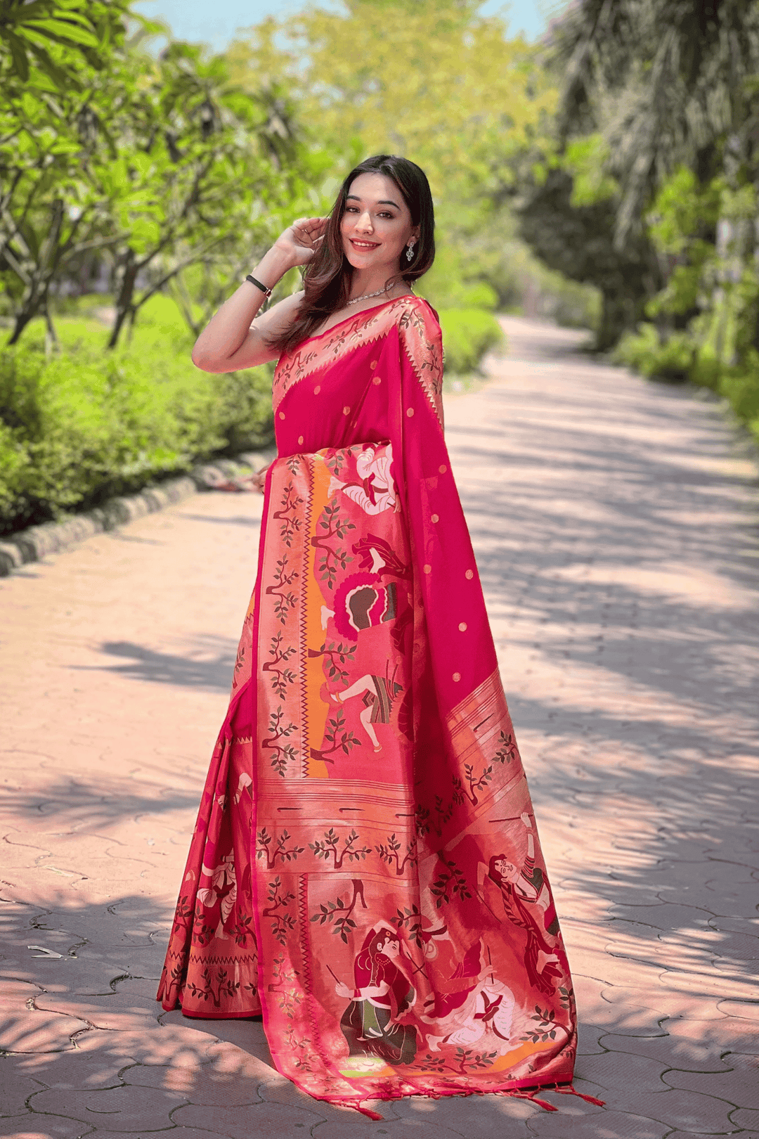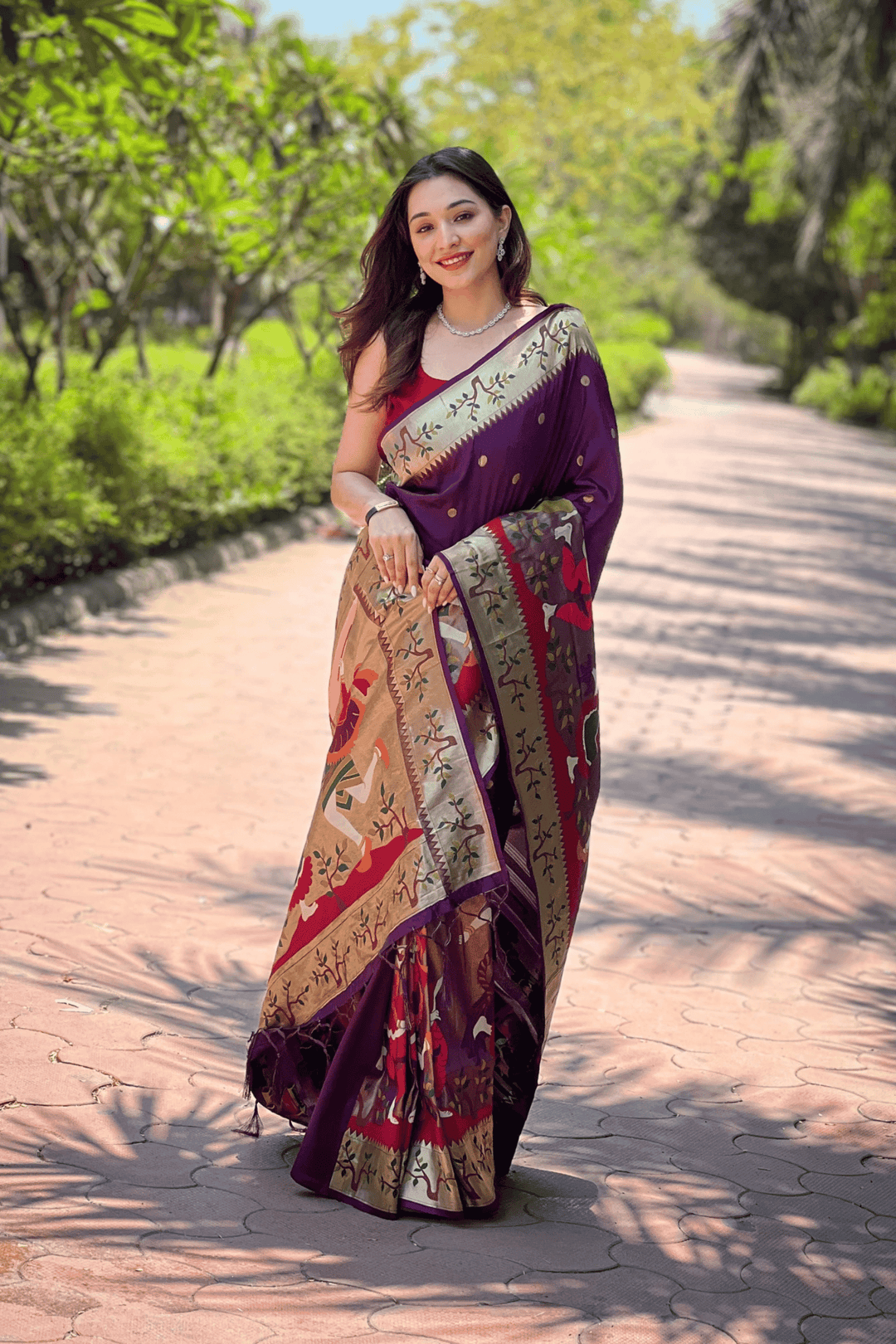 A Ready to Wear Royal Meenakari Paithani Saree with stitched pleats woven with Grand meenakari paithani border.  The soft silk saree comes along with tone-to-tone matching blouse.