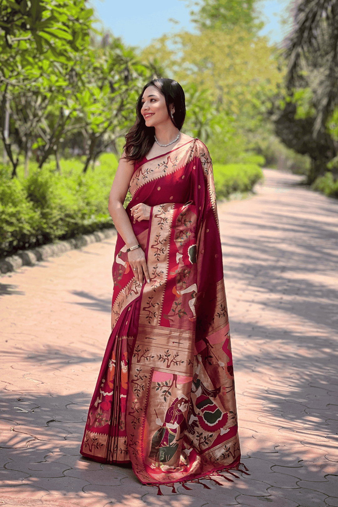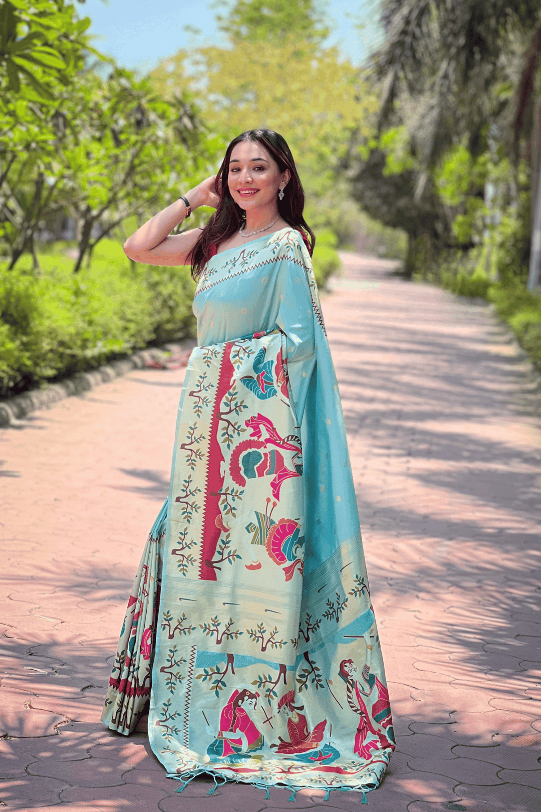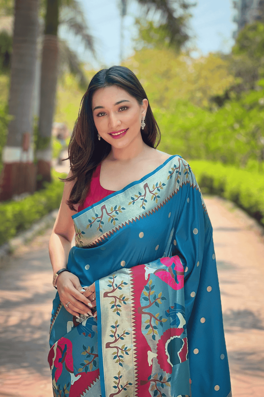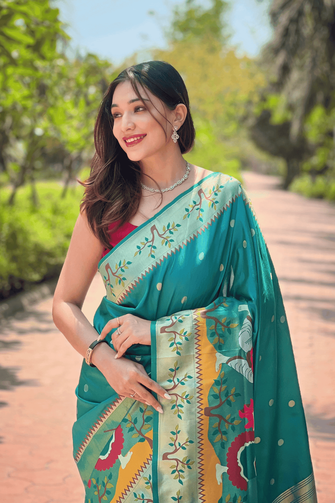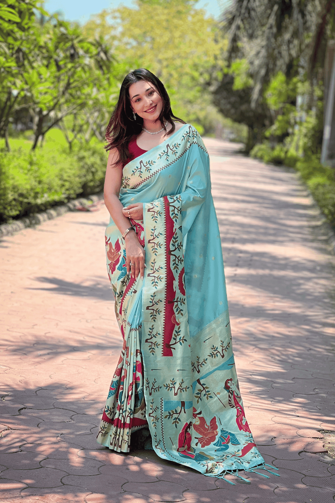 A Ready to Wear Royal Meenakari Paithani Saree with stitched pleats woven with Grand meenakari paithani border.  The soft silk saree comes along with tone-to-tone matching blouse.