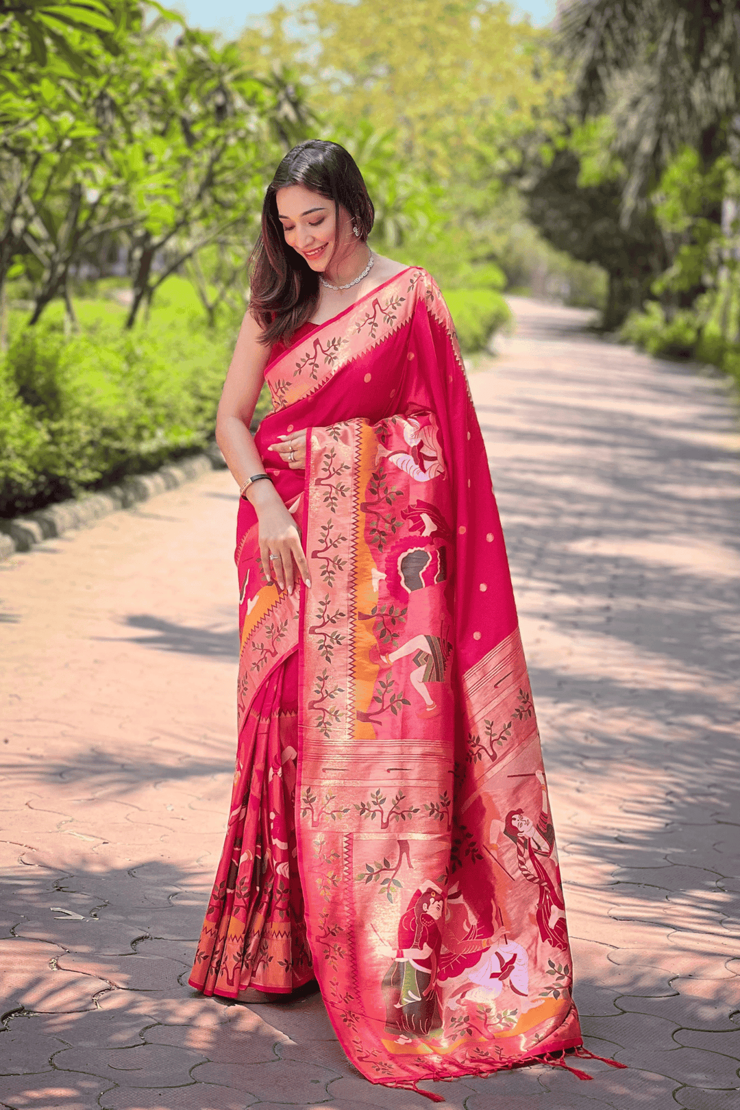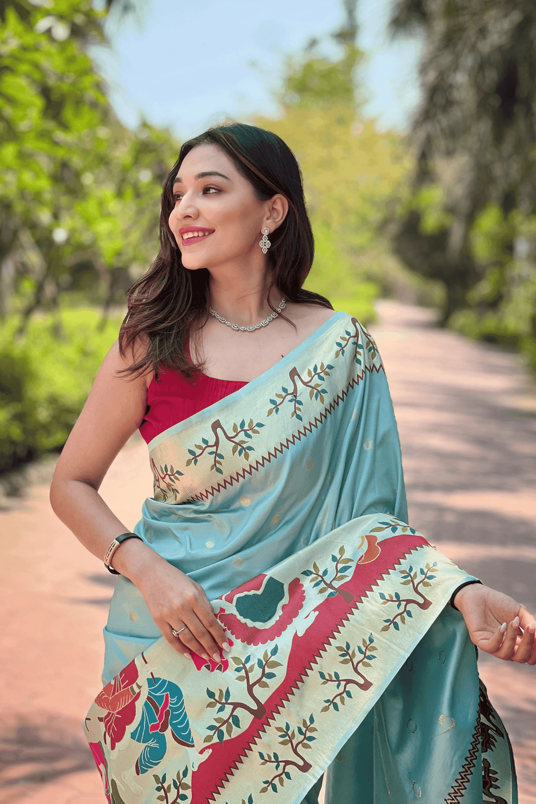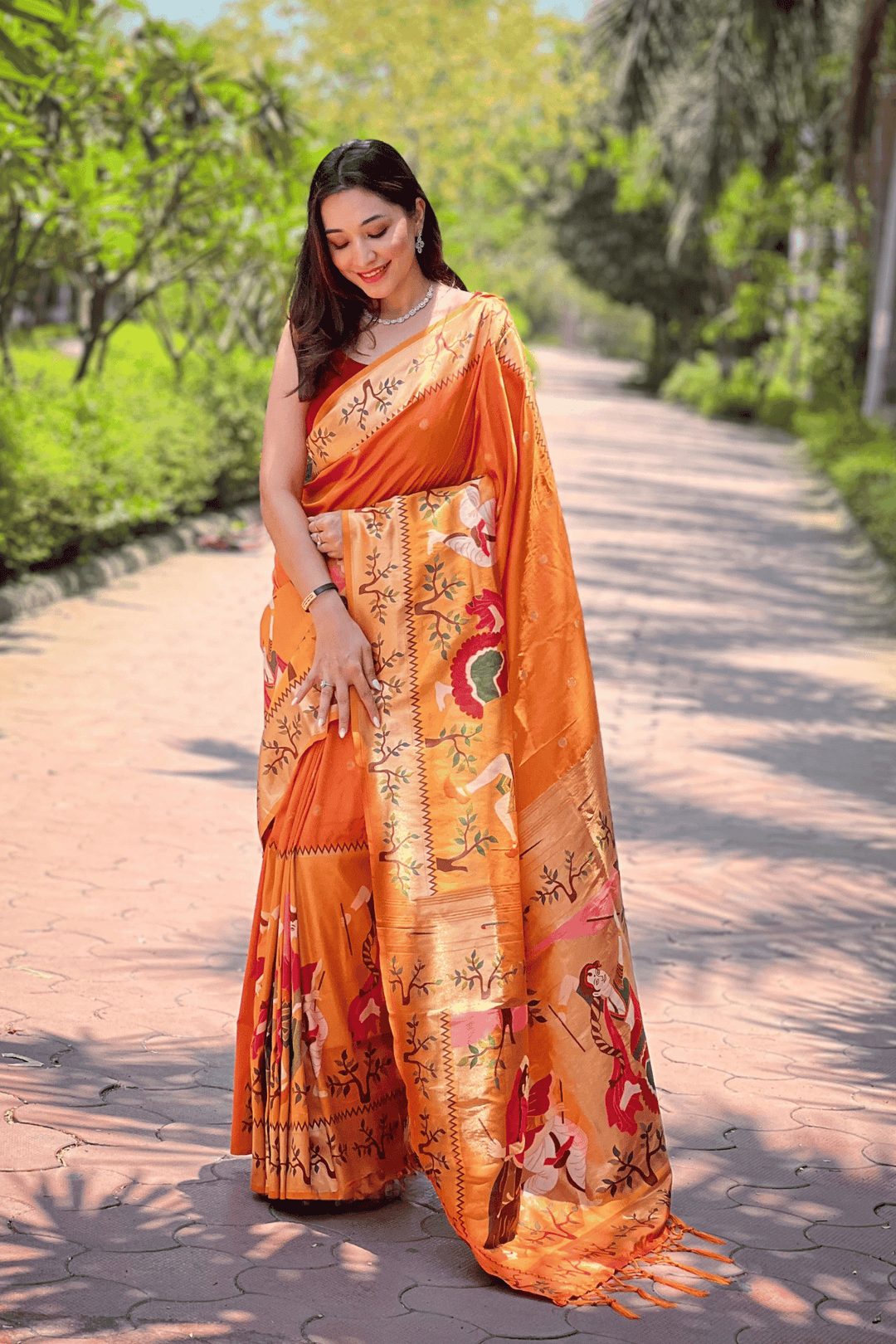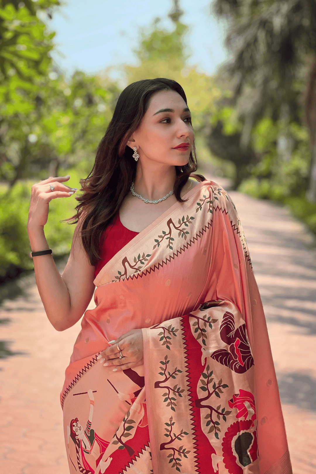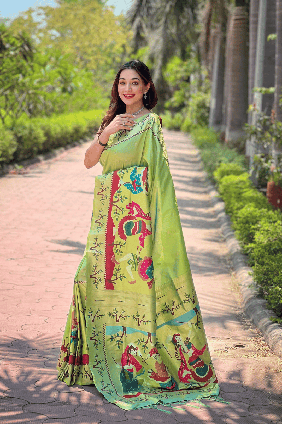 A Ready to Wear Royal Meenakari Paithani Saree with stitched pleats woven with Grand meenakari paithani border.  The soft silk saree comes along with tone-to-tone matching blouse.