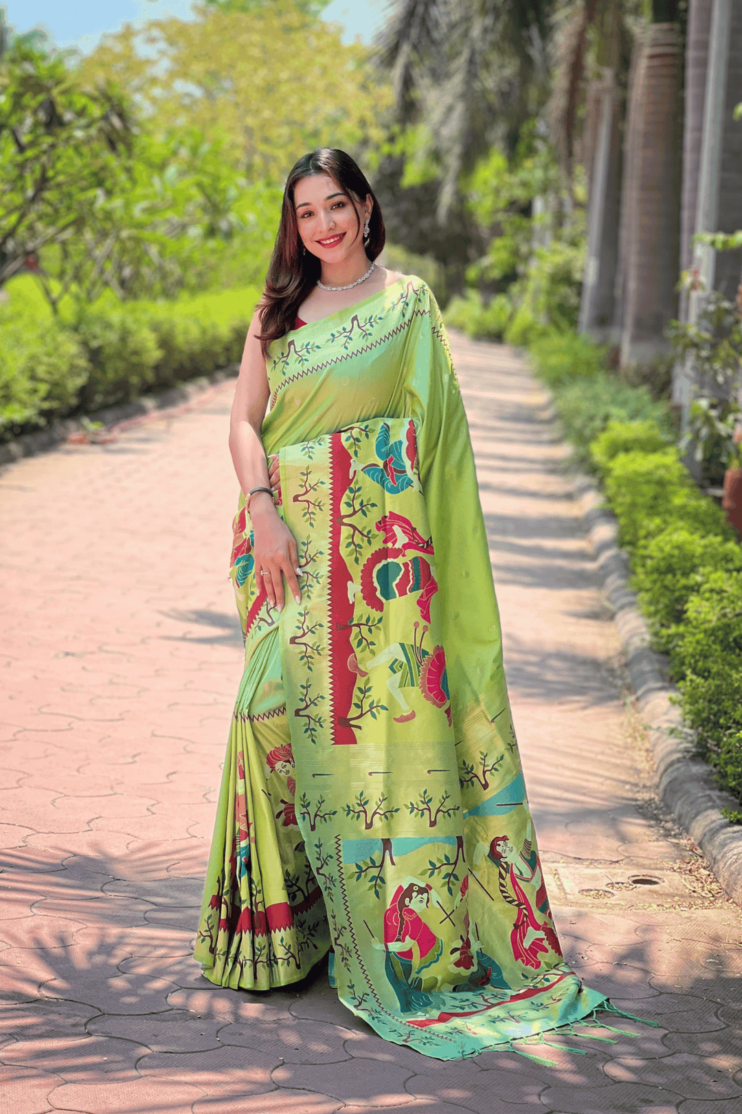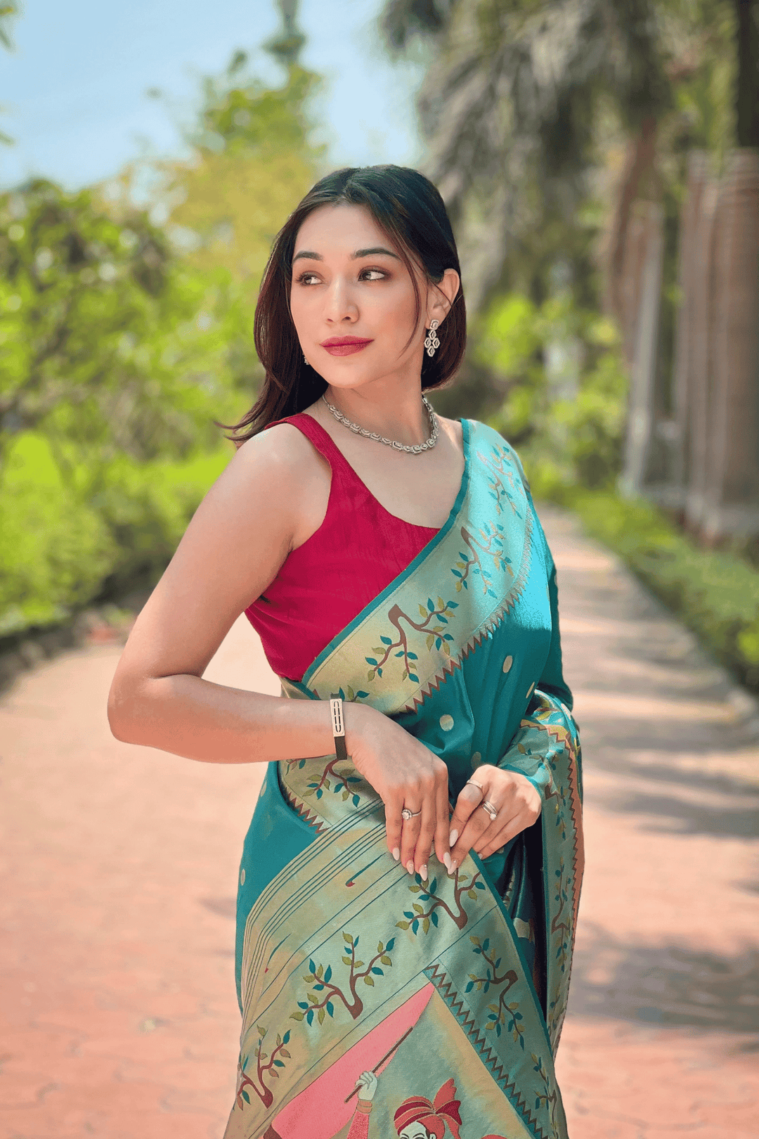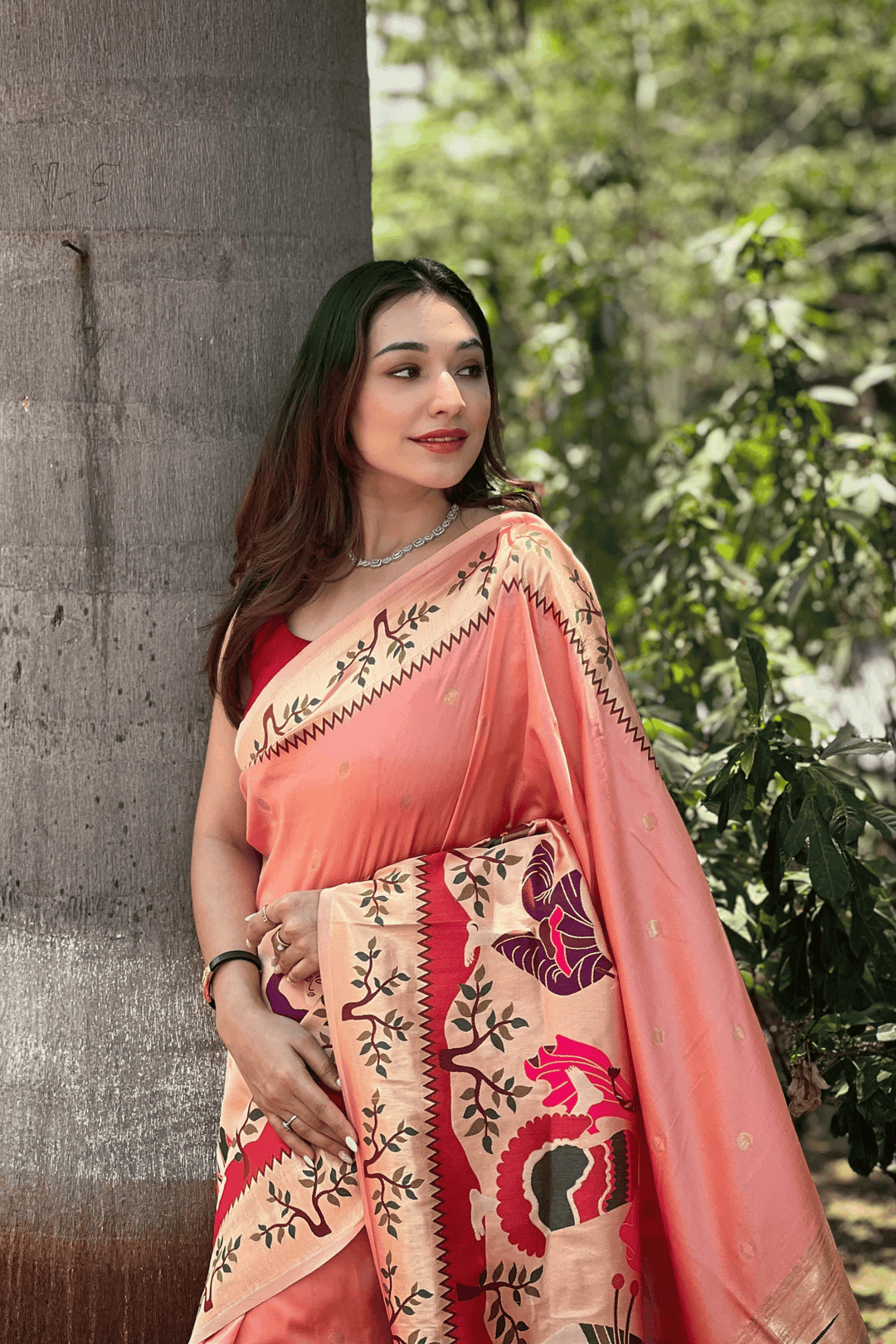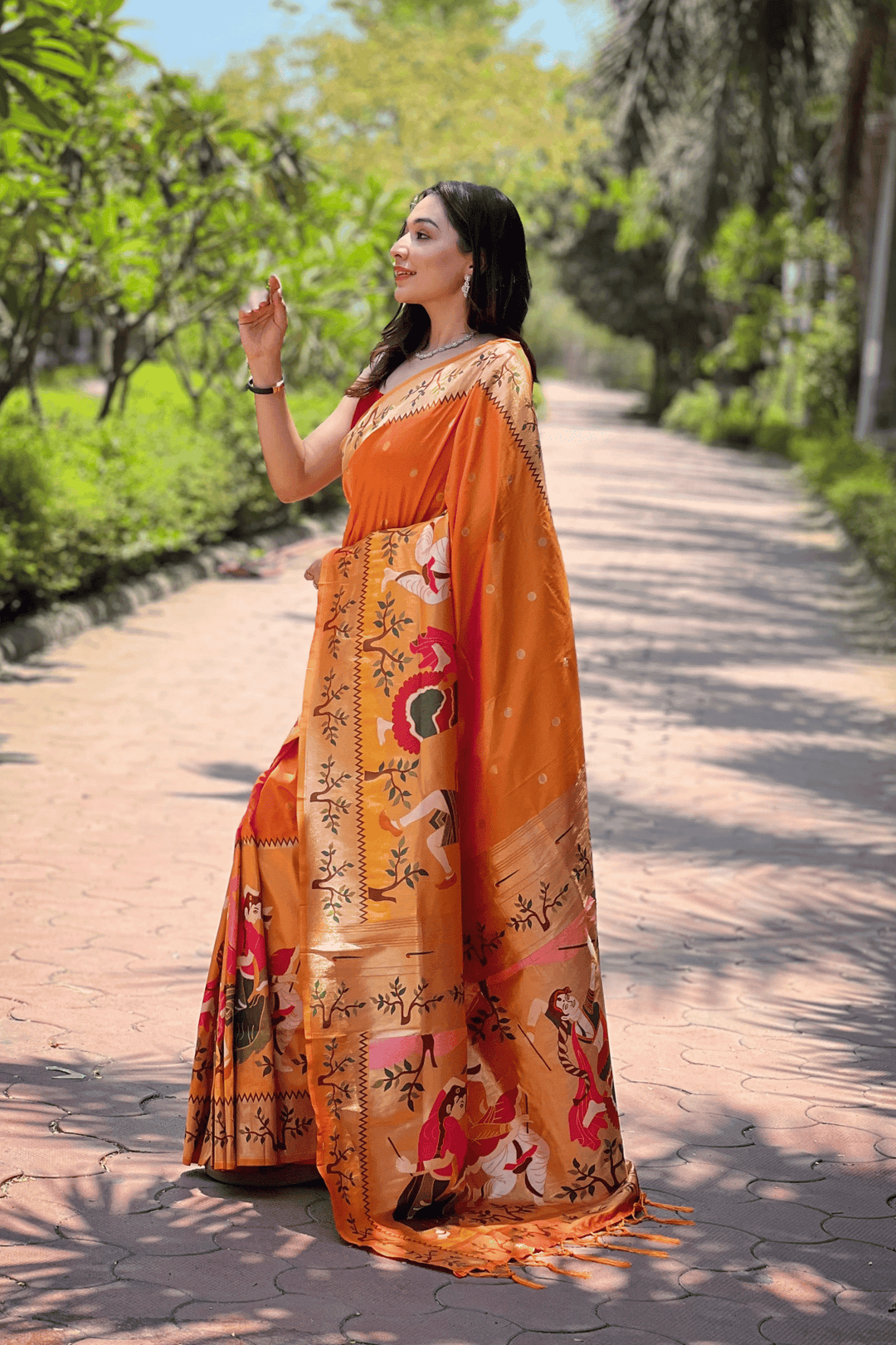 A Ready to Wear Royal Meenakari Paithani Saree with stitched pleats woven with Grand meenakari paithani border.  The soft silk saree comes along with tone-to-tone matching blouse.