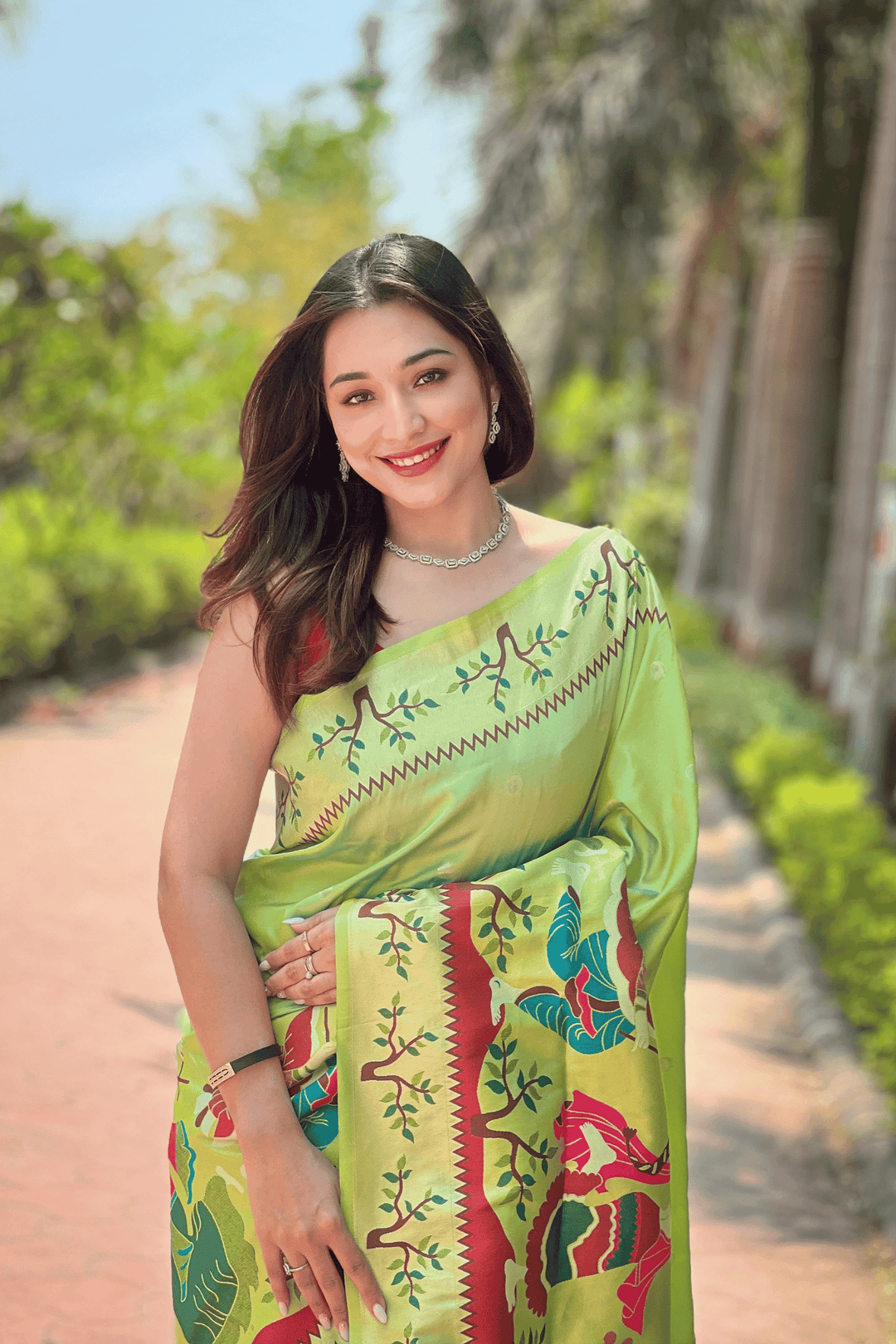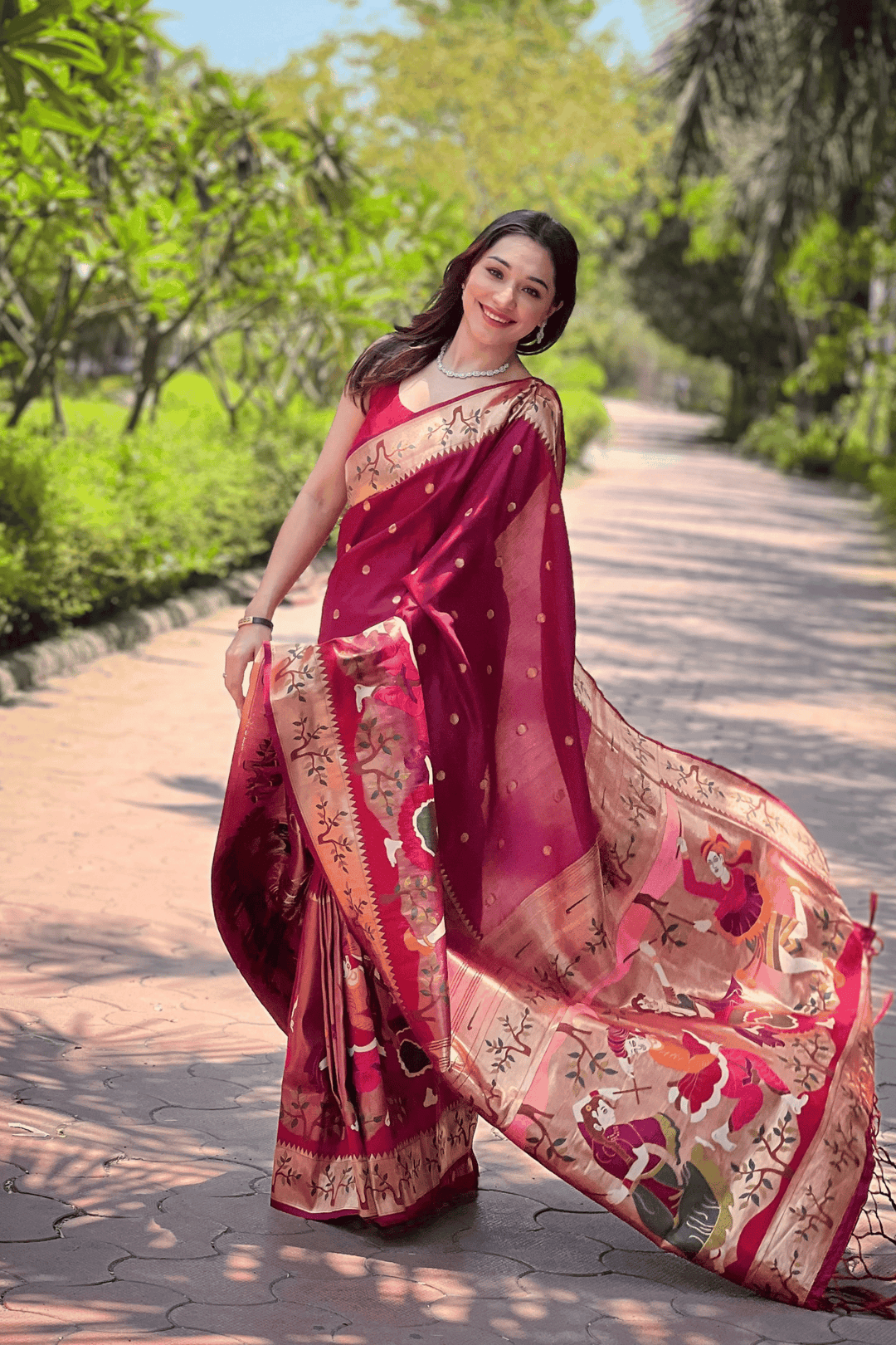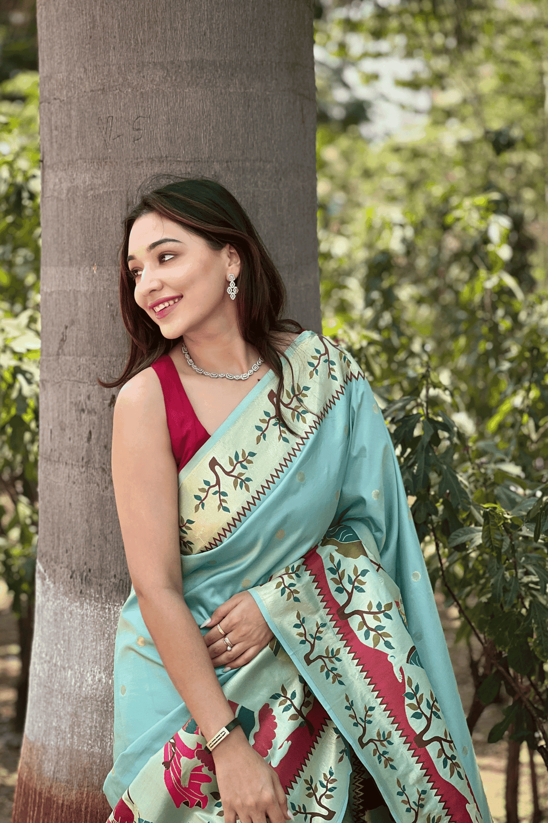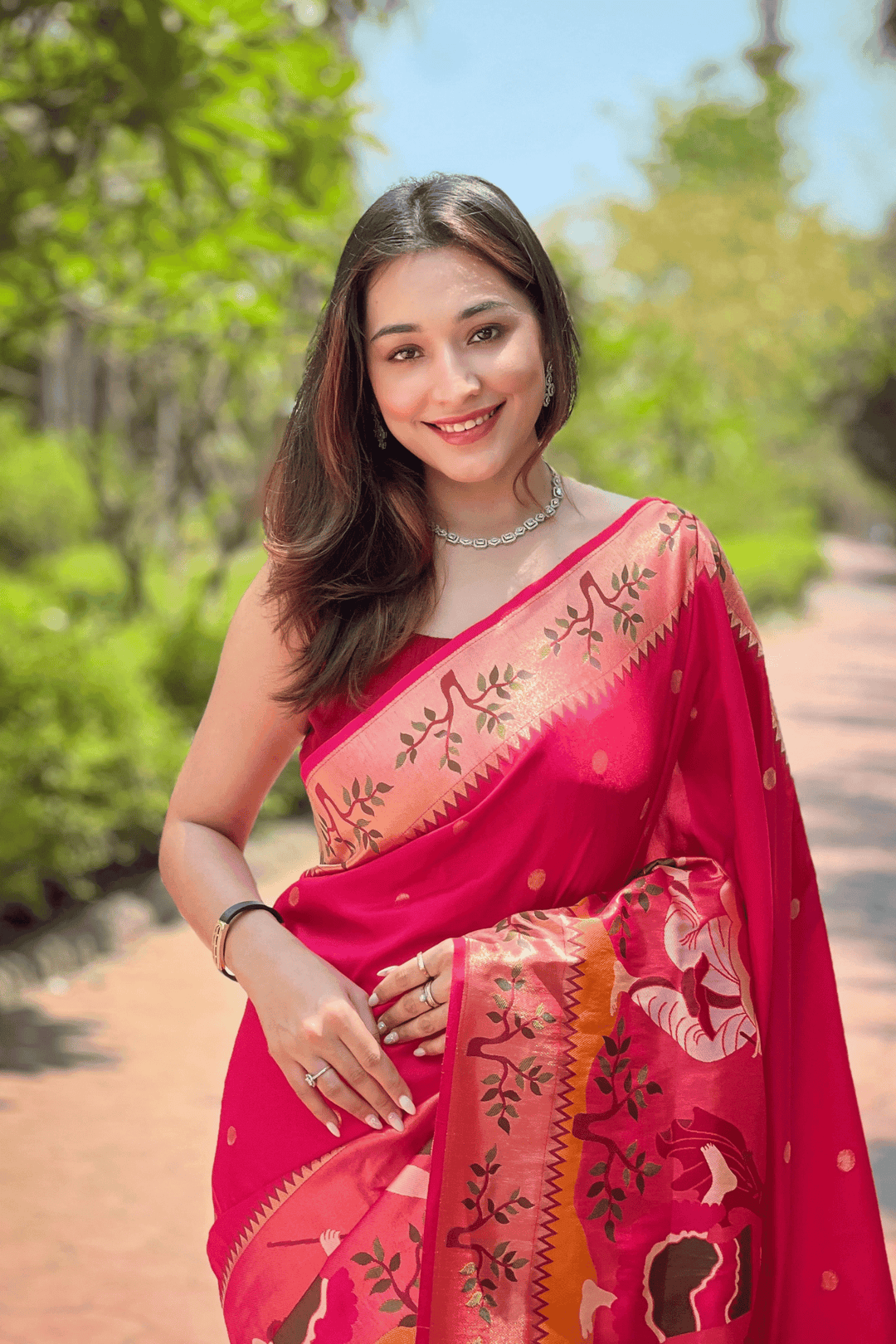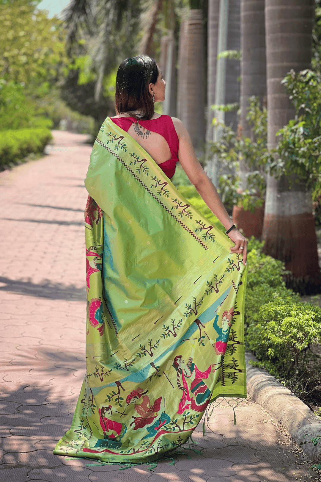 A Ready to Wear Royal Meenakari Paithani Saree with stitched pleats woven with Grand meenakari paithani border.  The soft silk saree comes along with tone-to-tone matching blouse.