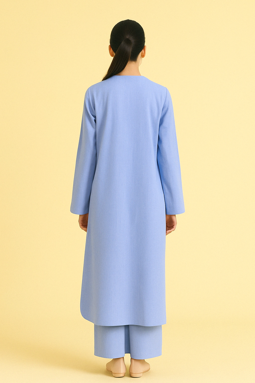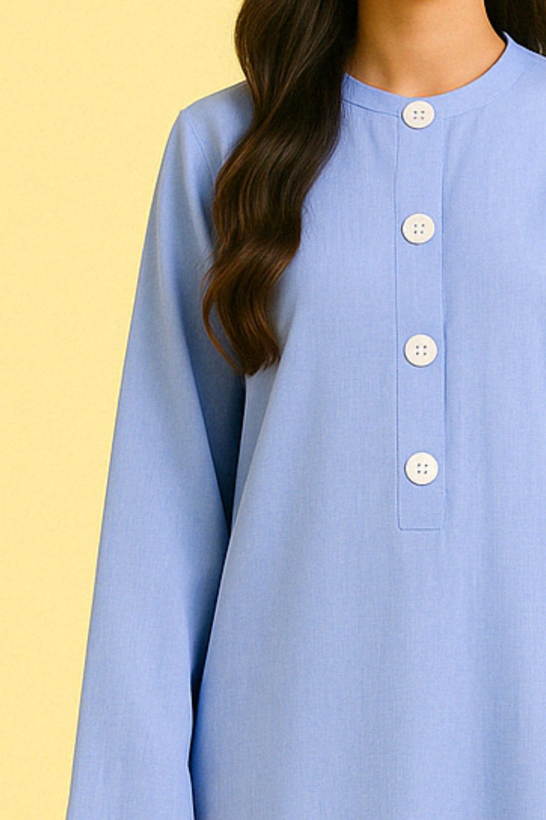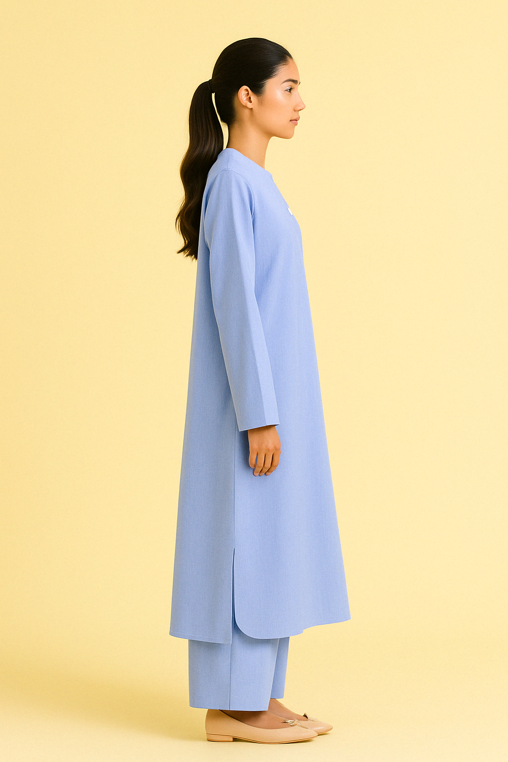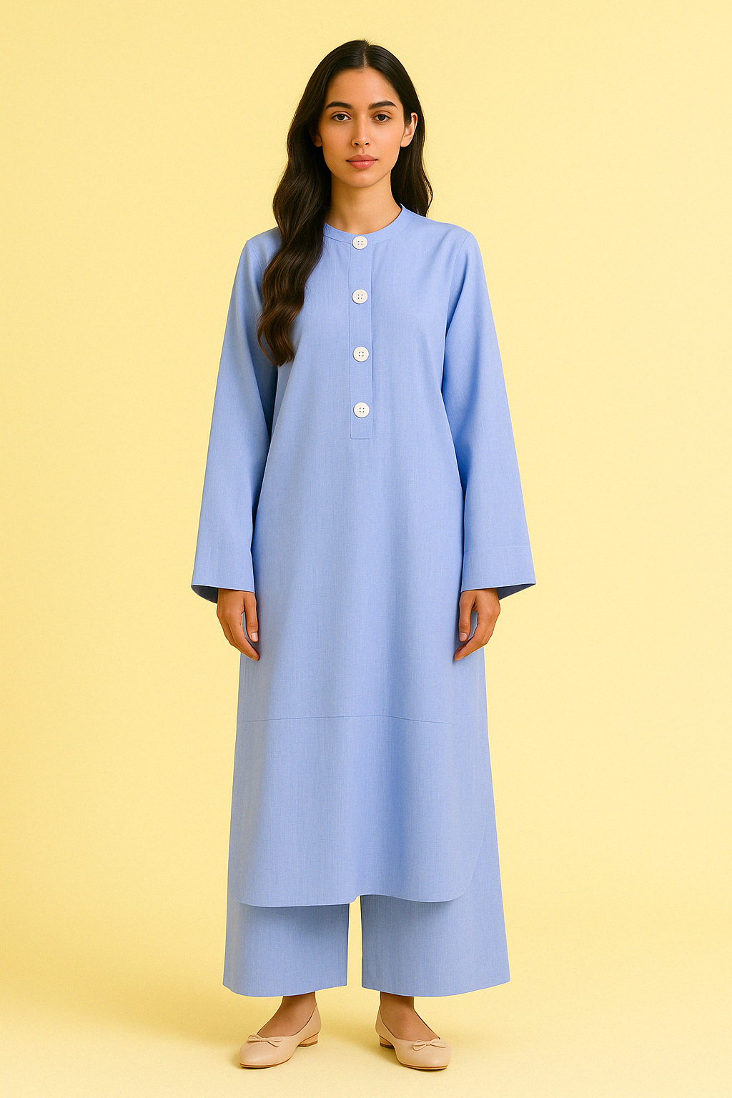 Step into serenity with Azure Breeze, a sky-blue coord set that channels calm sophistication. Designed with a straight-cut kurta featuring bold white buttons and paired with wide-leg bottoms, this ensemble is a breath of fresh air for your everyday wardrobe. Made from lightweight, soft-touch fabric, it offers comfort without compromising on elegance.