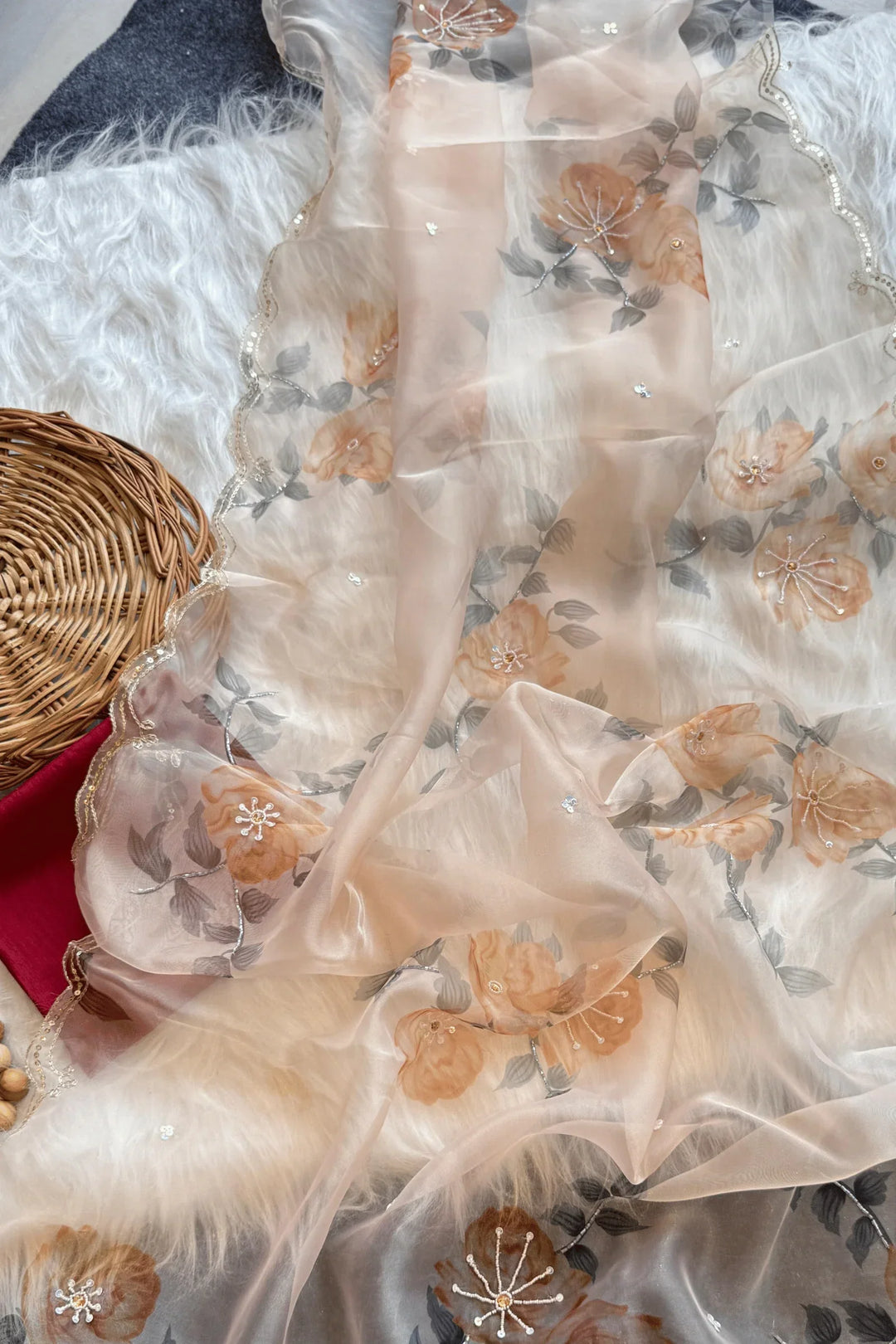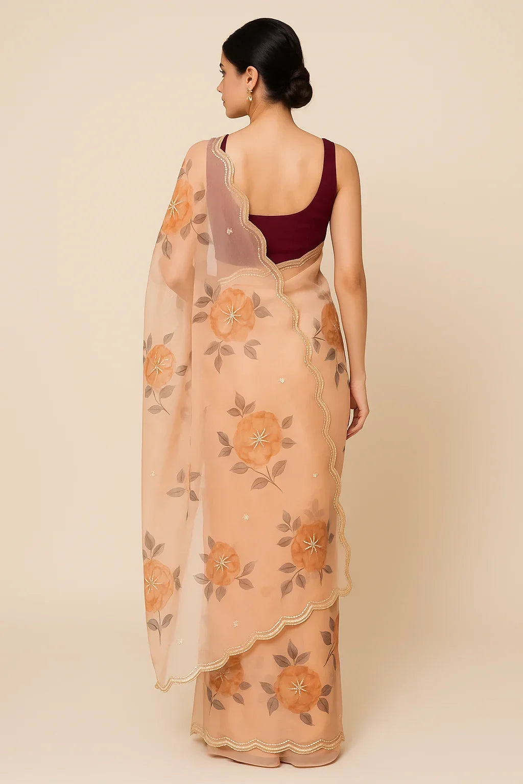 Fleur Dusk captures the soft serenity of sunset in a dreamy peach palette. Crafted in sheer organza, this ready-to-wear saree features hand-embroidered floral motifs and a delicately scalloped golden border—adding just the right touch of shimmer and romance.