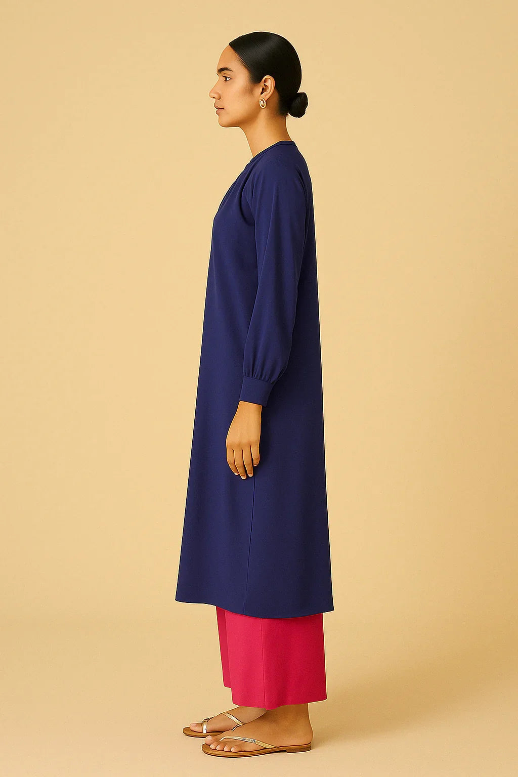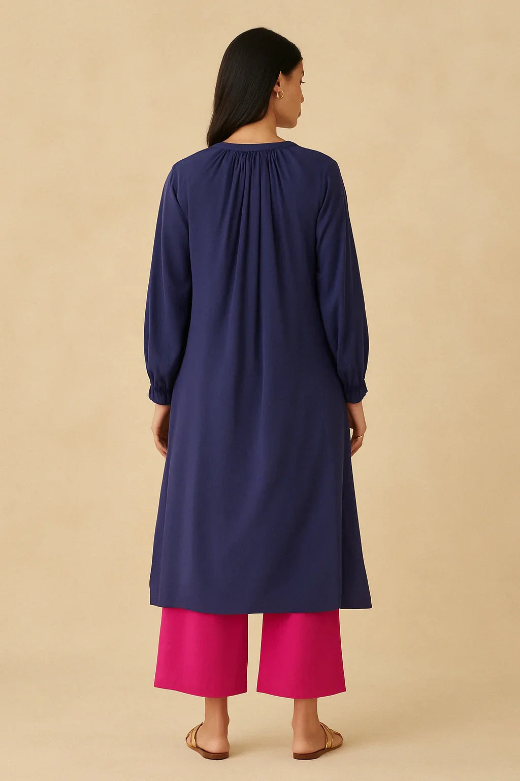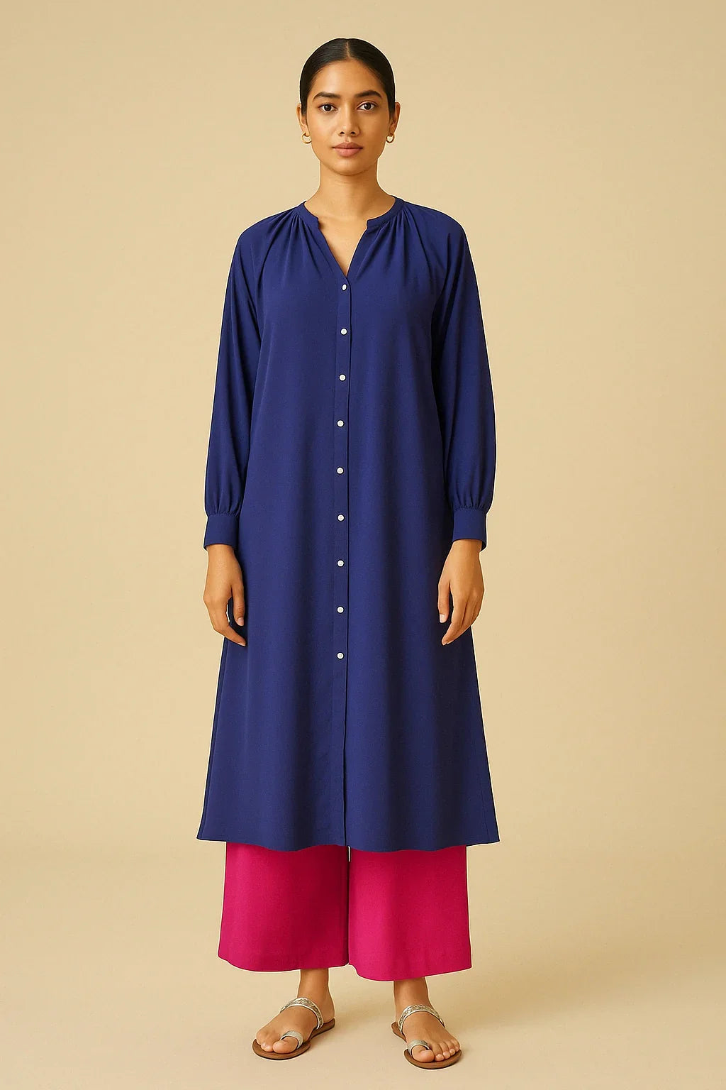 Bold contrast, effortless charm. Midnight Blush brings together a structured navy button-down kurta with flowy magenta palazzos for a look that’s both refined and refreshingly playful. The kurta features gathered detailing at the neckline, full sleeves, and delicate button accents—perfect for a touch of elegance in everyday dressing.