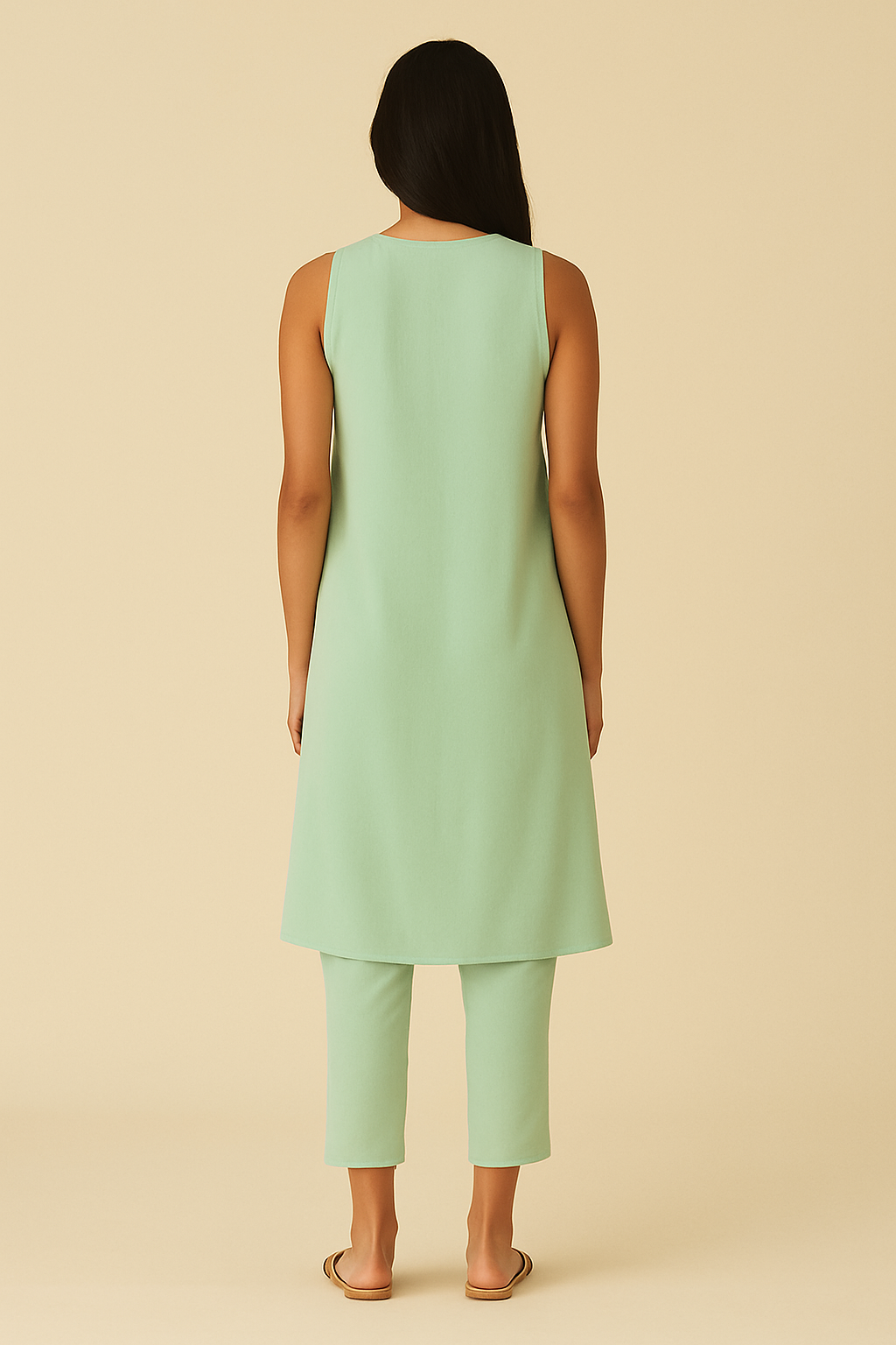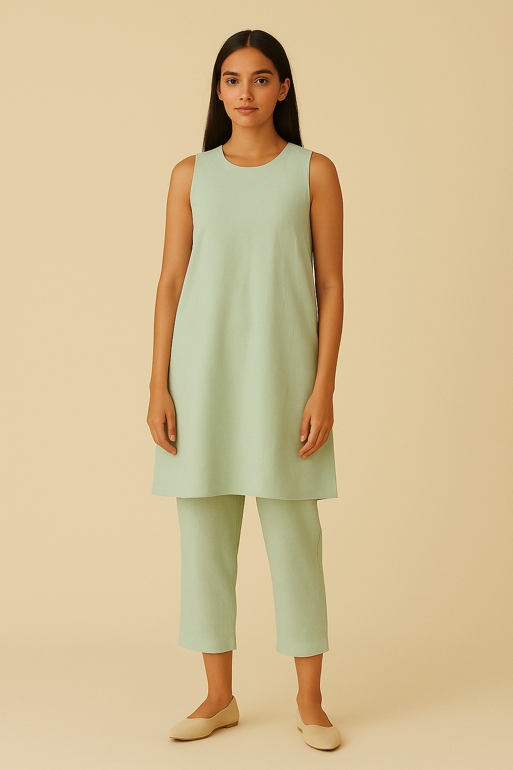 Step into subtle sophistication with Mint Meadow—a pastel-hued coord set designed for calm, collected days. Featuring a sleeveless tunic and tailored cropped pants, this set blends effortless charm with everyday functionality. The mint green tone adds a touch of nature-inspired freshness, perfect for warmer days and mindful dressing.