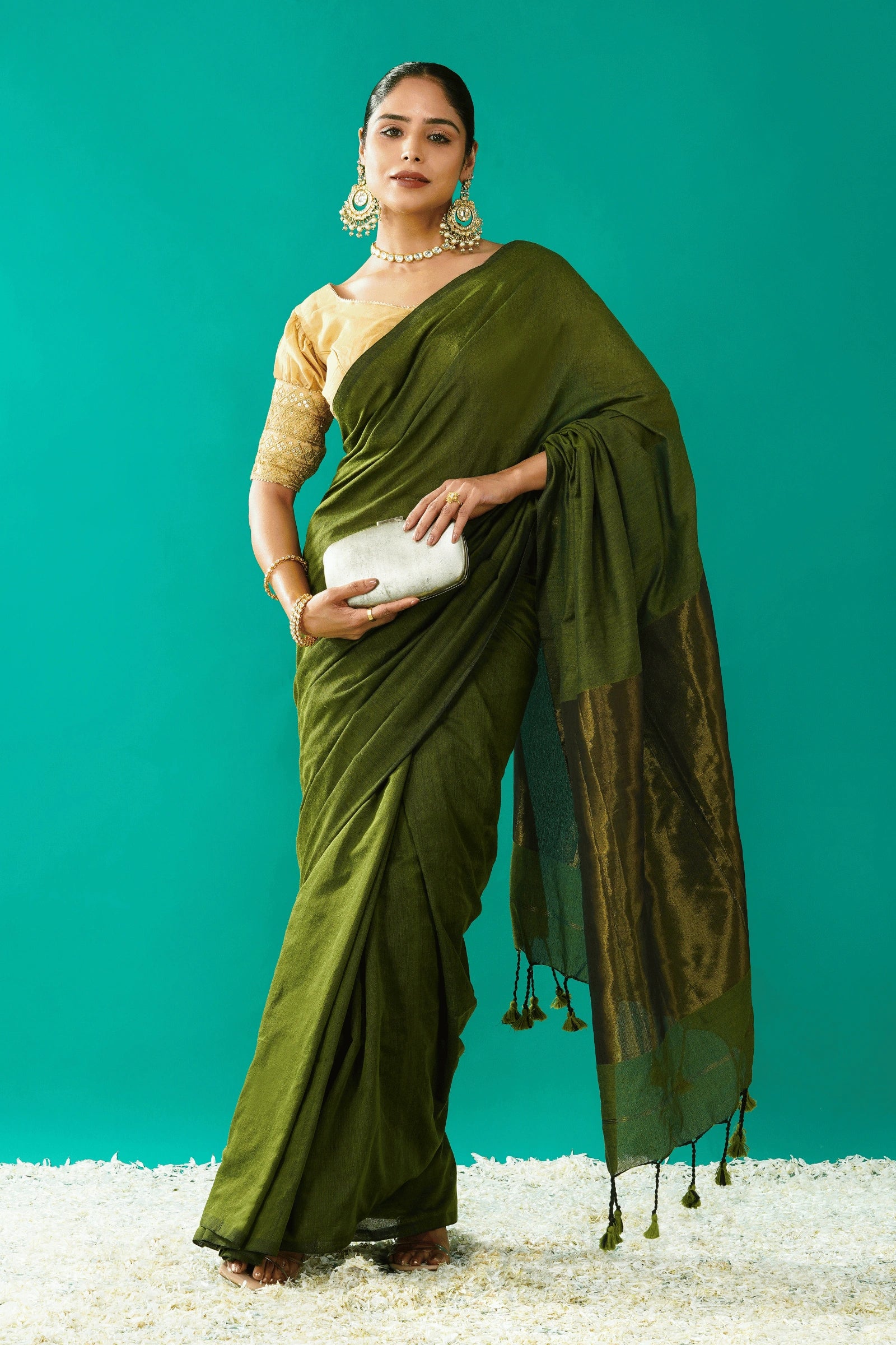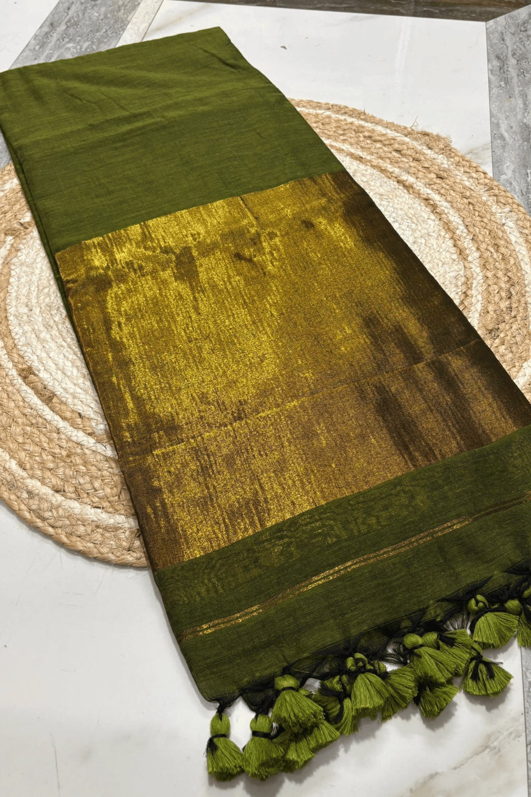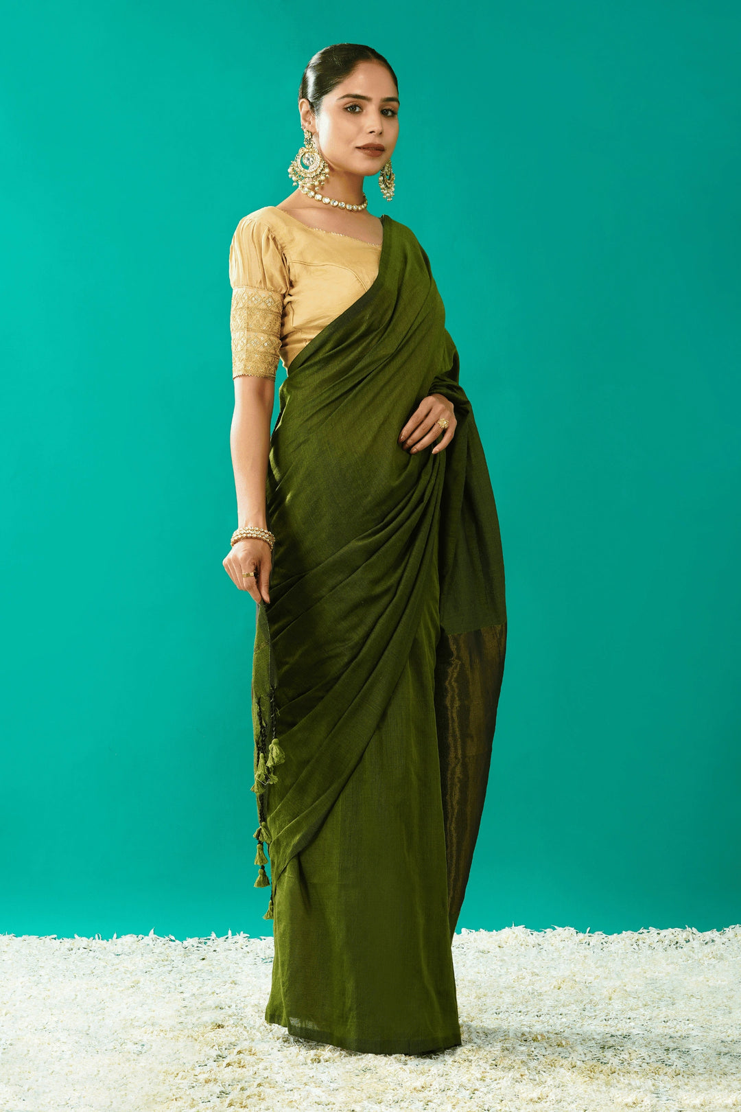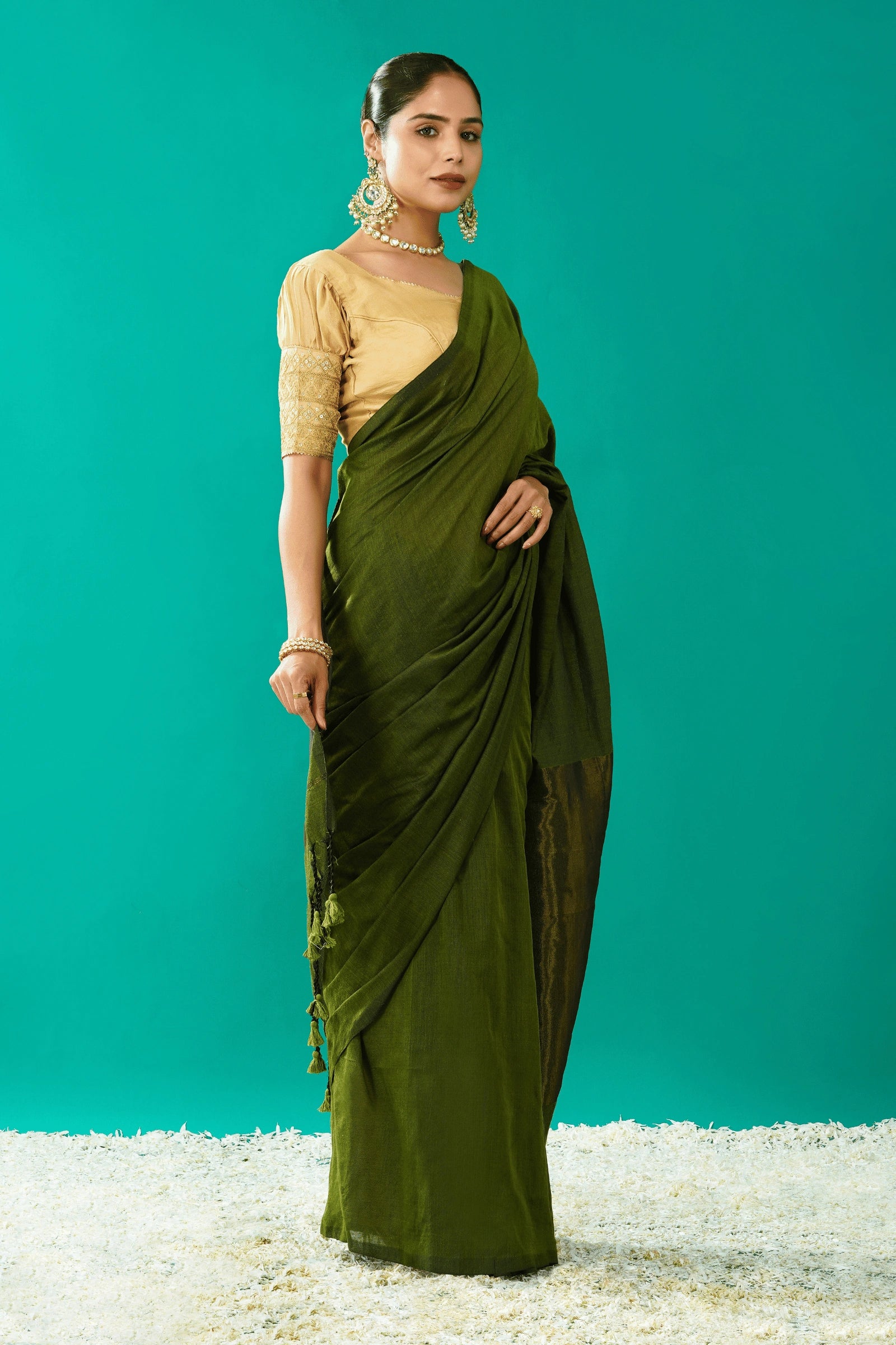 Radiance and confidence in this Green Mul Cotton Saree, enhanced with playful green tassels for that extra pop of personality. Crafted in soft, breathable mul cotton, this saree is designed to keep you cool and stylish all day long.