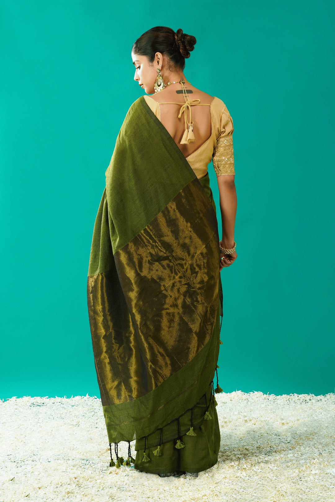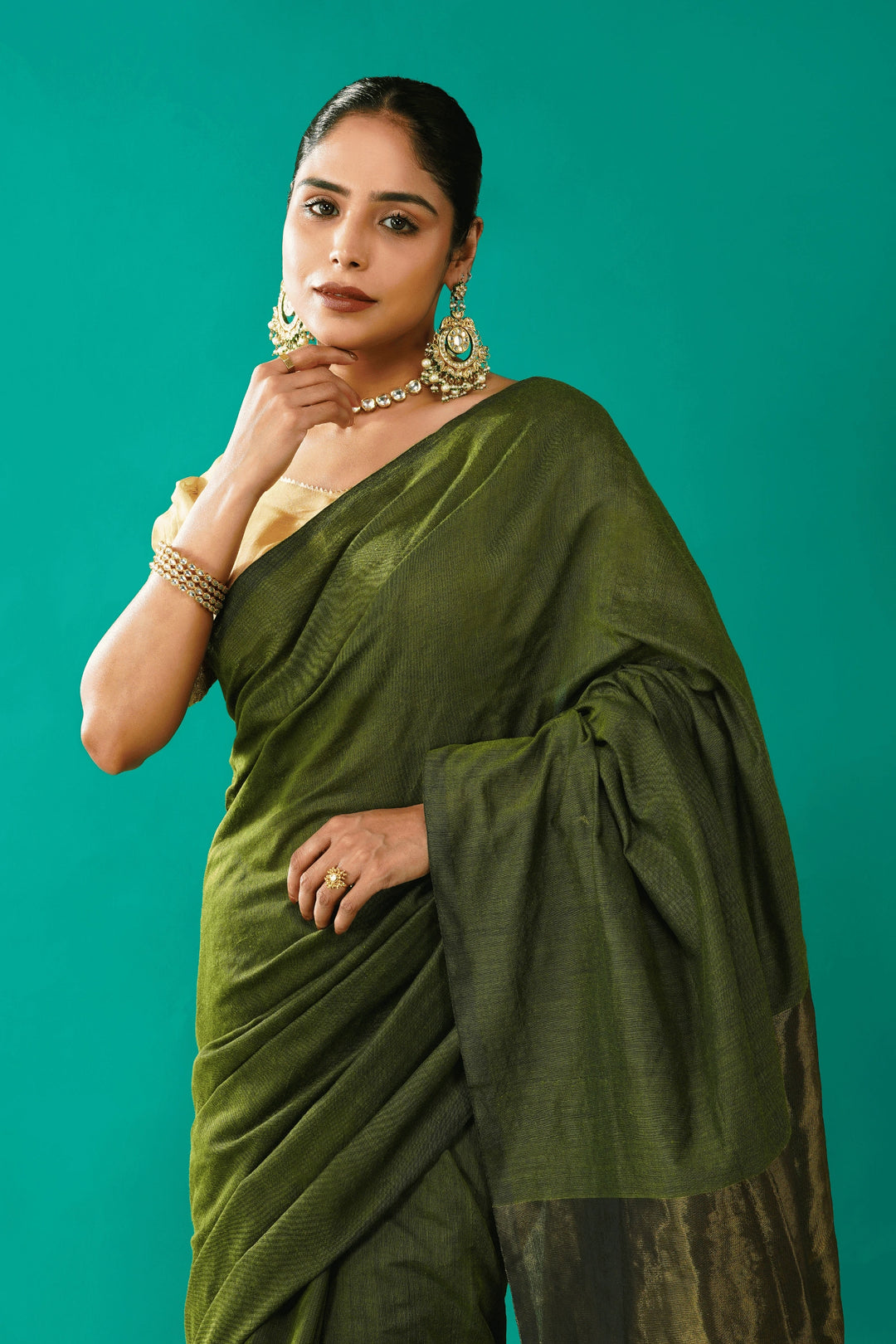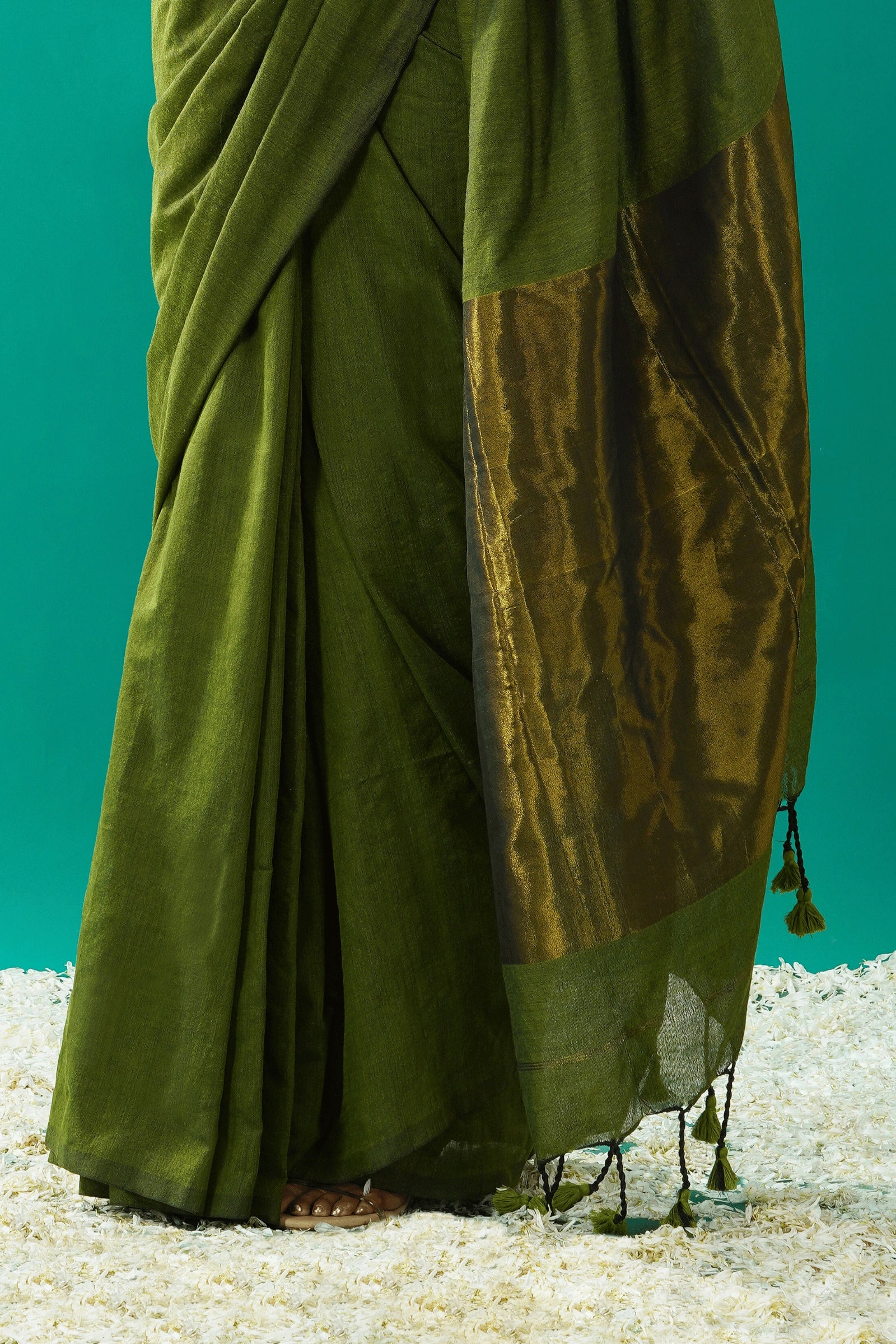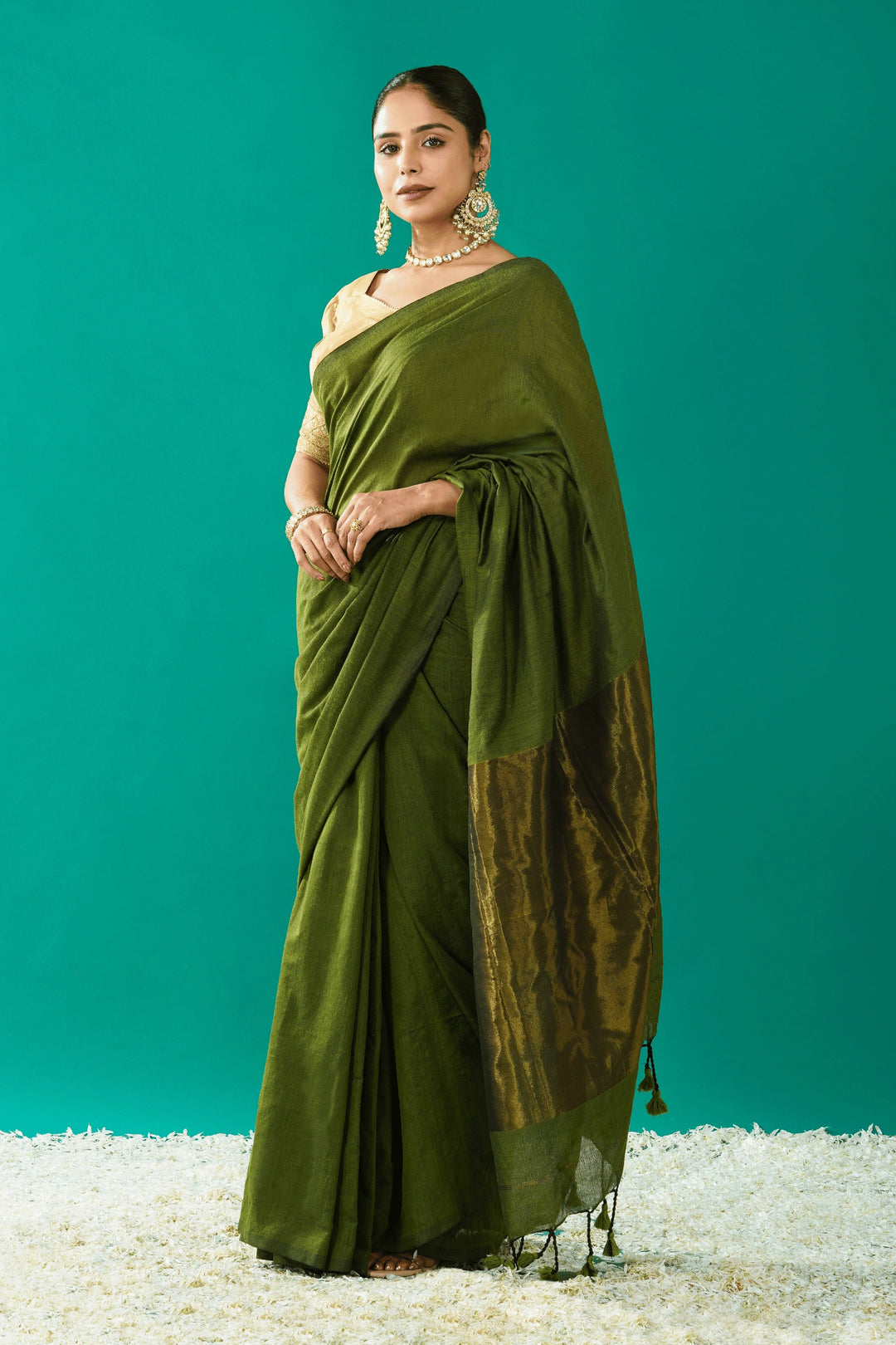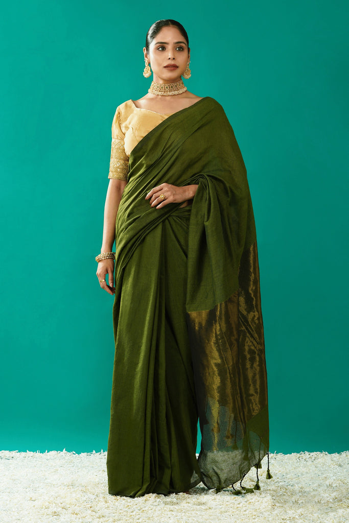 Radiance and confidence in this Green Mul Cotton Saree, enhanced with playful green tassels for that extra pop of personality. Crafted in soft, breathable mul cotton, this saree is designed to keep you cool and stylish all day long.