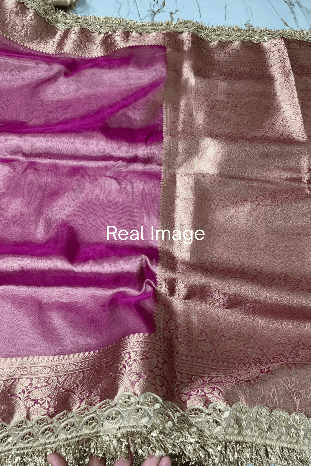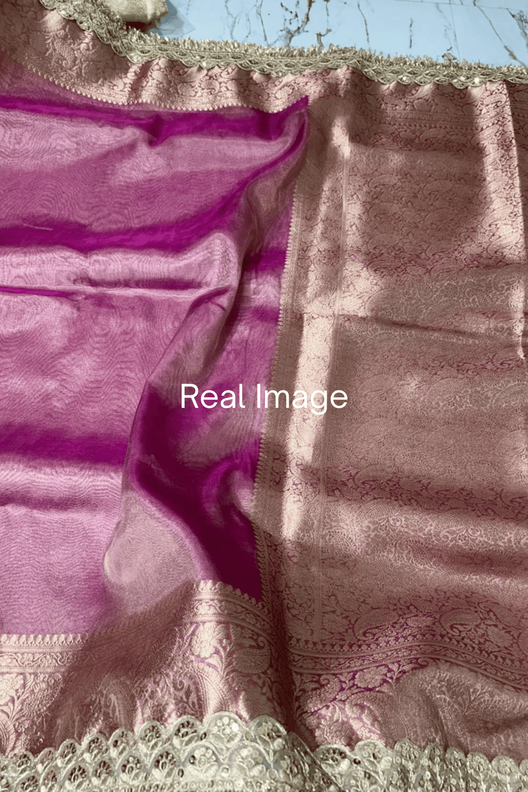 This Tissue Banarasi saree comes with stitched pleats, and is adjustable upto 5 XL.