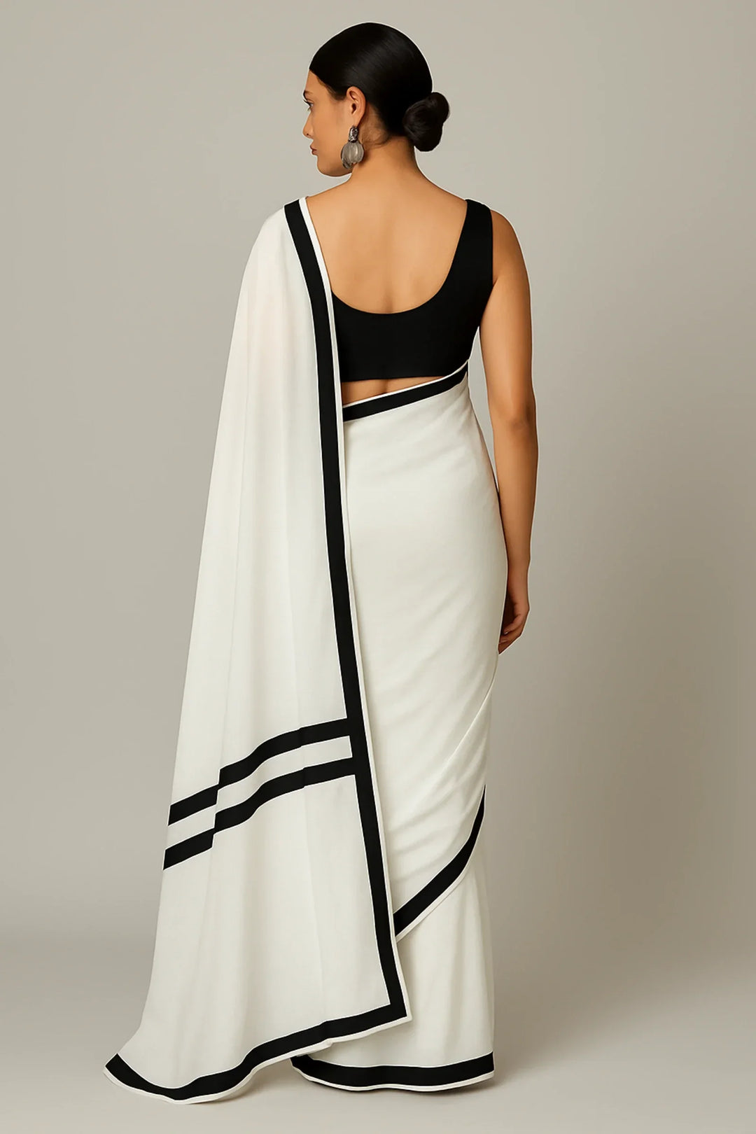 Designed for the woman who walks with quiet power, this monochrome drape blends minimalism with confidence. Its pre-stitched silhouette ensures effortless elegance in seconds, whether you're heading to a formal event, festive gathering, or just owning your day.