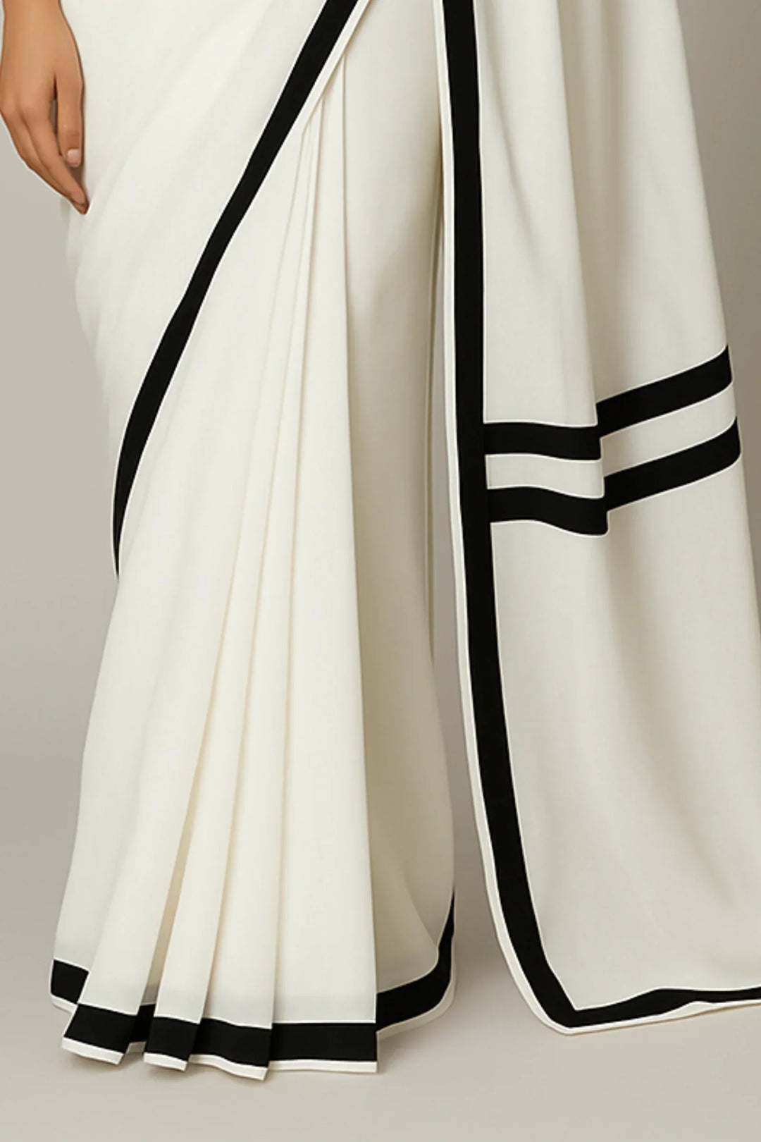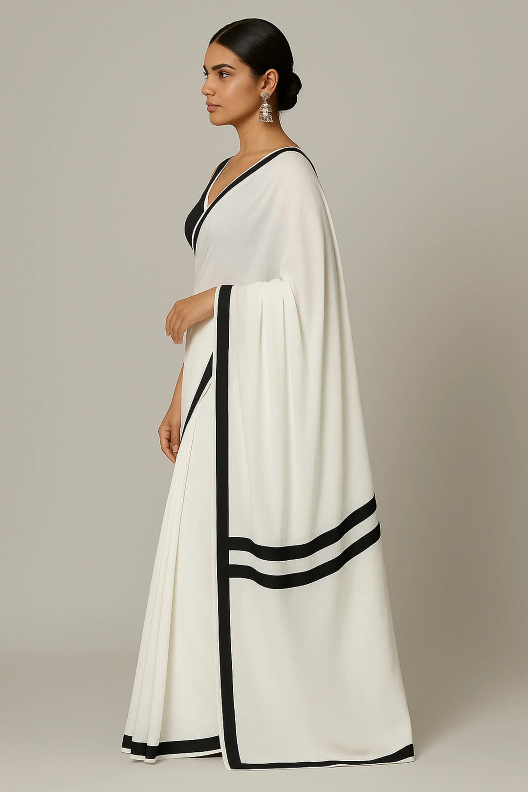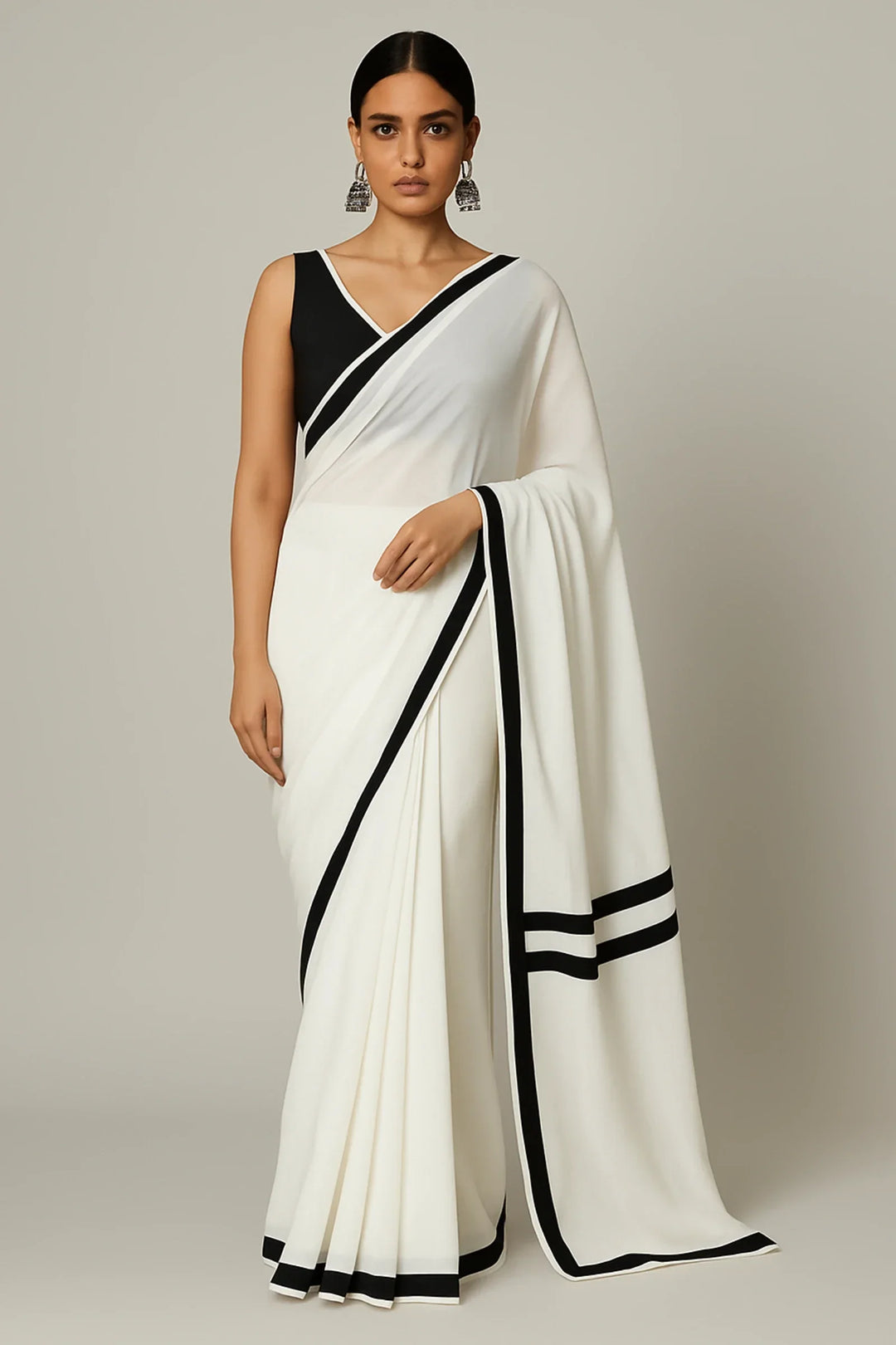 Make a statement without saying a word. Bold & Bound is a striking ready-to-wear saree in breezy white georgette, elevated with a rich black satin stripe border — echoing the timeless grace of Alia Bhatt’s contrast saree looks.