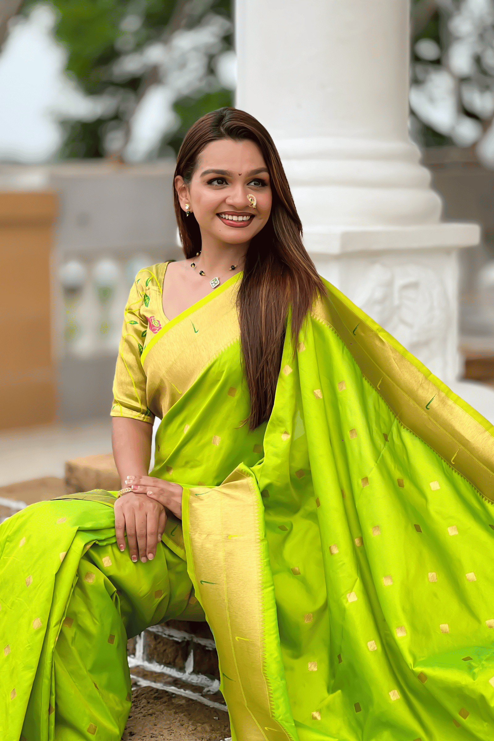 Step into royalty with Paithani Reign — a majestic celebration of Maharashtra’s timeless weaving legacy, reimagined for the modern woman. Crafted in luxurious Paithani silk and adorned with iconic zari motifs, this saree embodies regal grace with effortless wearability.